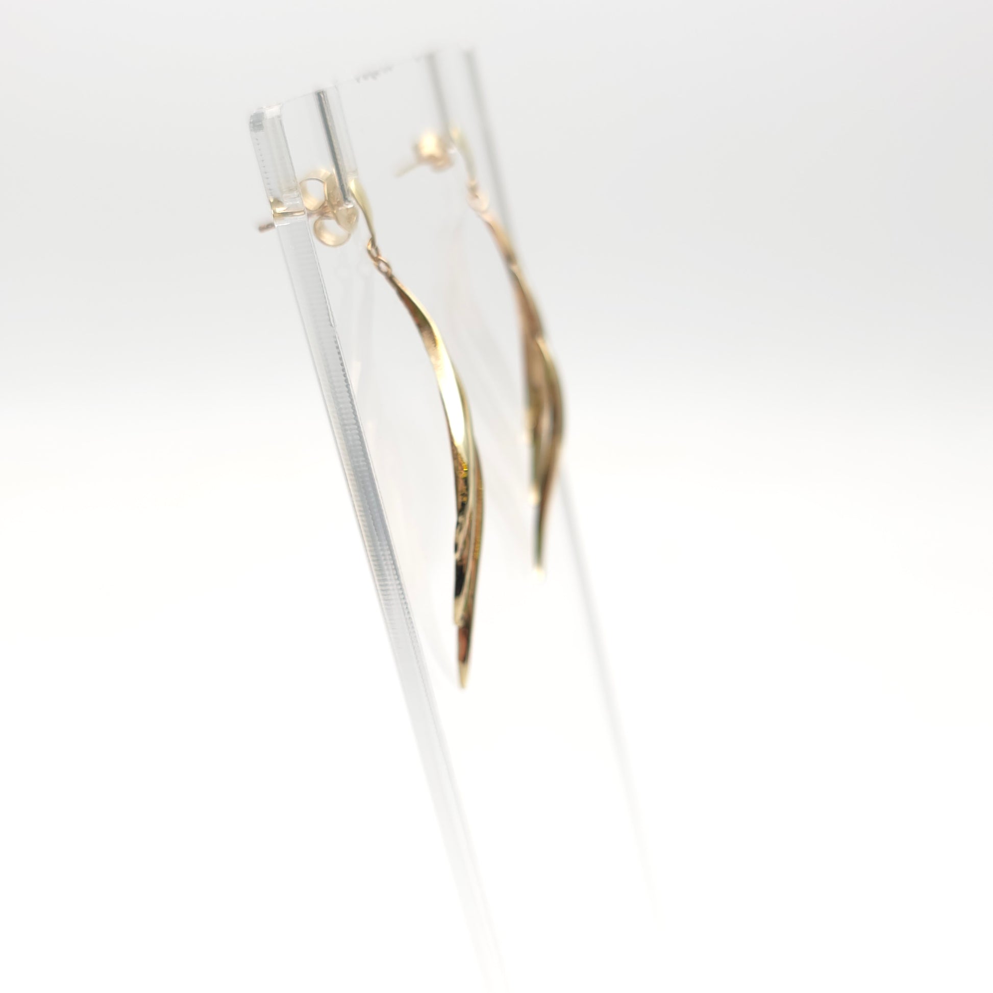 The setting and posts are constructed from durable 9-carat yellow gold. They are designed as a drop earring, securing with a sturdy post and butterfly, allowing them to hang beautifully and maximize their dramatic length. This style is often associated with the glamour of the 1970s or 1980s, offering a fabulous retro appeal. These earrings are an excellent choice for those who love bold, long drop earrings, appreciate dynamic, sculptural design, and seek a luxurious piece of gold jewellery guaranteed to turn heads at any evening event or gathering.
