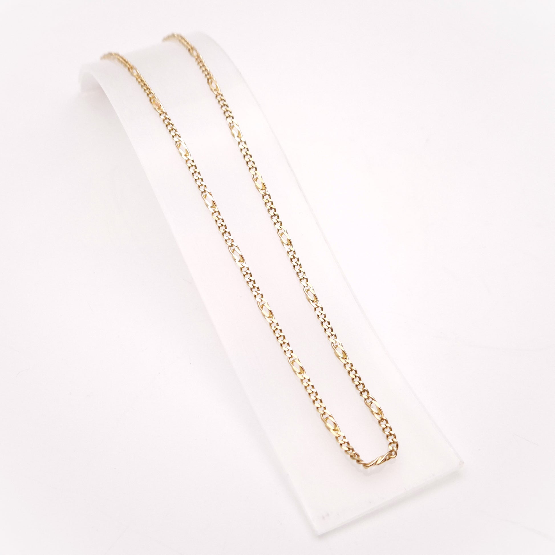 The necklace features the instantly recognizable Figaro chain link pattern. This design defined by a repeating sequence, which, in this case, is the popular one longer 'double' link followed by five shorter, curb-style links (1+5 pattern). This combination of link sizes adds dimension and visual interest compared to a simple curb chain.