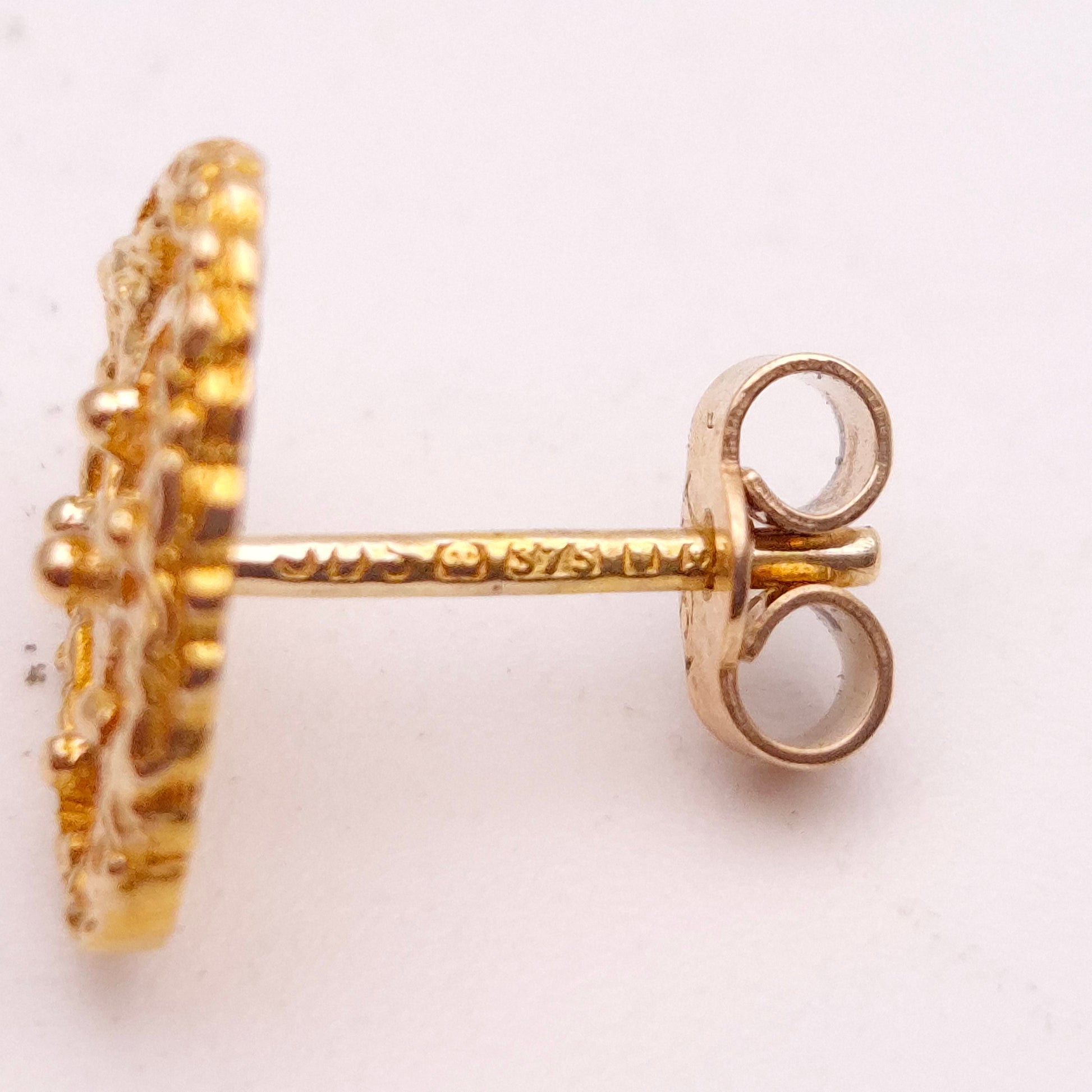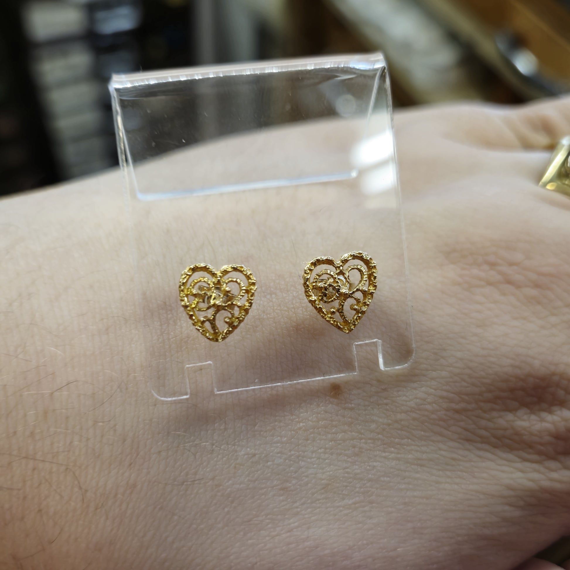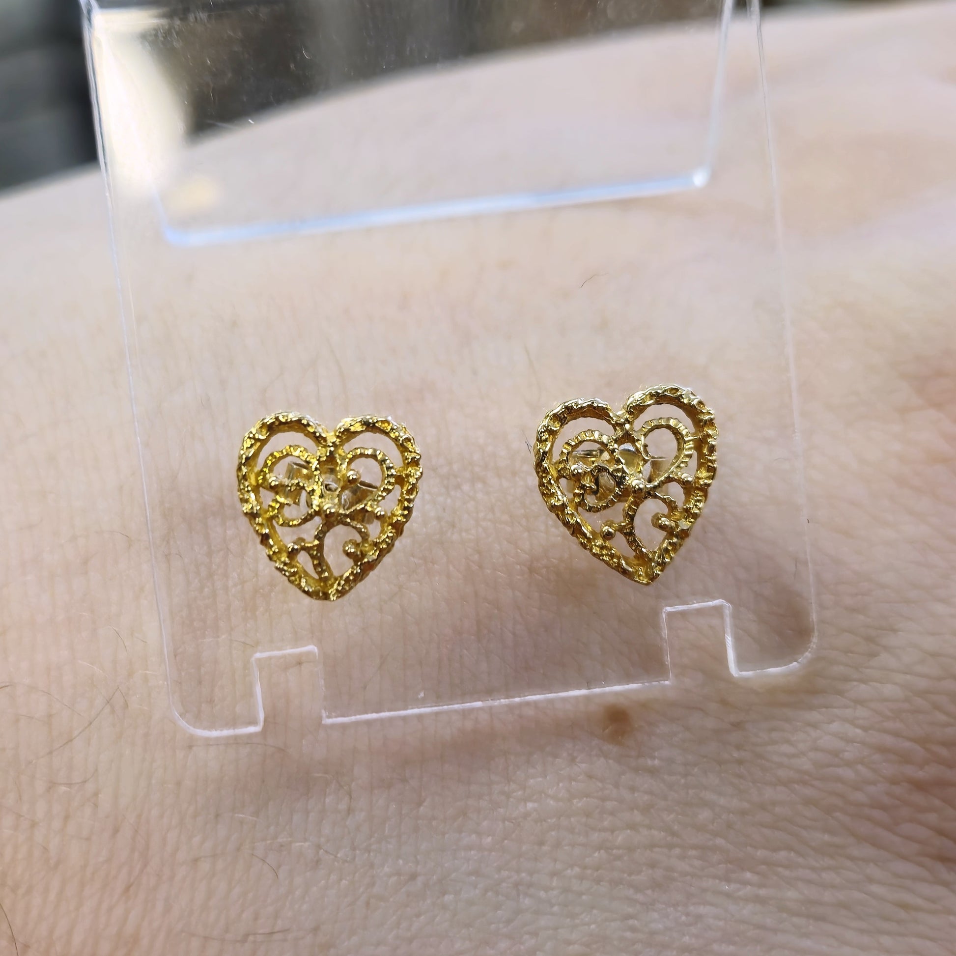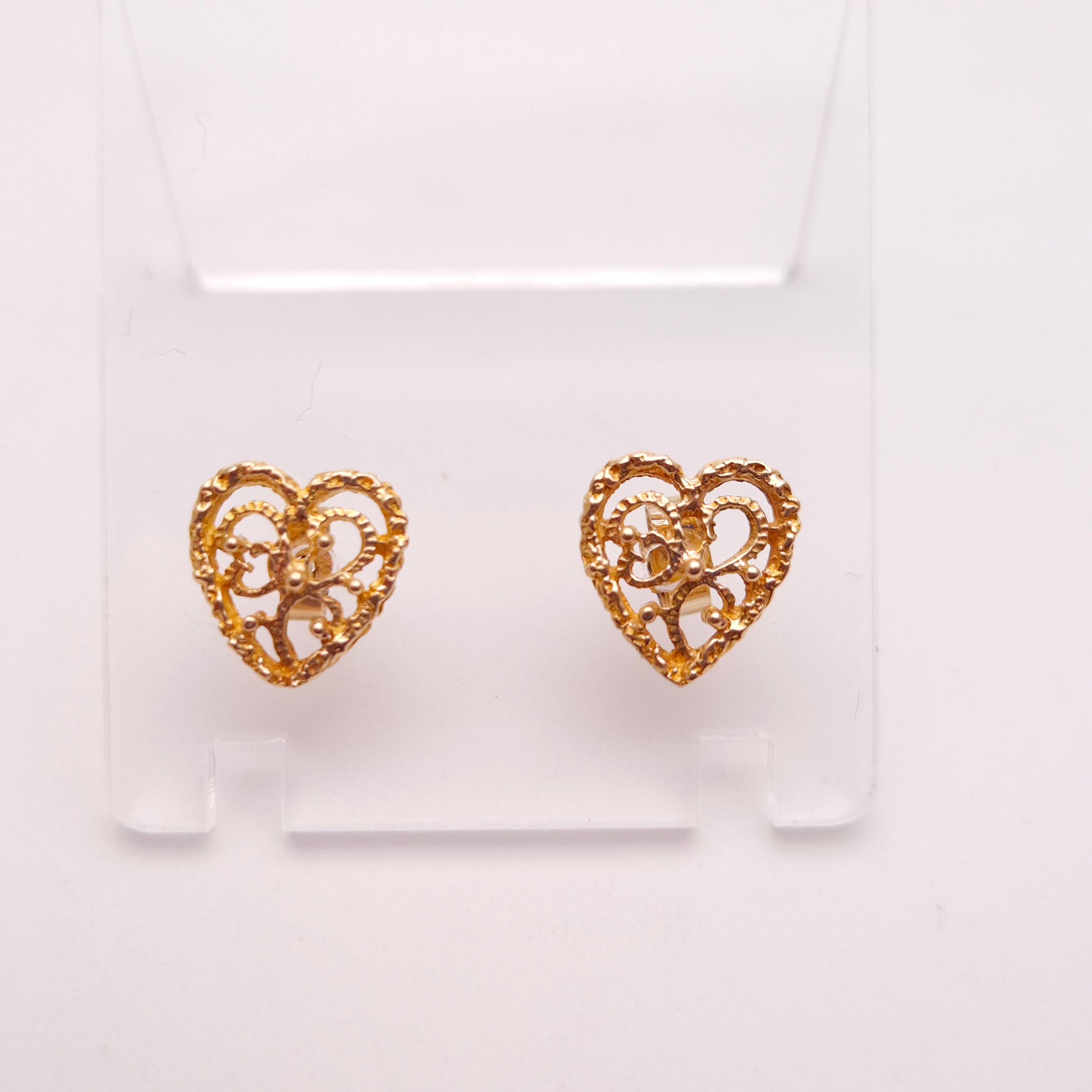 These earrings are a beautiful example of delicate craftsmanship. The filigree design, meticulously crafted in warm 9ct yellow gold, forms a classic heart shape with a unique and eye-catching texture. The openwork pattern allows light to pass through, creating a subtle sparkle and highlighting the intricate details.