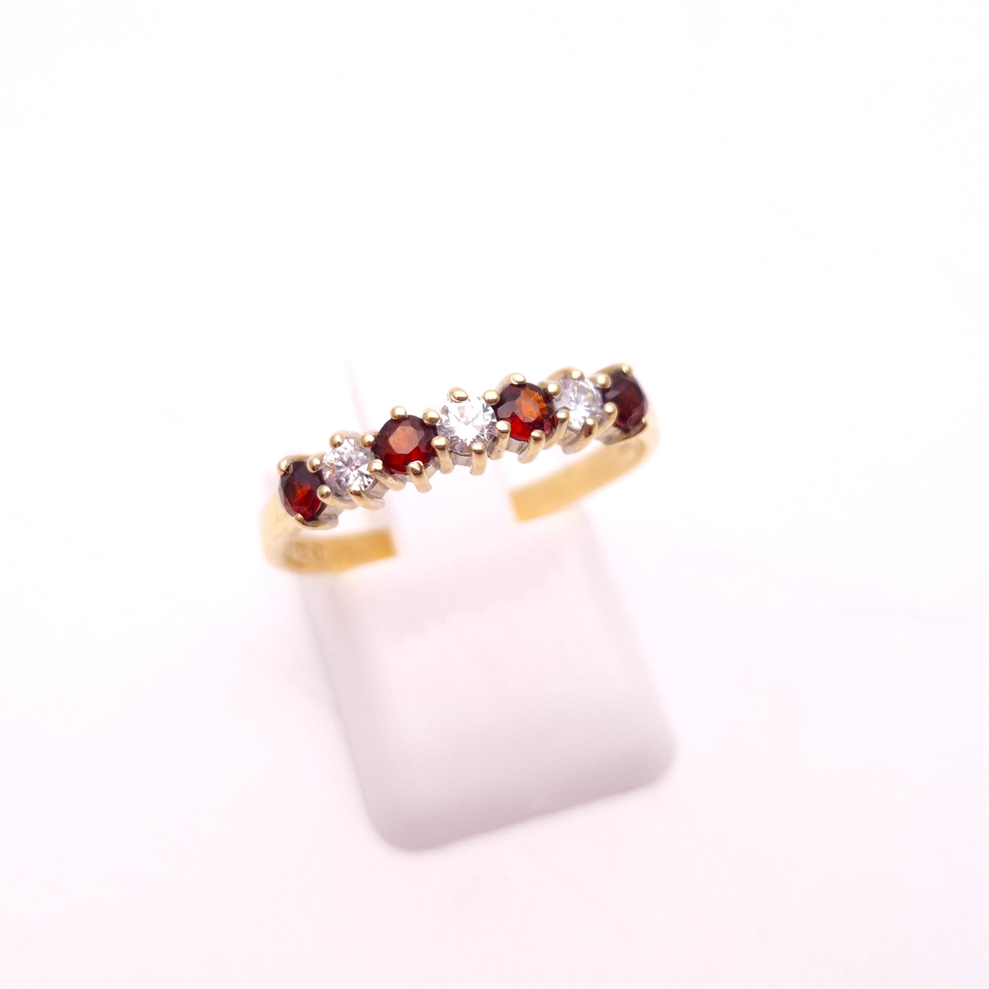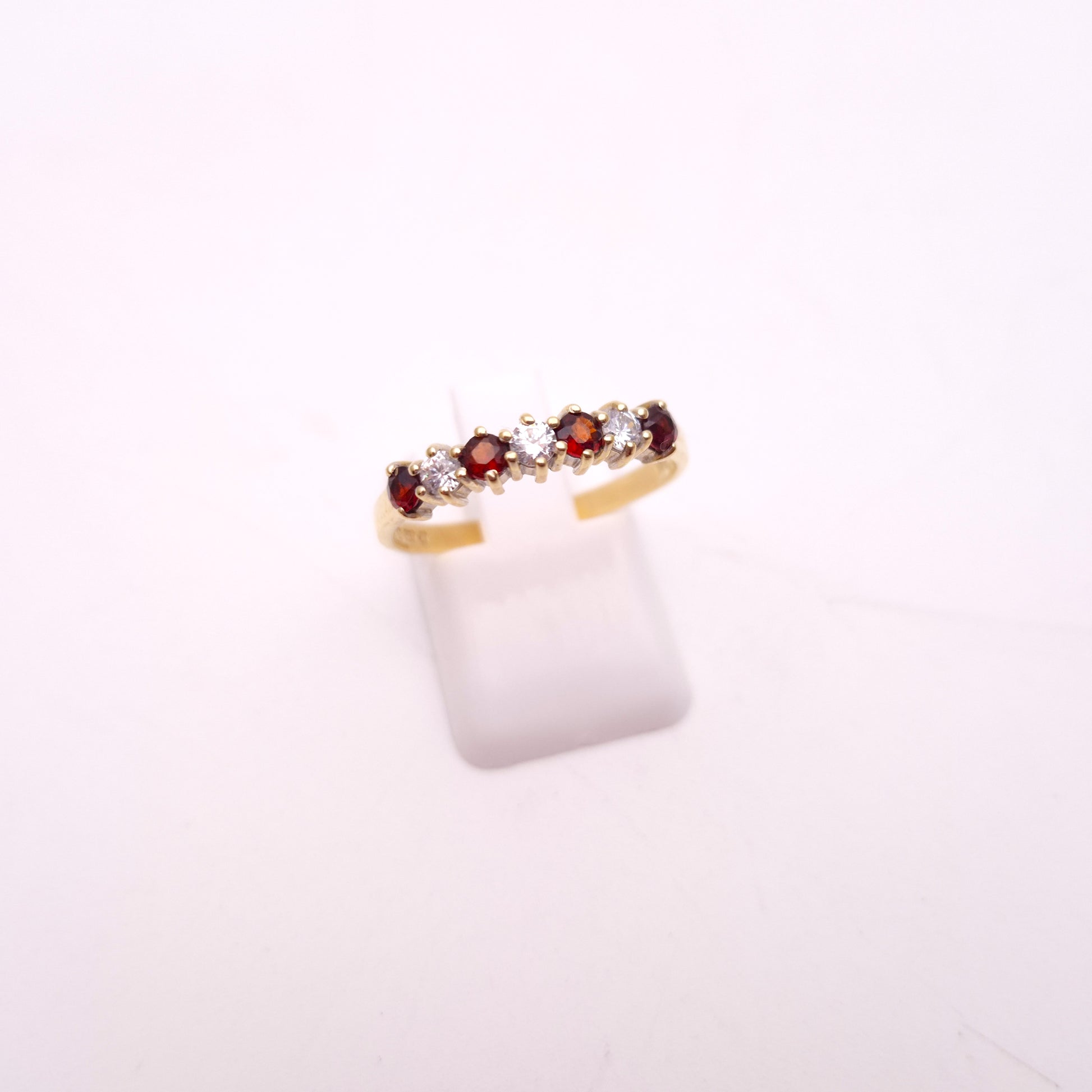 This charming ring features a vibrant half-eternity style row, crafted in warm 9ct yellow gold, and adorned with alternating garnets and cubic zirconia stones.