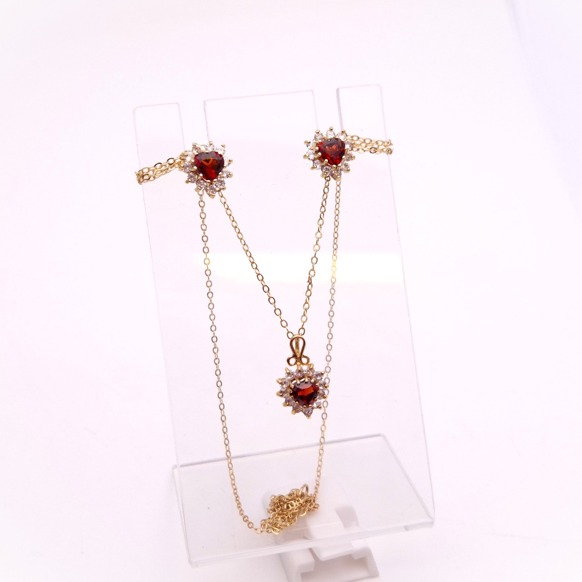 9ct Yellow Gold Garnet and CZ Heart Cluster Necklace and Earring Set