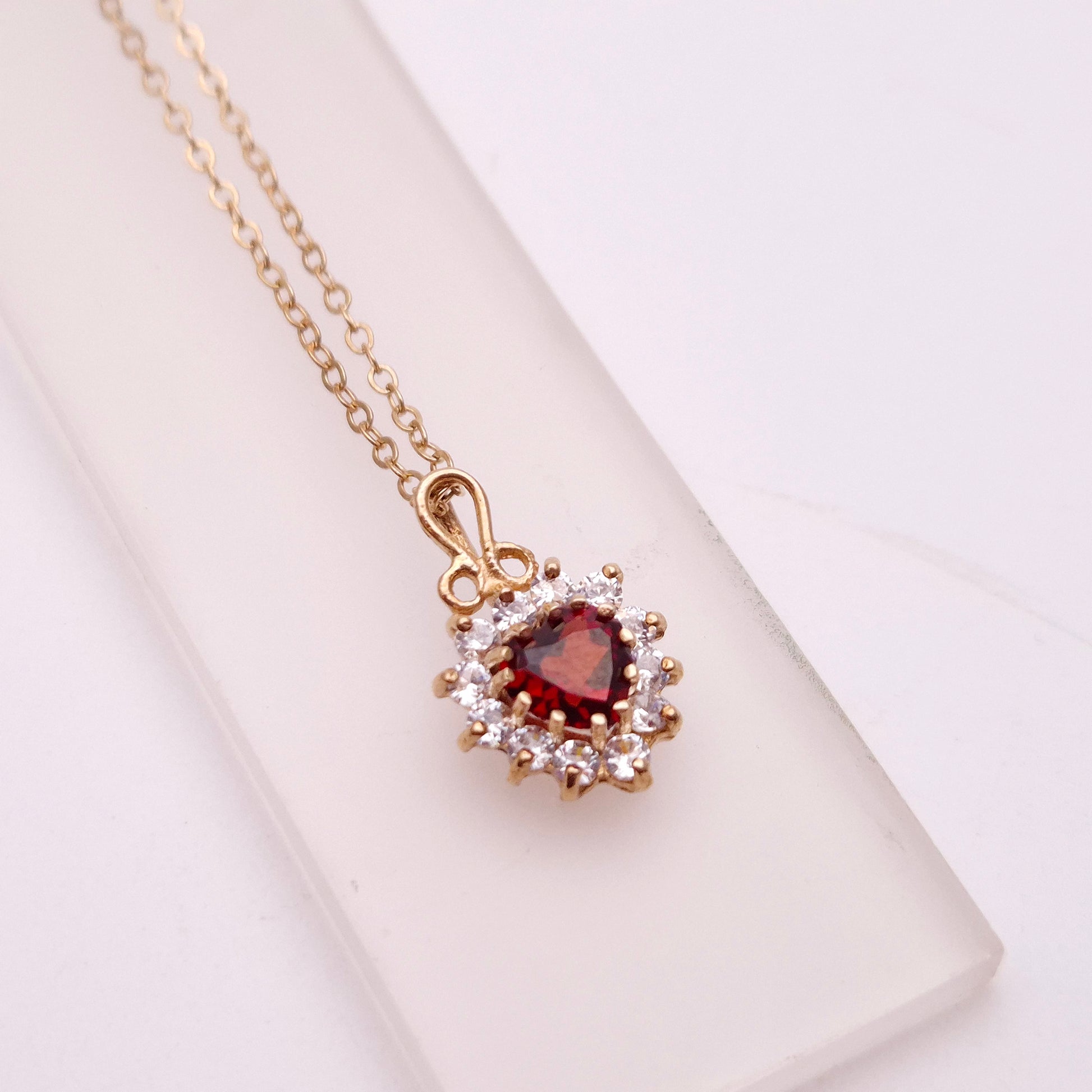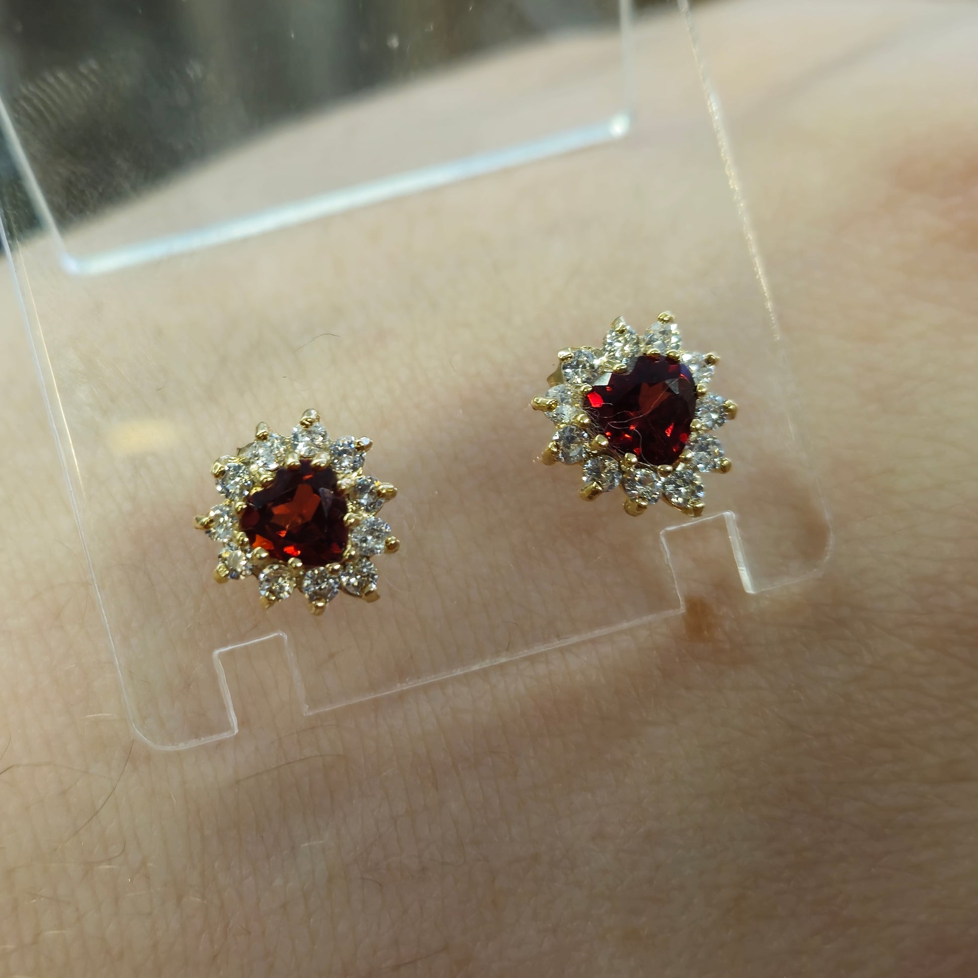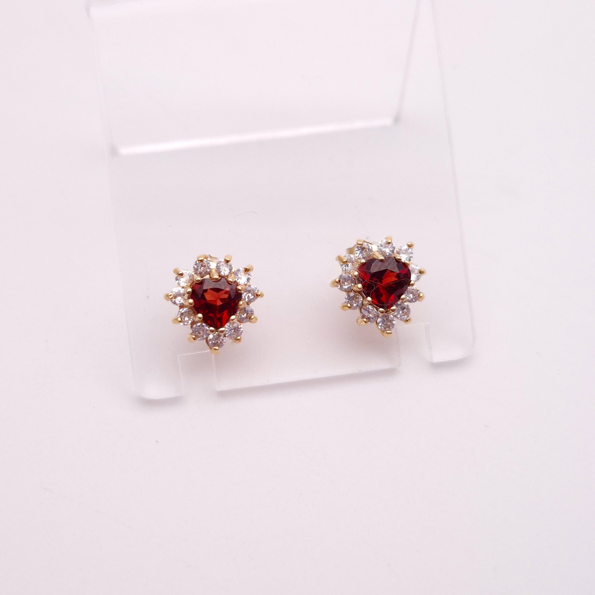 This matching set is a celebration of love and sparkle. The rich, deep red of the garnet heart gemstones, symbolizing passion and affection, is beautifully enhanced by the brilliant halo of cubic zirconia. The warm glow of the 9ct yellow gold settings adds a touch of luxury and complements the fiery gemstones and dazzling CZs perfectly.