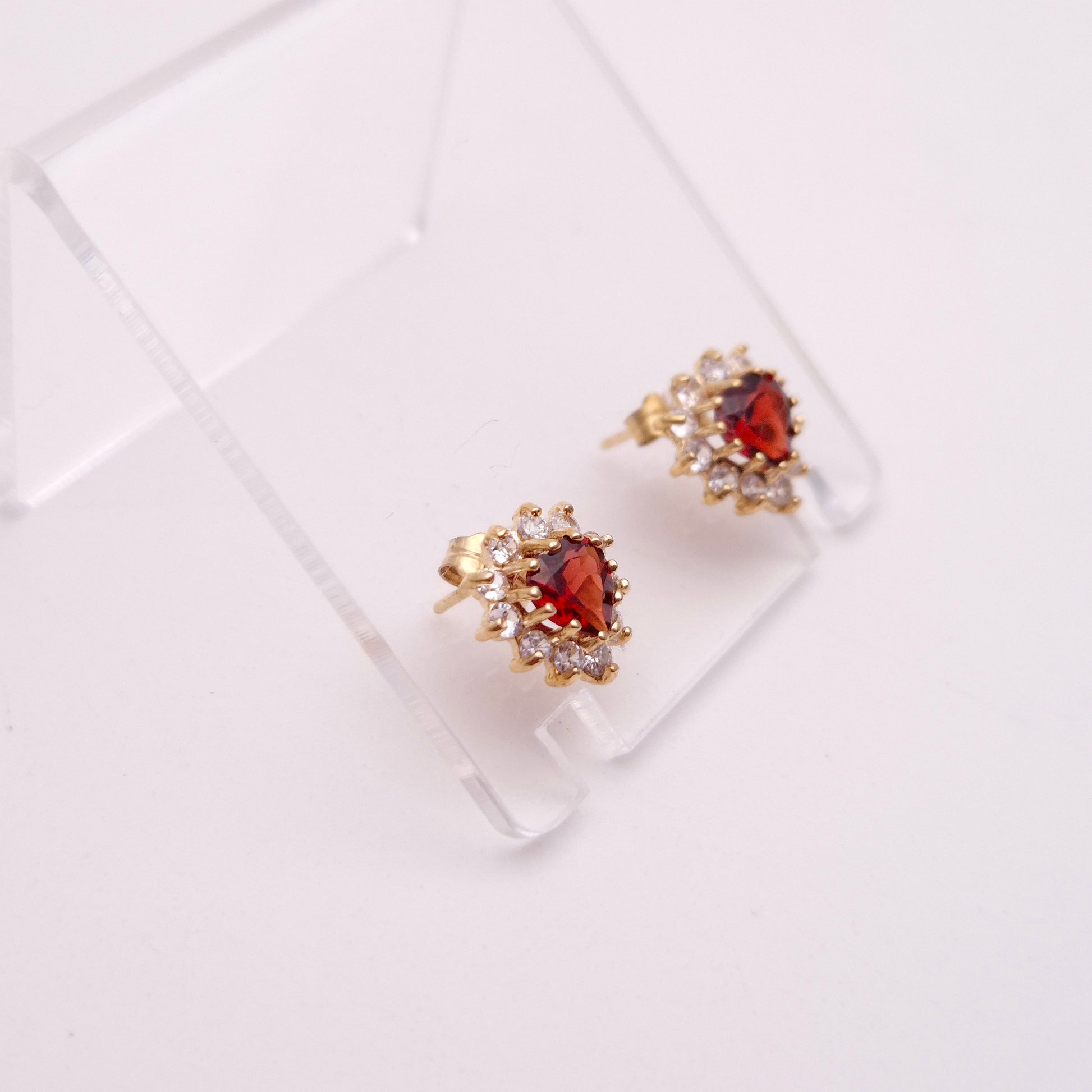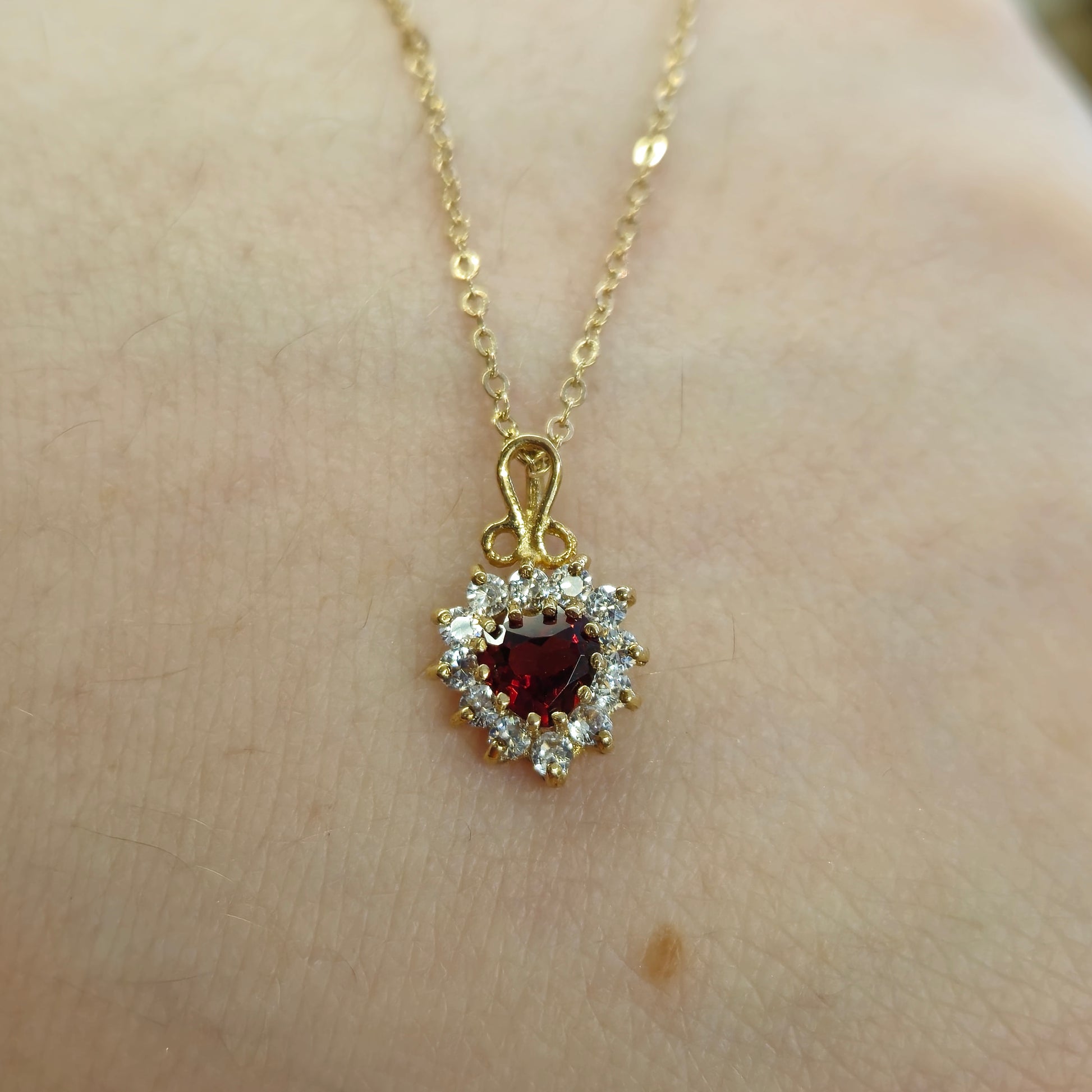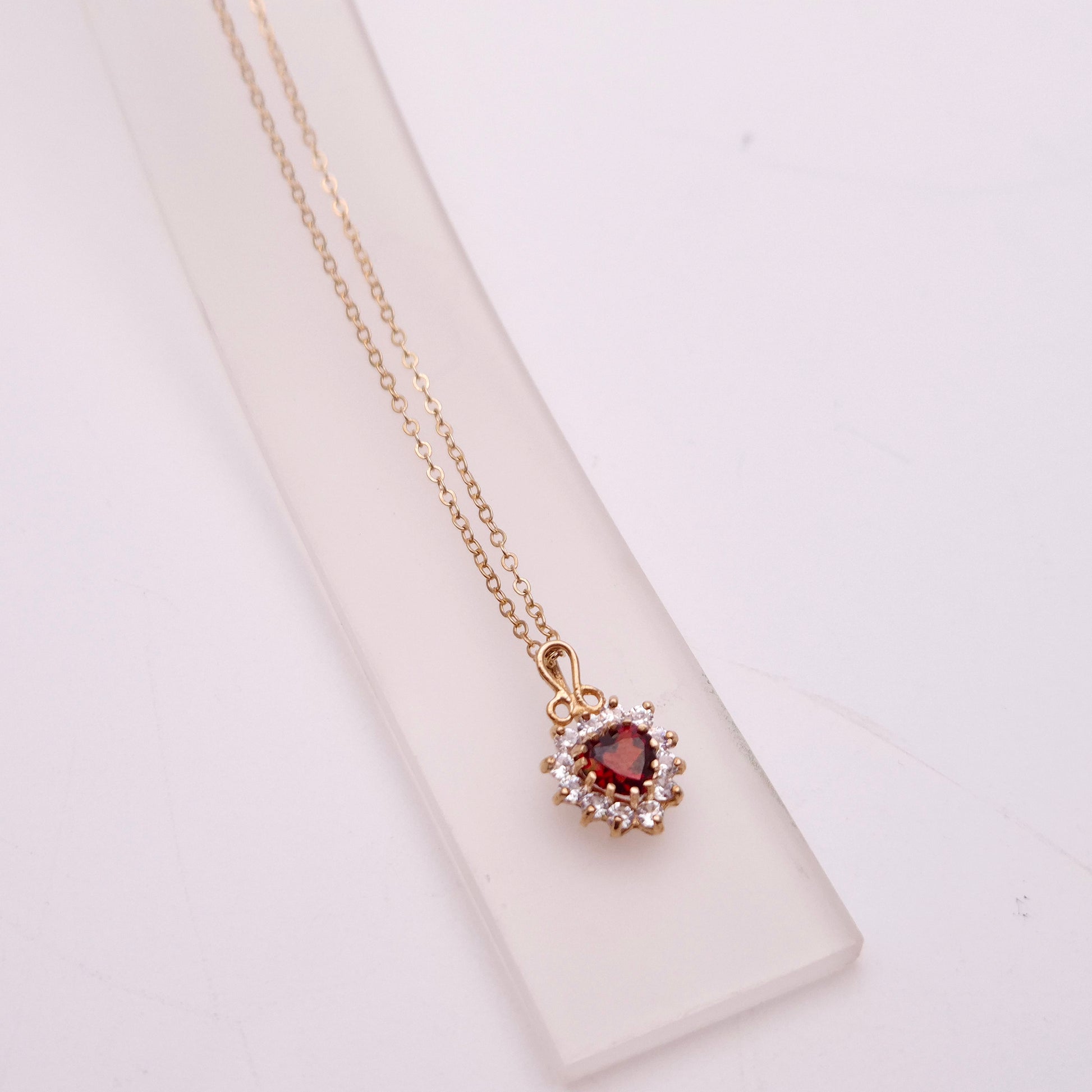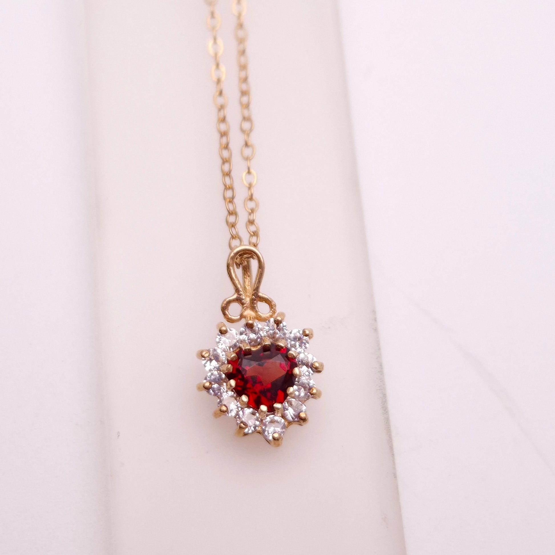 This matching set is a celebration of love and sparkle. The rich, deep red of the garnet heart gemstones, symbolizing passion and affection, is beautifully enhanced by the brilliant halo of cubic zirconia. The warm glow of the 9ct yellow gold settings adds a touch of luxury and complements the fiery gemstones and dazzling CZs perfectly.
