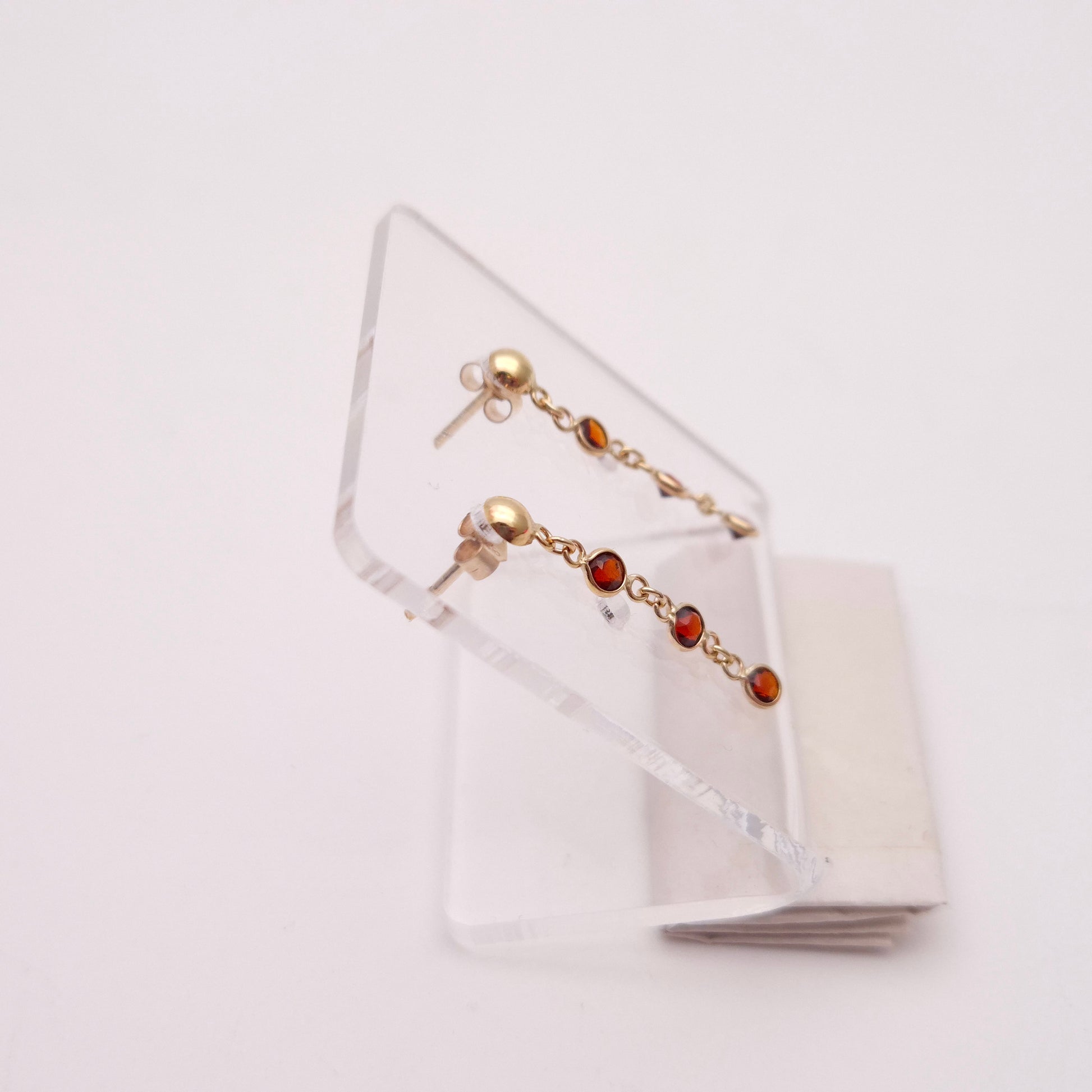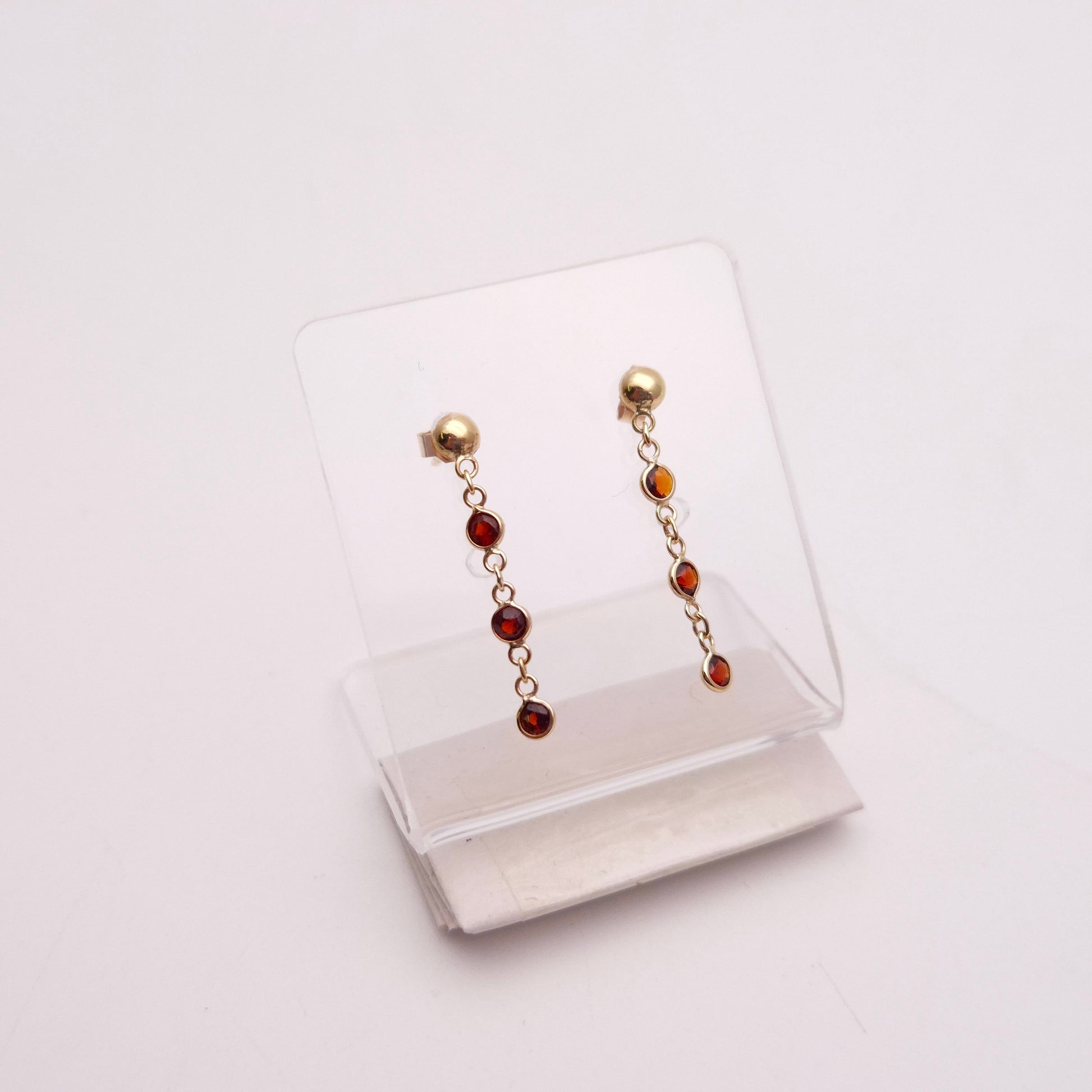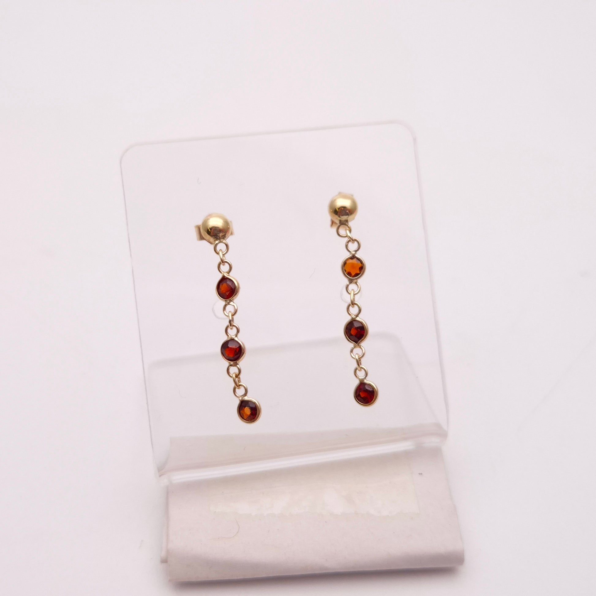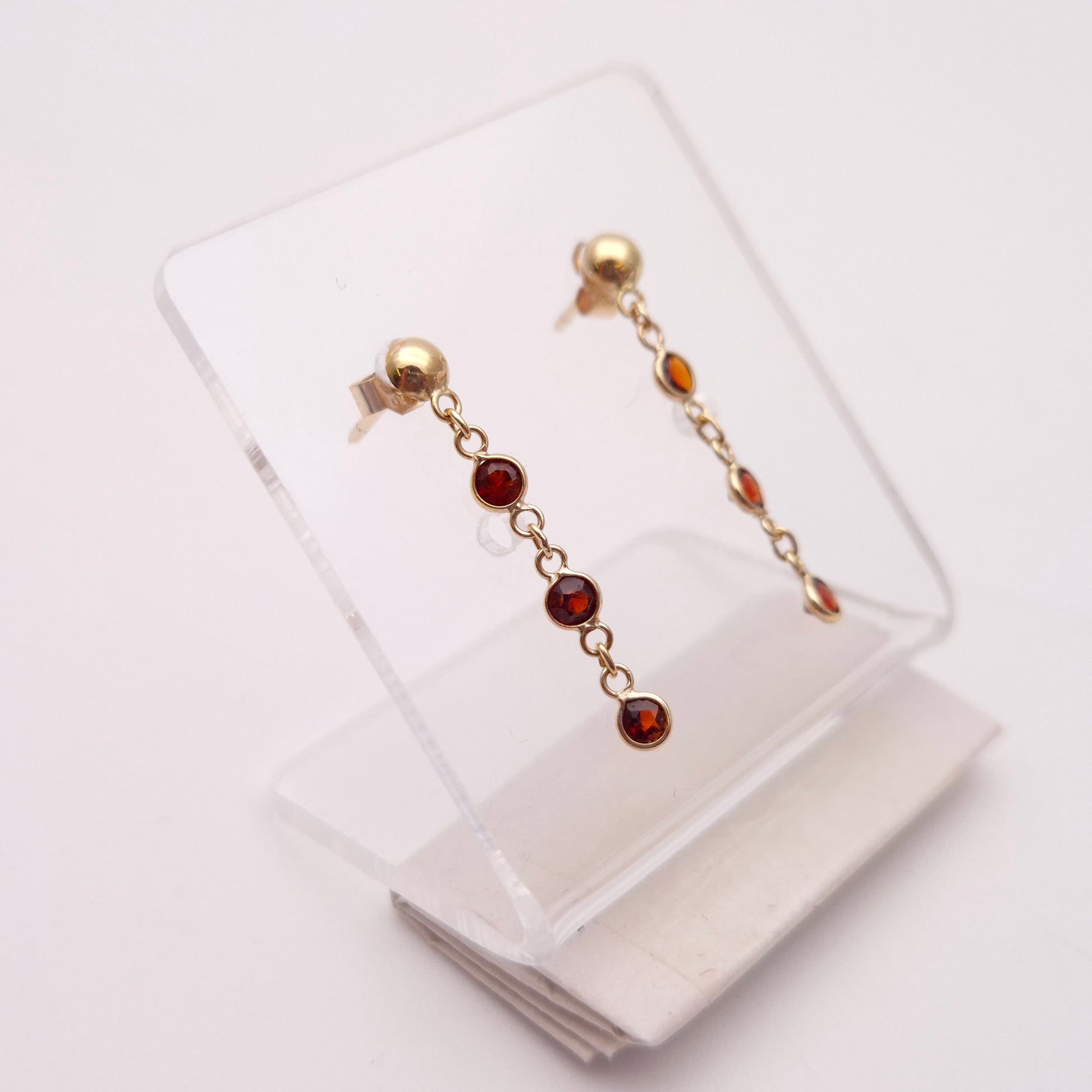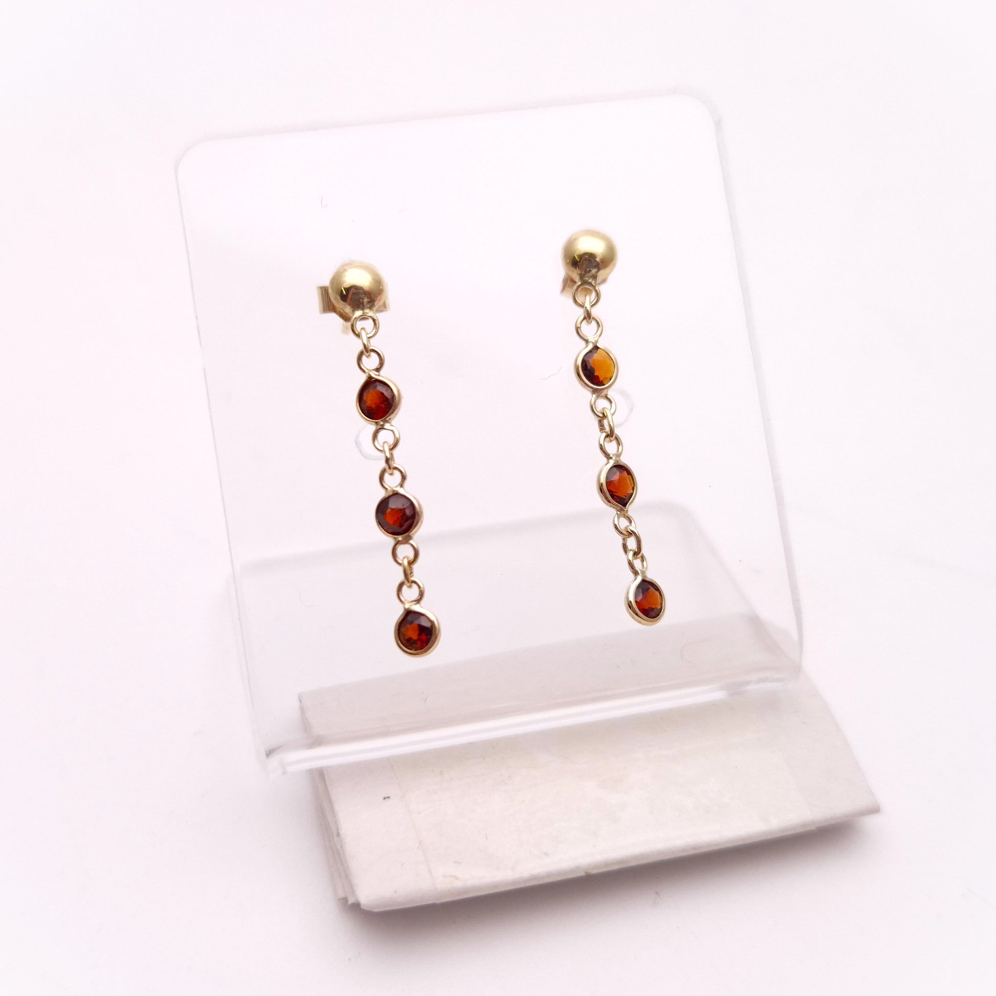 These elegant drop earrings feature a trio of rich, red garnet gemstones, each securely set in warm 9ct yellow gold. The garnets are equal in size, creating a delicate and eye-catching cascade. Suspended from classic gold ball studs, these earrings offer a lovely movement and a touch of sophisticated colour, perfect for adding a subtle sparkle to any look.