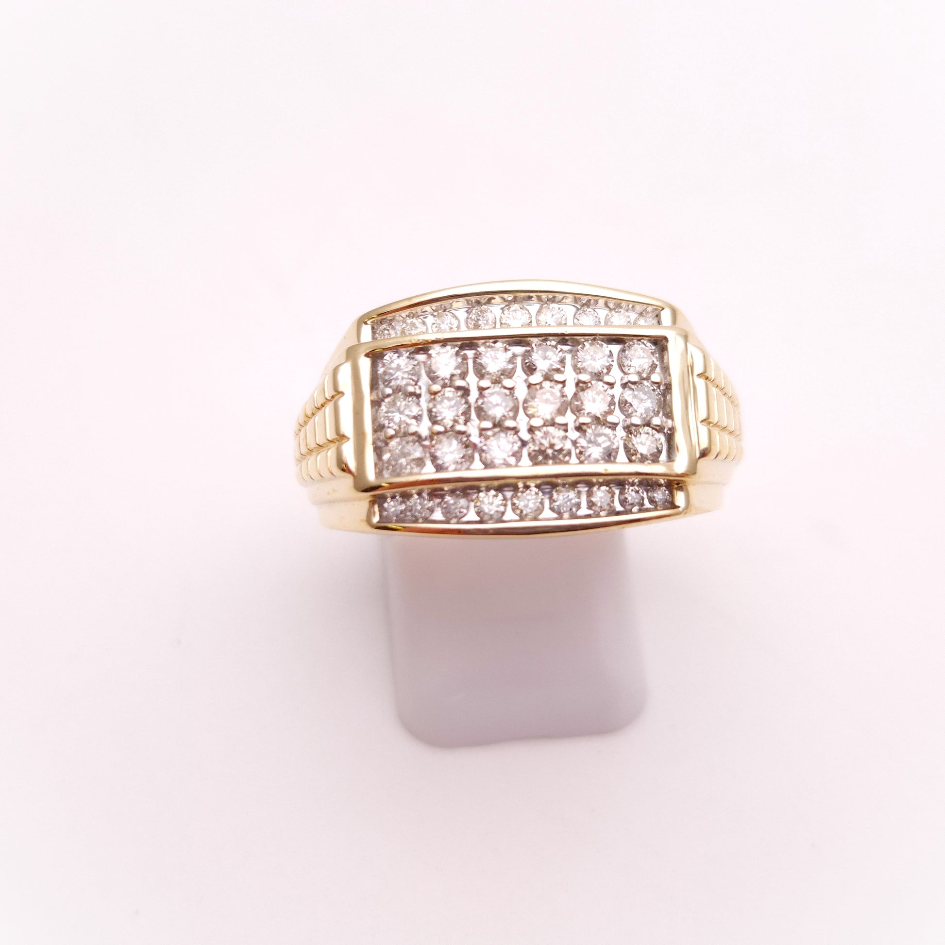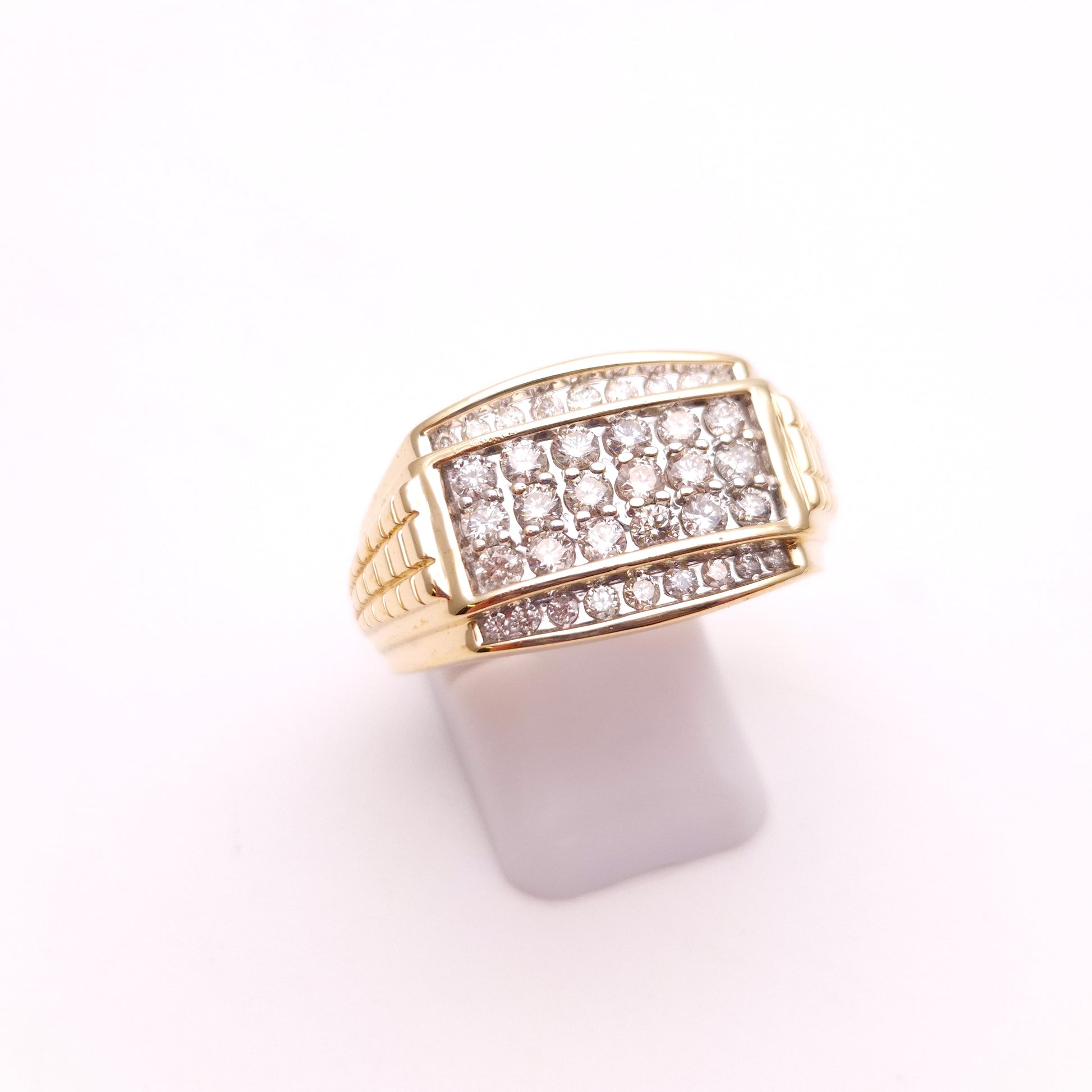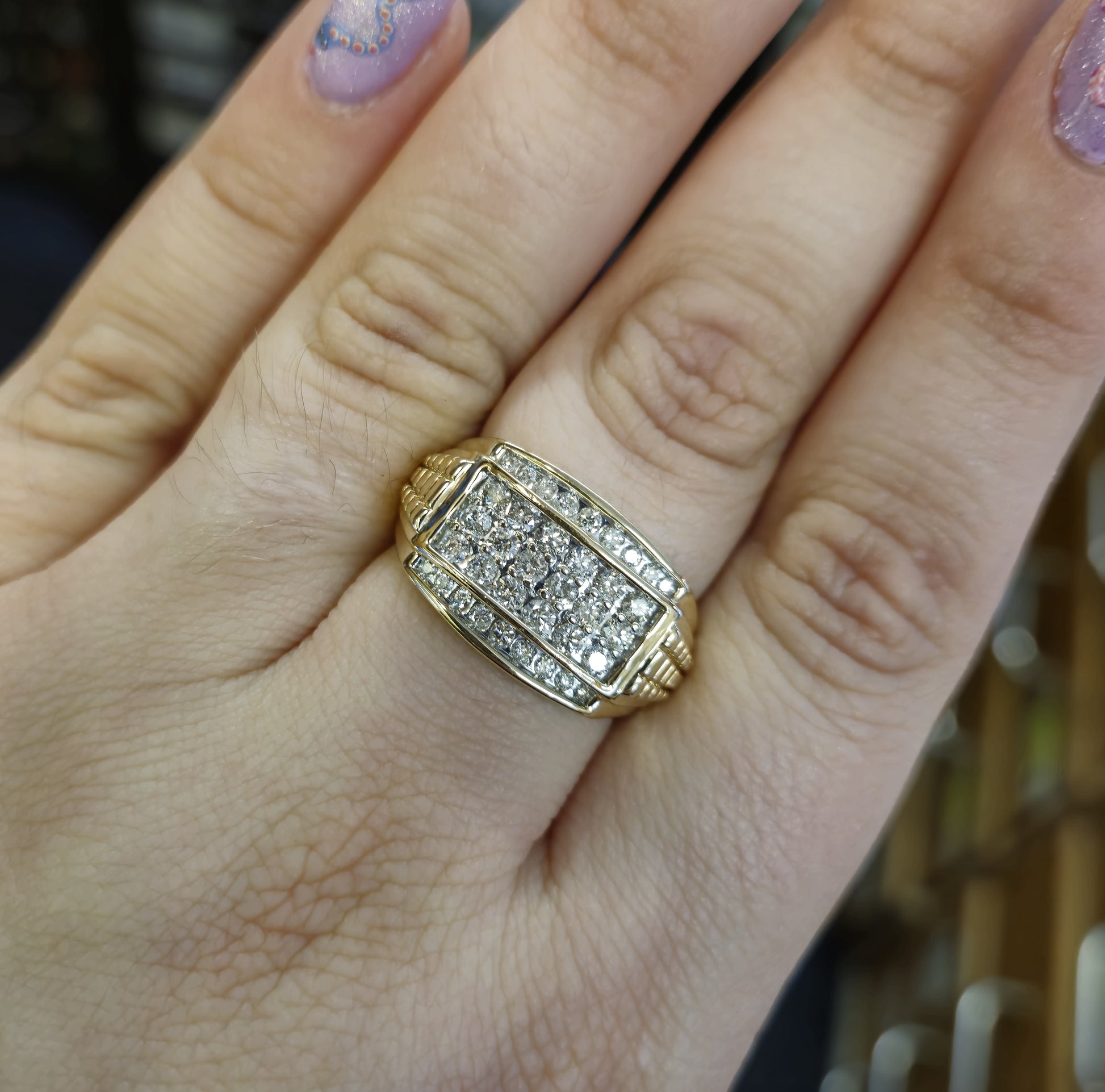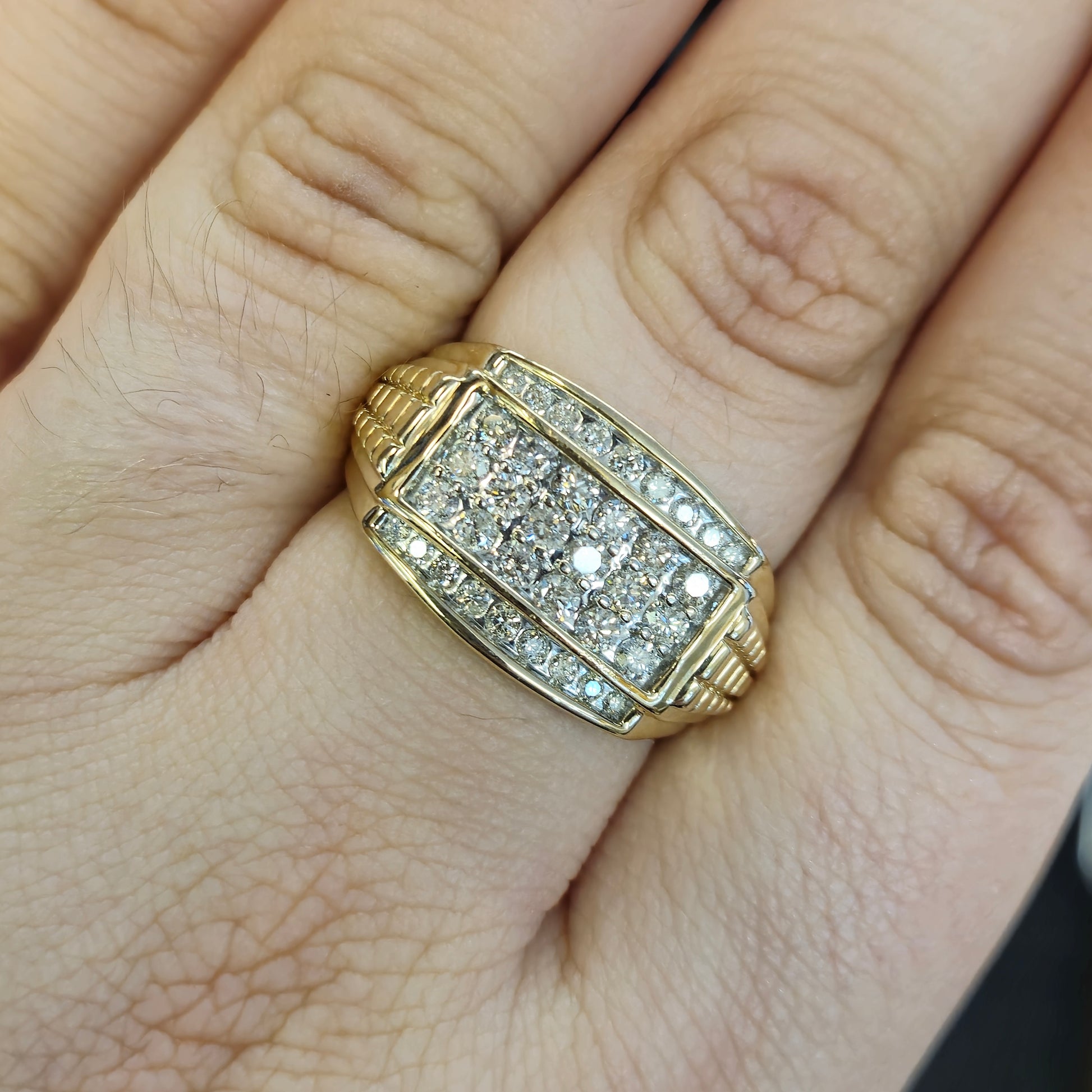 This impressive 9ct yellow gold ring makes a bold statement with its striking block design, lavishly set with dazzling diamonds. Crafted for the discerning gentleman who appreciates a touch of luxury, this signet-style ring exudes confidence and sophistication. The rectangular face of the ring is meticulously pave-set with numerous sparkling diamonds, creating a breath-taking display of brilliance. The substantial yellow gold setting provides a warm and classic contrast to the icy sparkle of the diamonds. The shoulders of the ring feature a stepped design, adding a further element of visual interest and reinforcing its strong, masculine aesthetic.