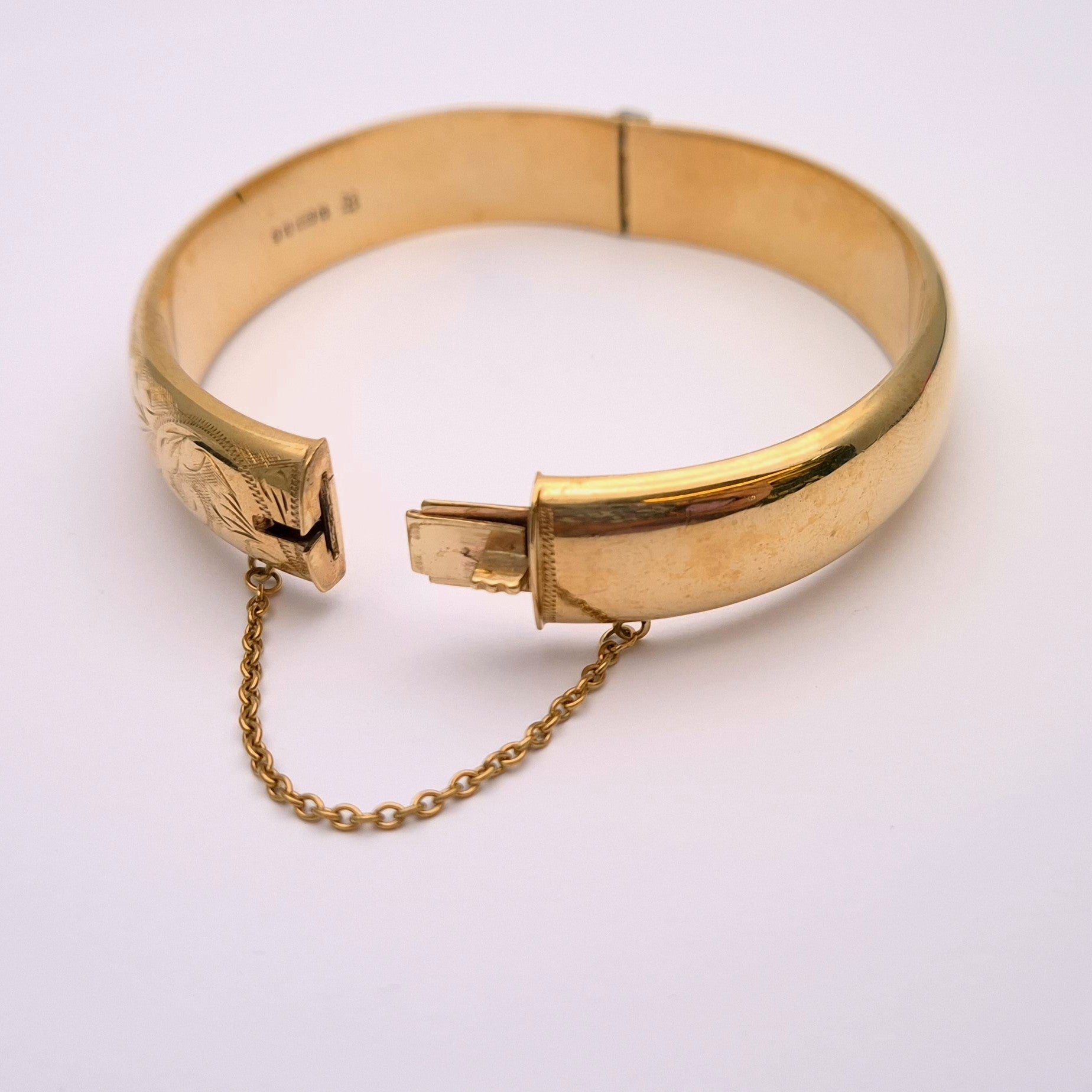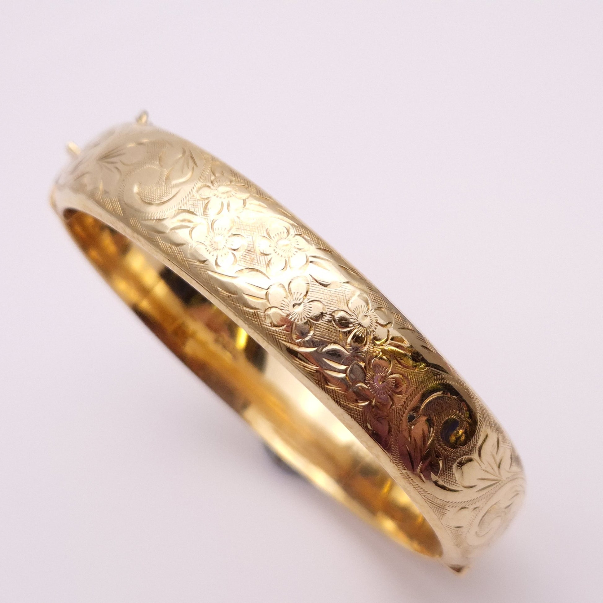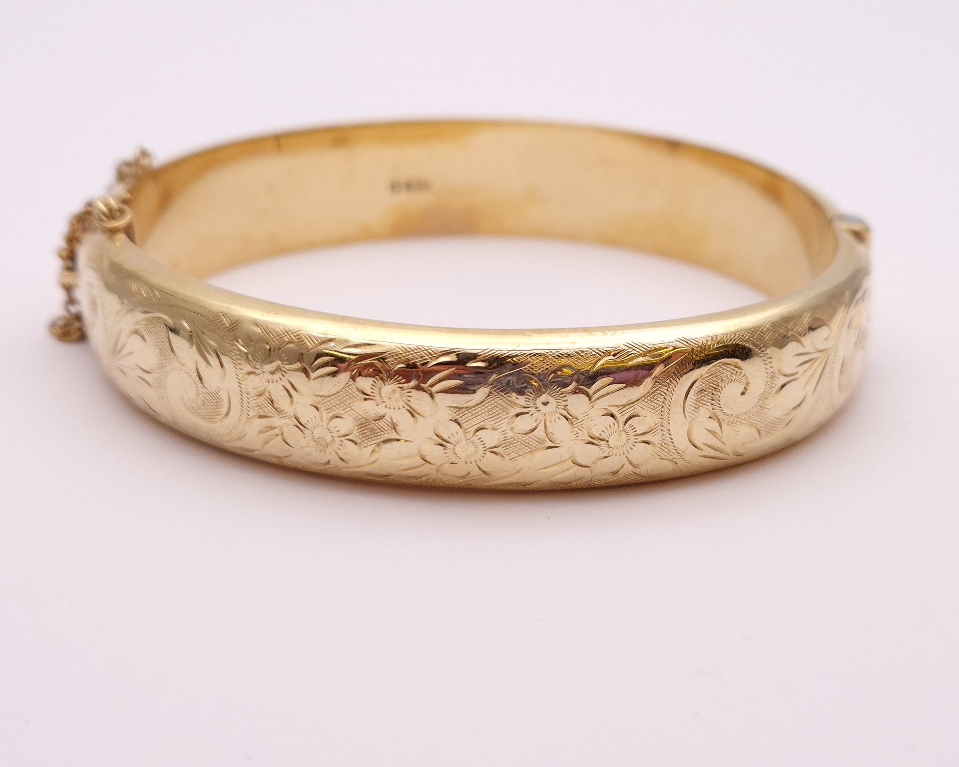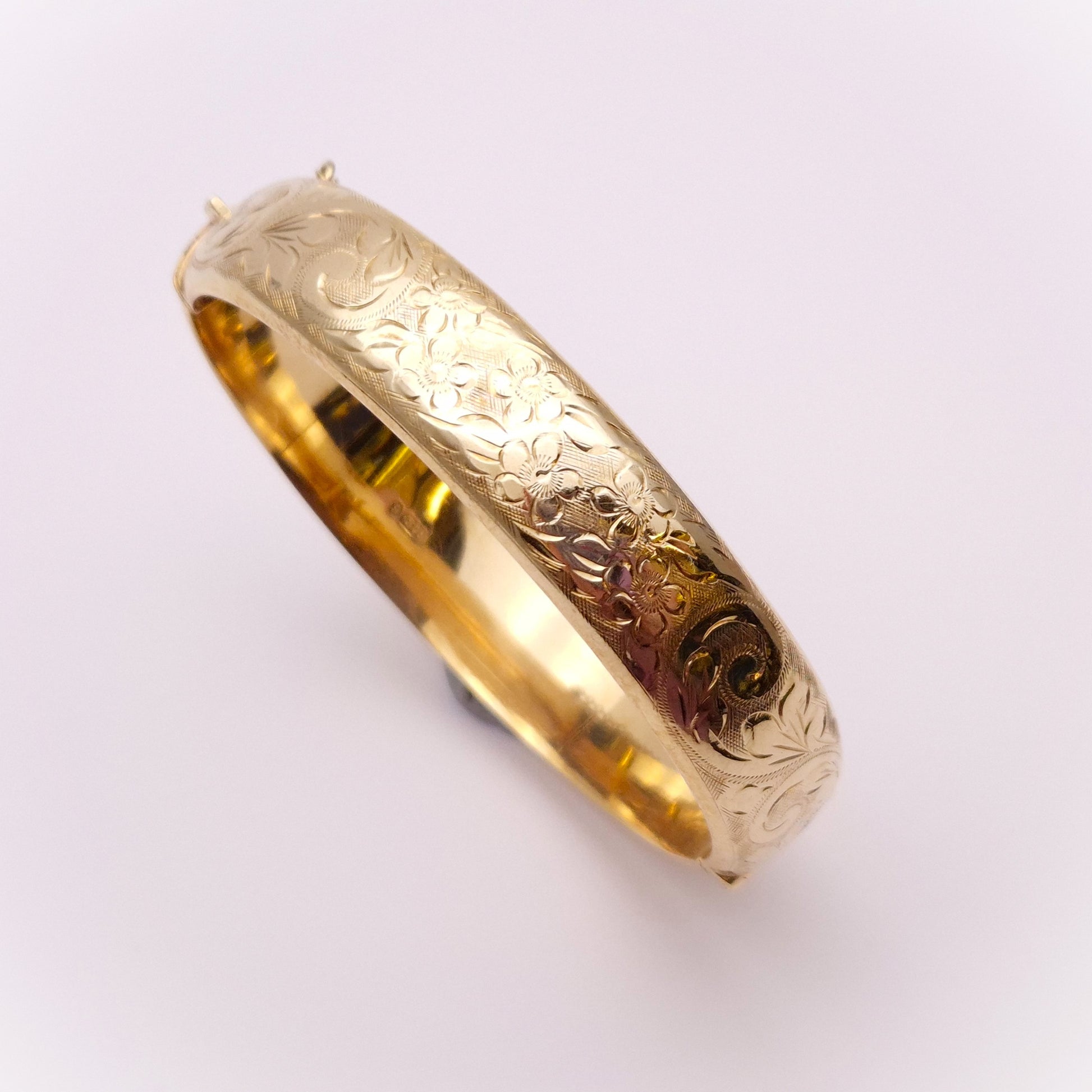 This stunning piece is a wide bangle made from 9ct yellow gold. The front half is engraved with pretty floral patterning and the back half is plain polished gold. The closure is a traditional push closure and it has a safety chain for extra security.
