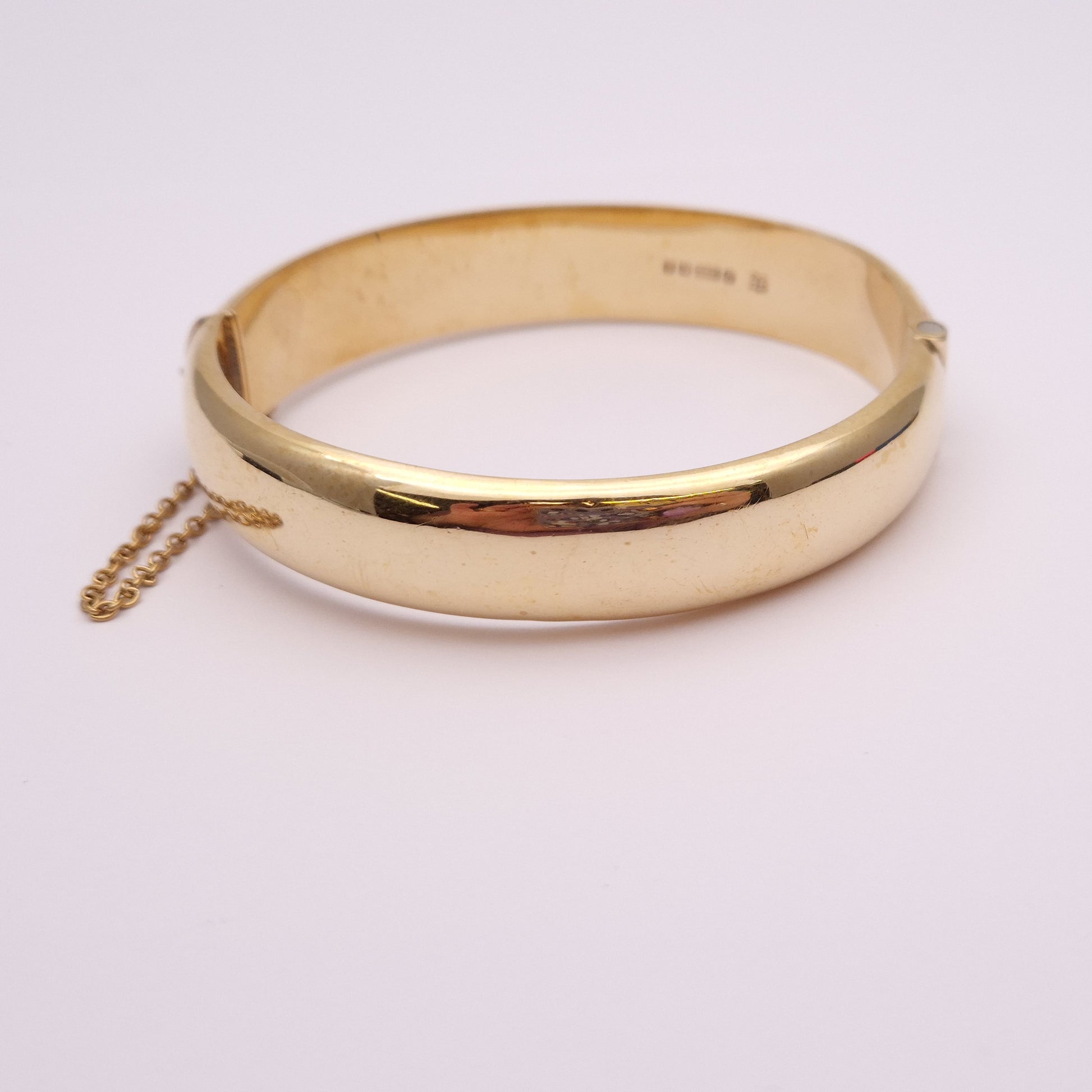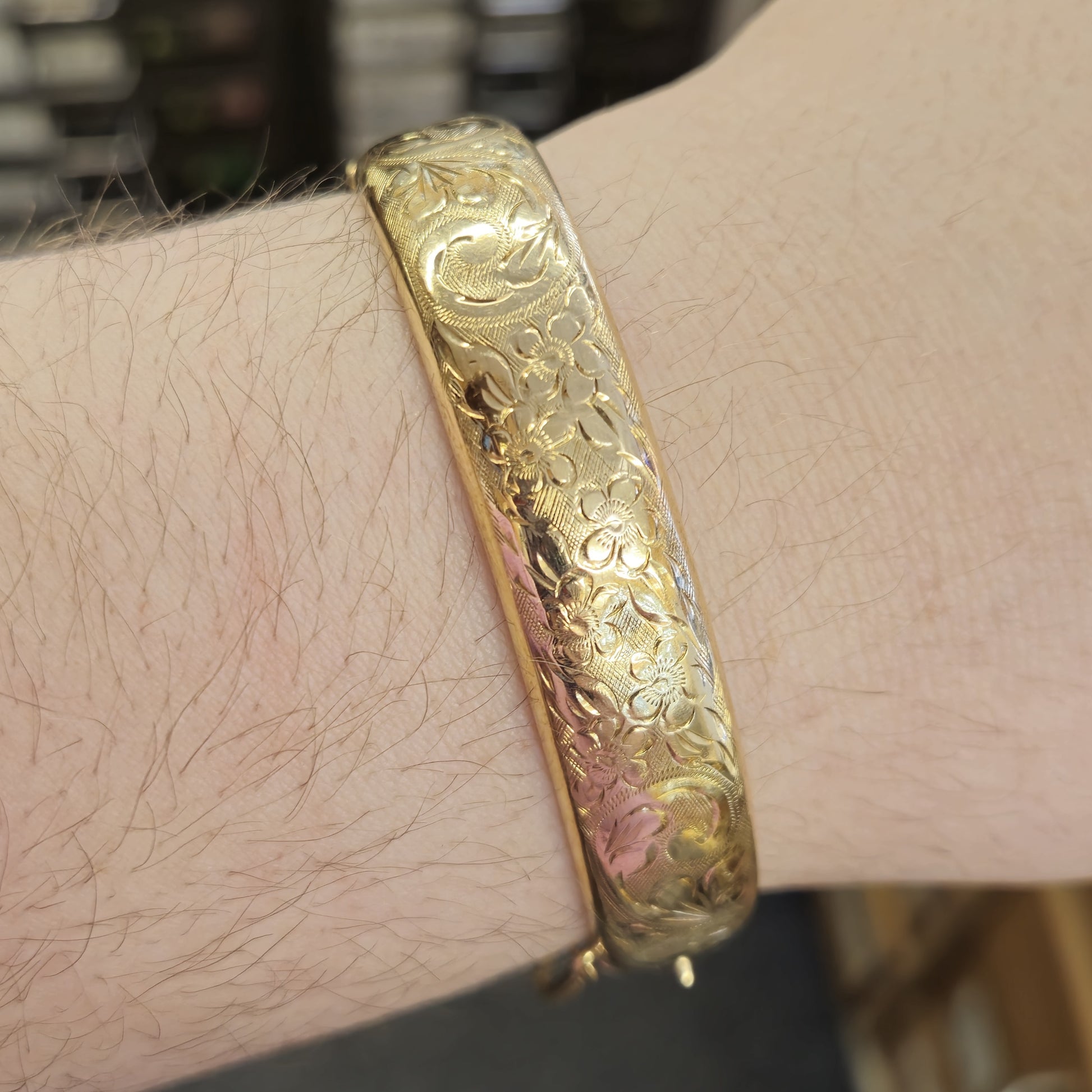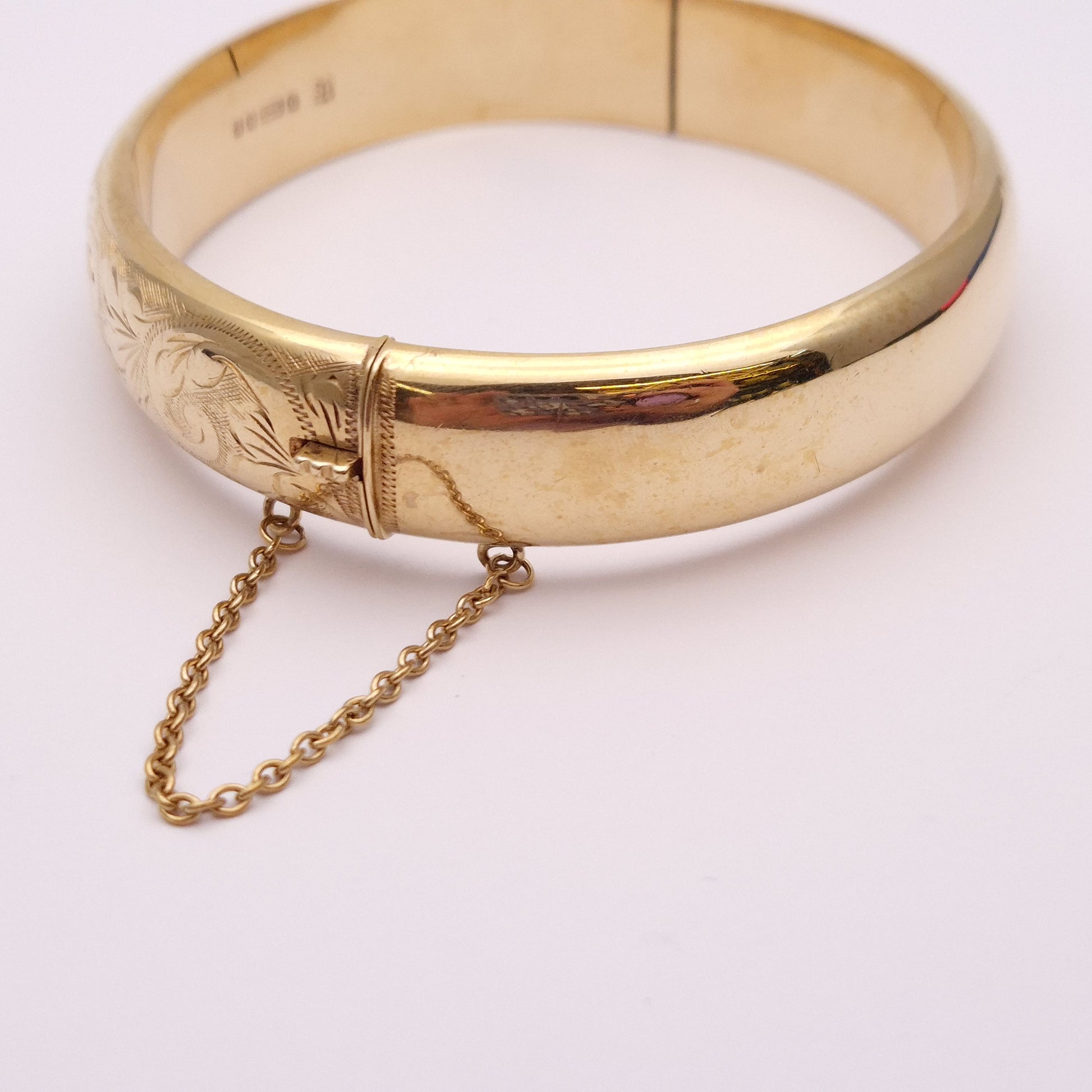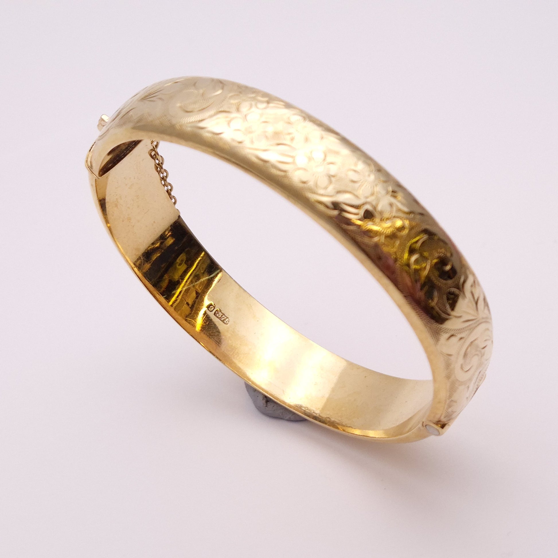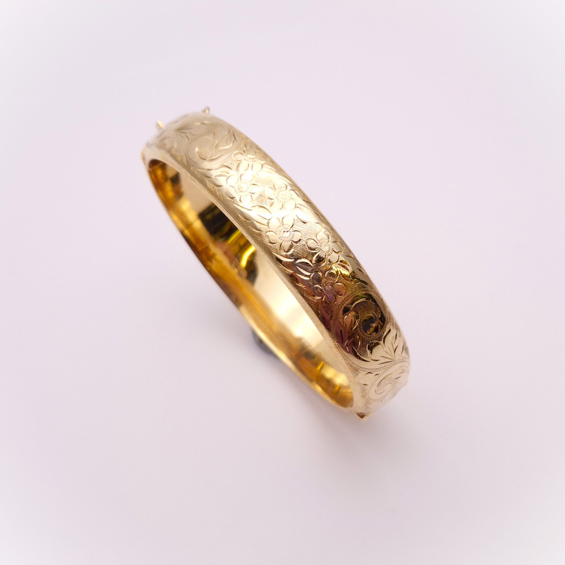 This stunning piece is a wide bangle made from 9ct yellow gold. The front half is engraved with pretty floral patterning and the back half is plain polished gold. The closure is a traditional push closure and it has a safety chain for extra security.