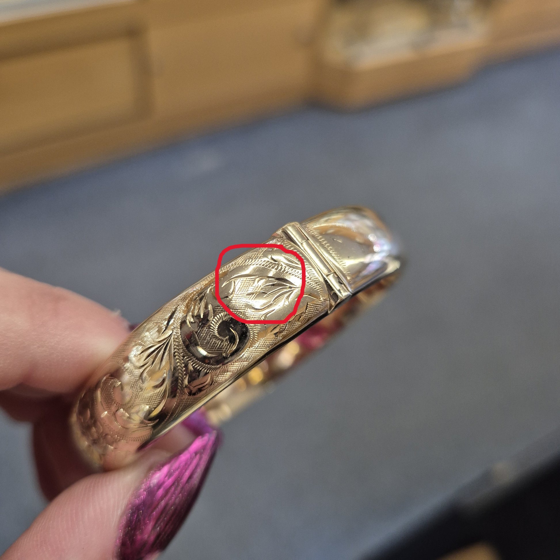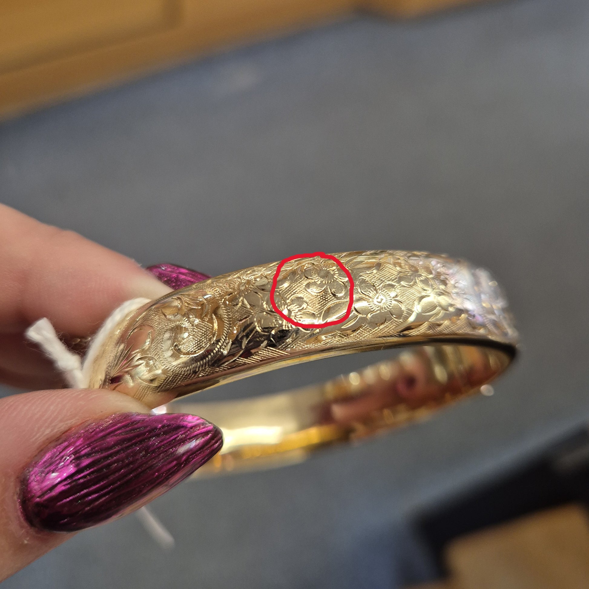 Please note the last two pictures on the listing highlight two small dings in the bangle, ive tried to picture them as best possible but getting the light to hit right is tricky , hence the circling.
