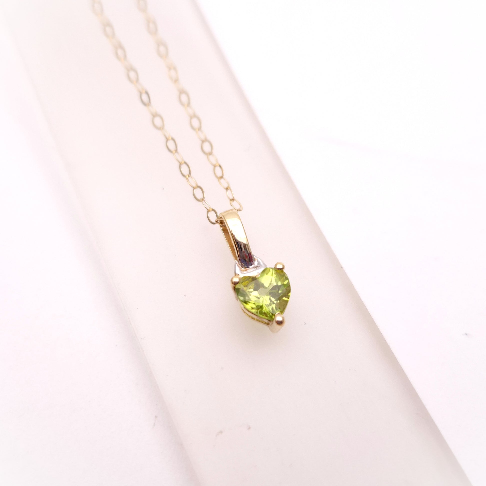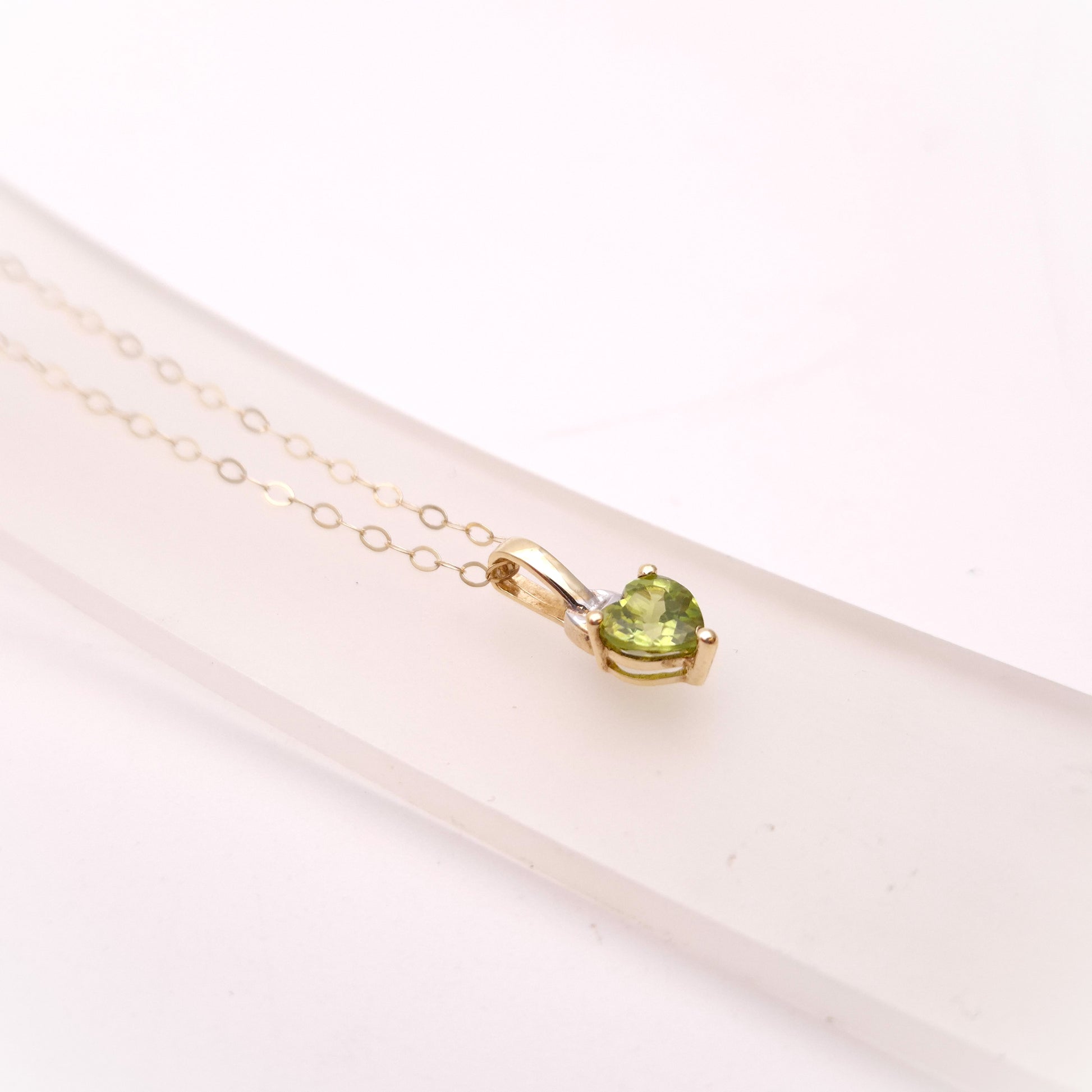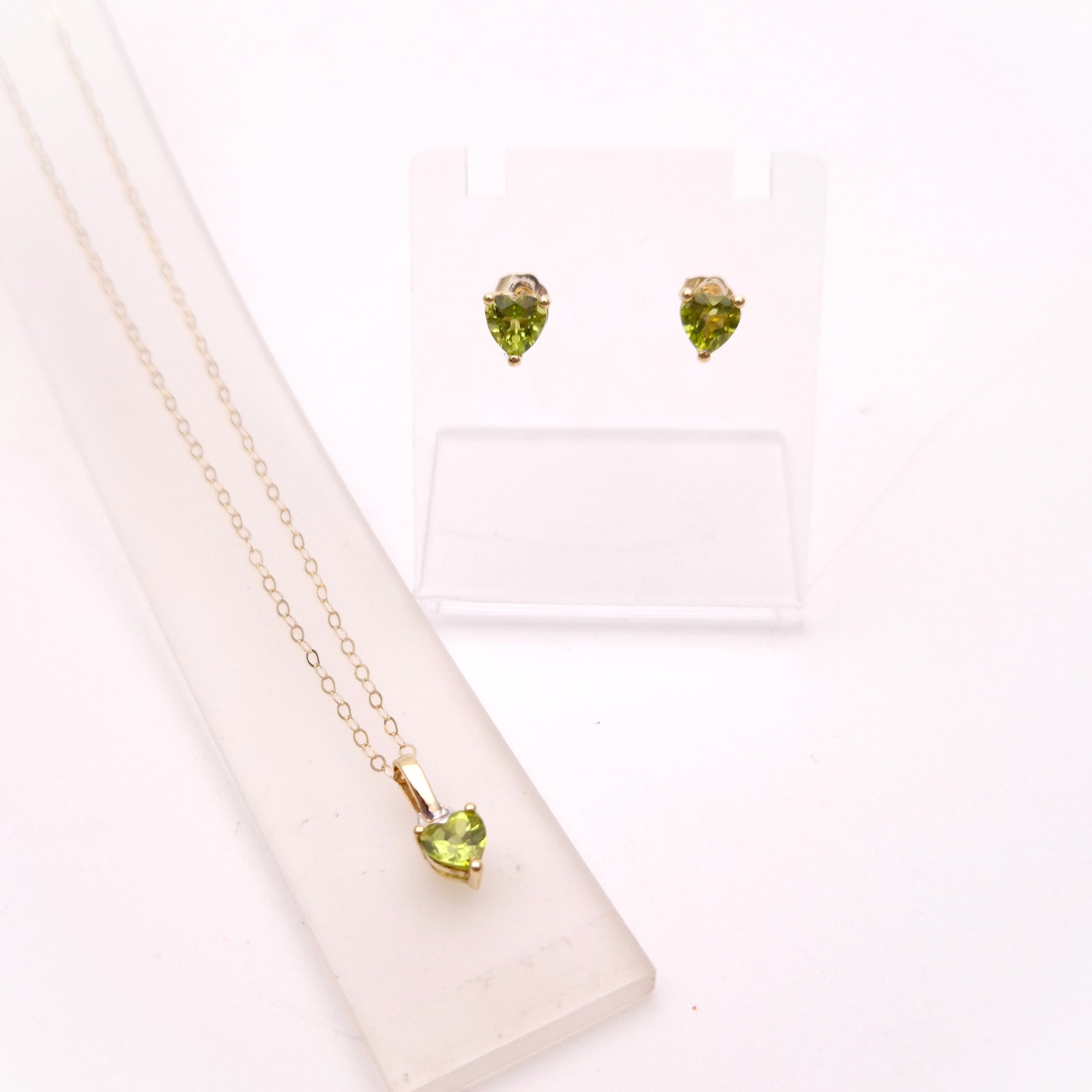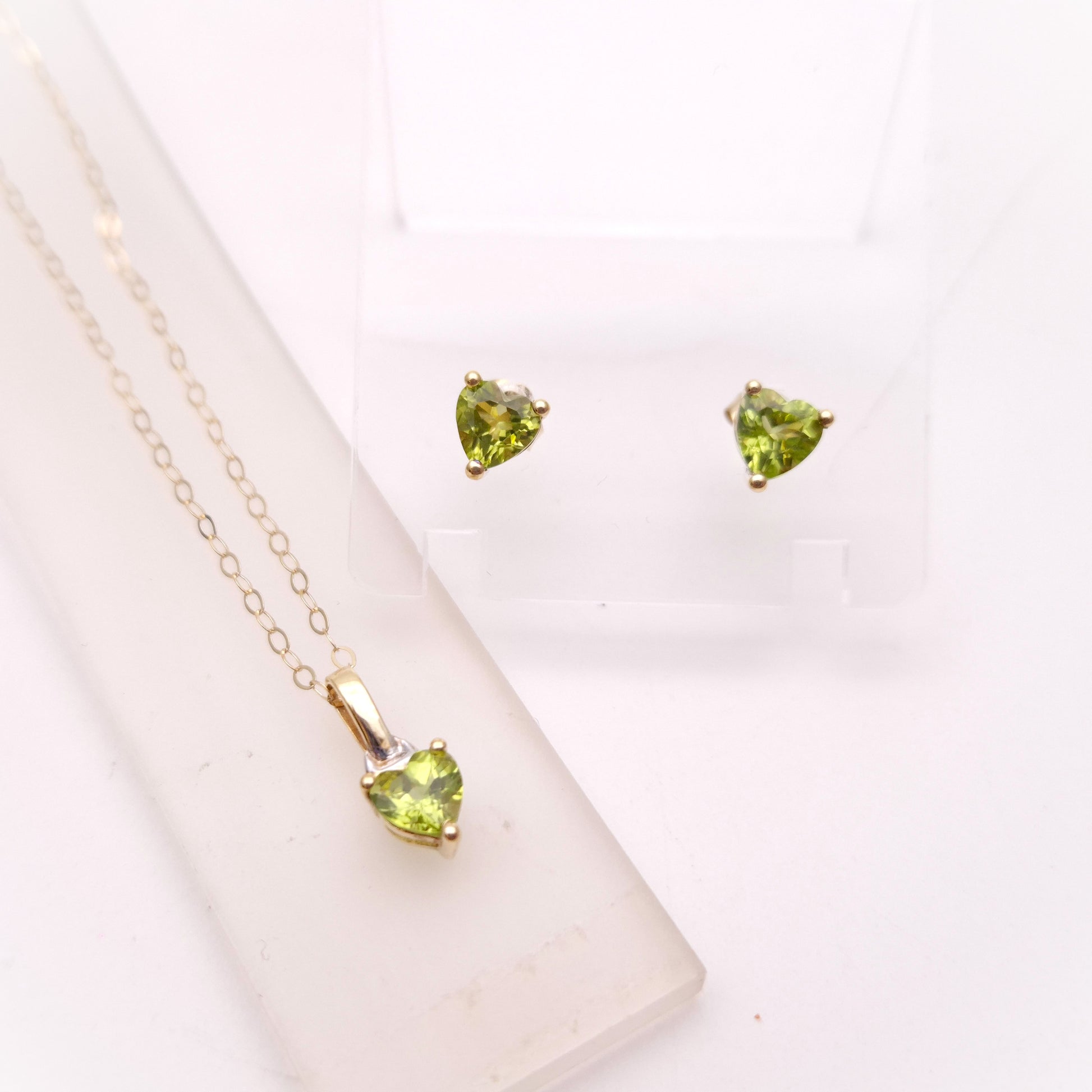 The necklace features a delicate heart-shaped peridot pendant suspended from a fine 9ct yellow gold chain with matching stud earrings also featuring heart-shaped peridots, set in simple yet elegant 9ct yellow gold settings.
