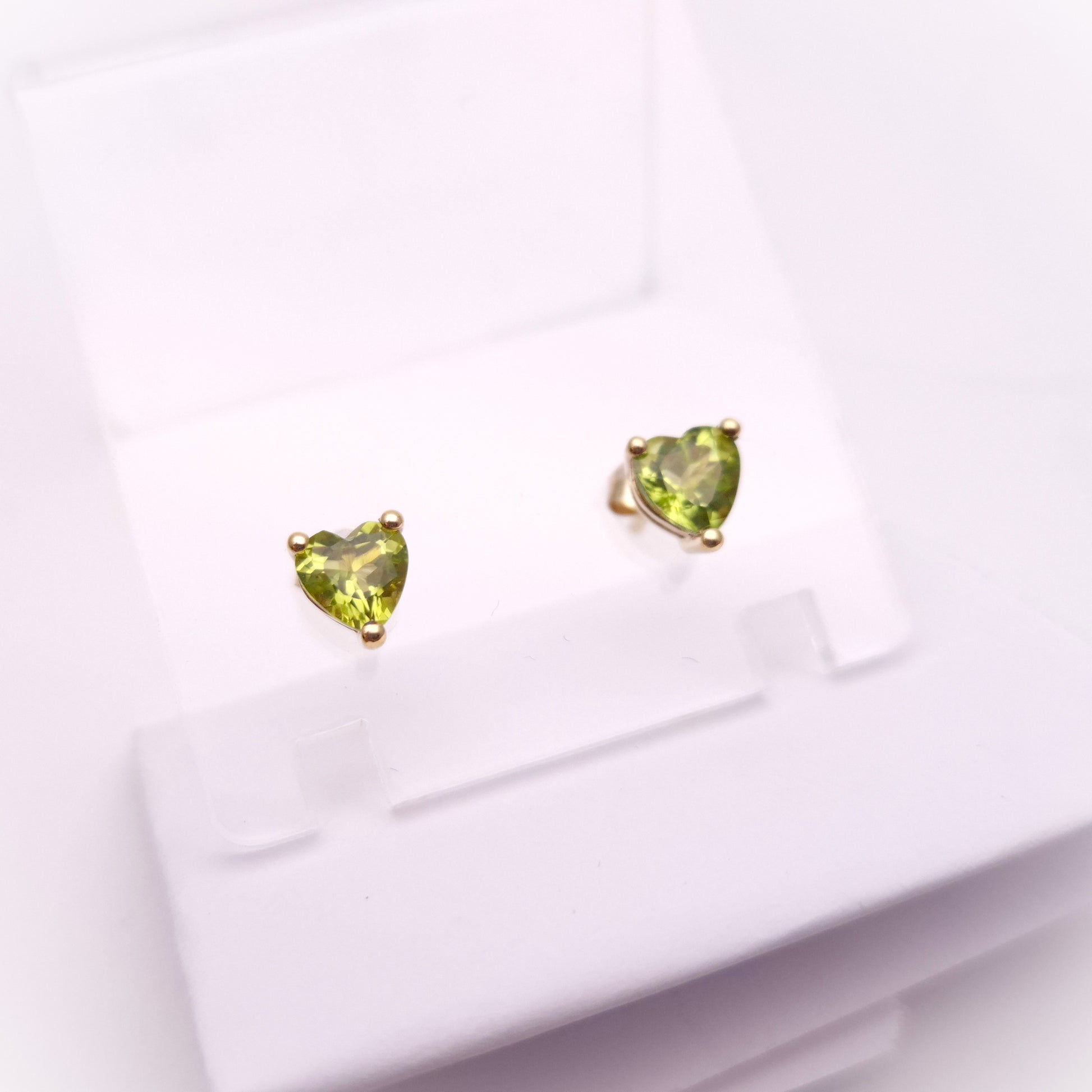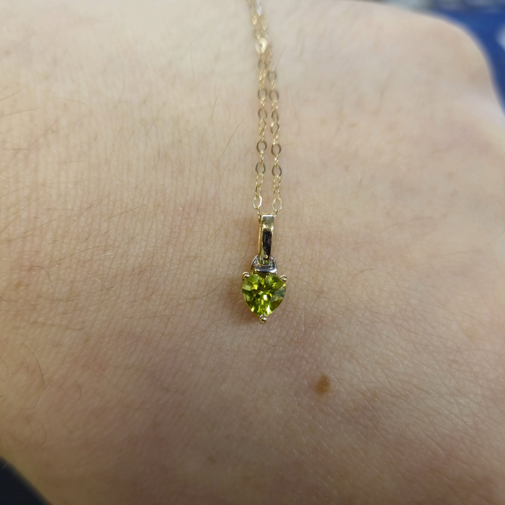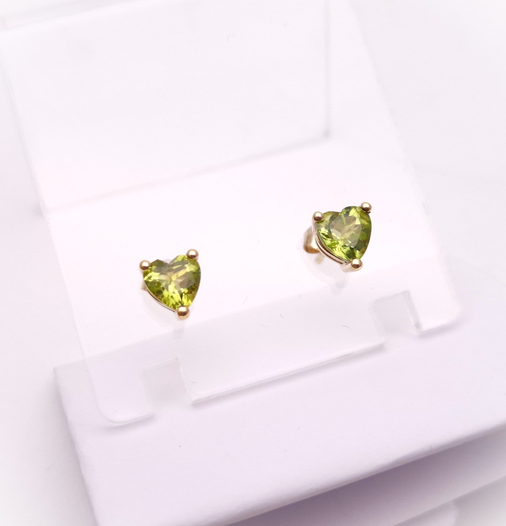 The necklace features a delicate heart-shaped peridot pendant suspended from a fine 9ct yellow gold chain with matching stud earrings also featuring heart-shaped peridots, set in simple yet elegant 9ct yellow gold settings.