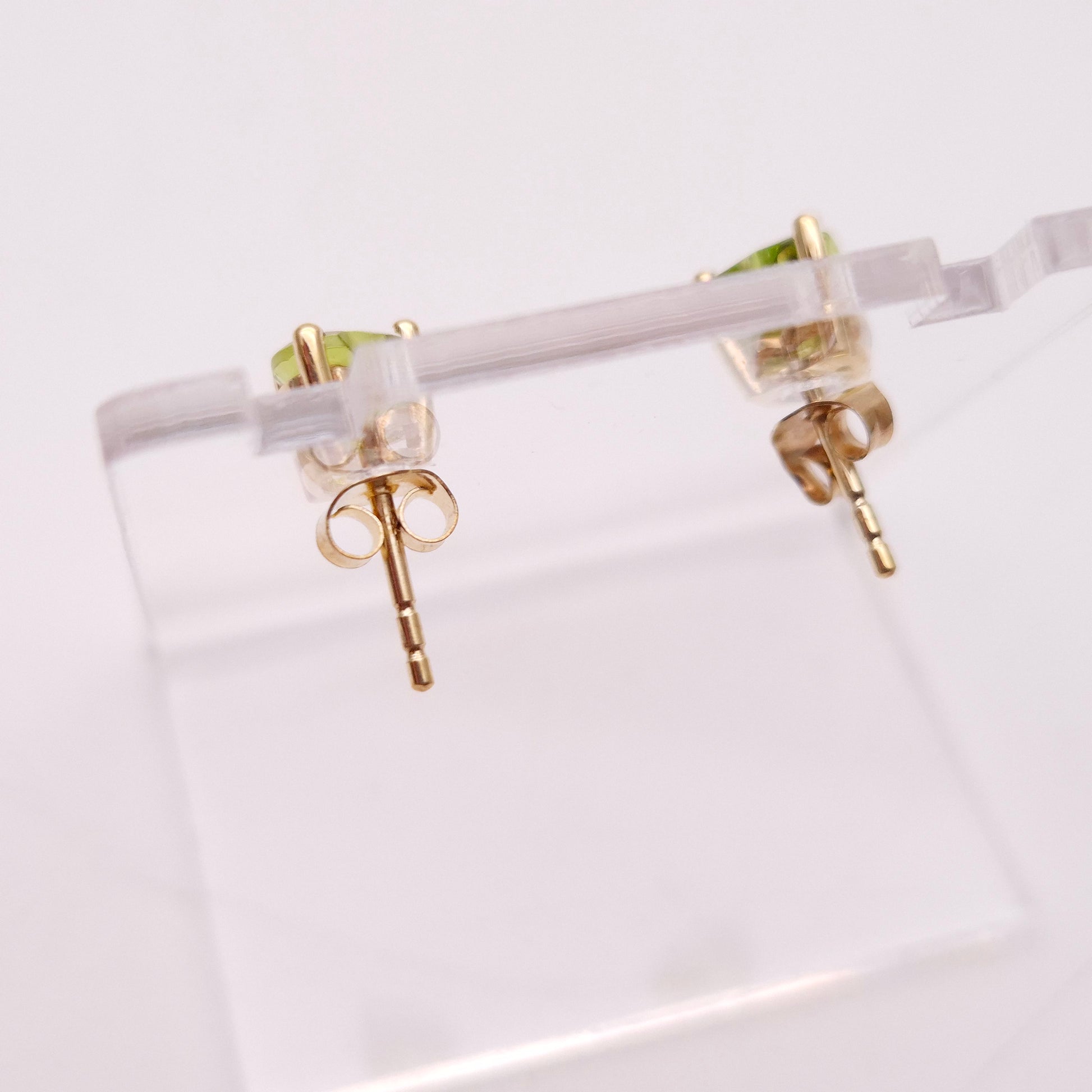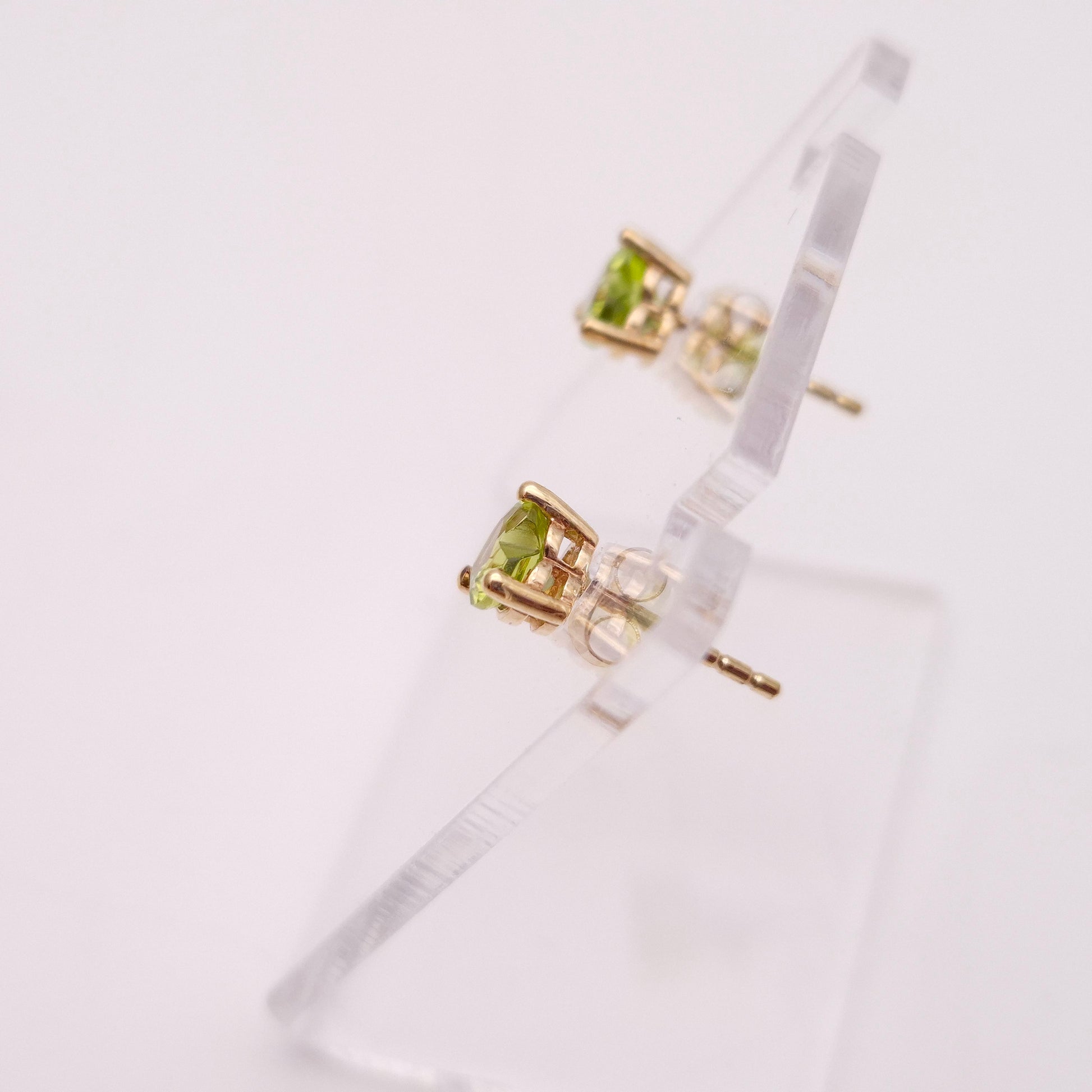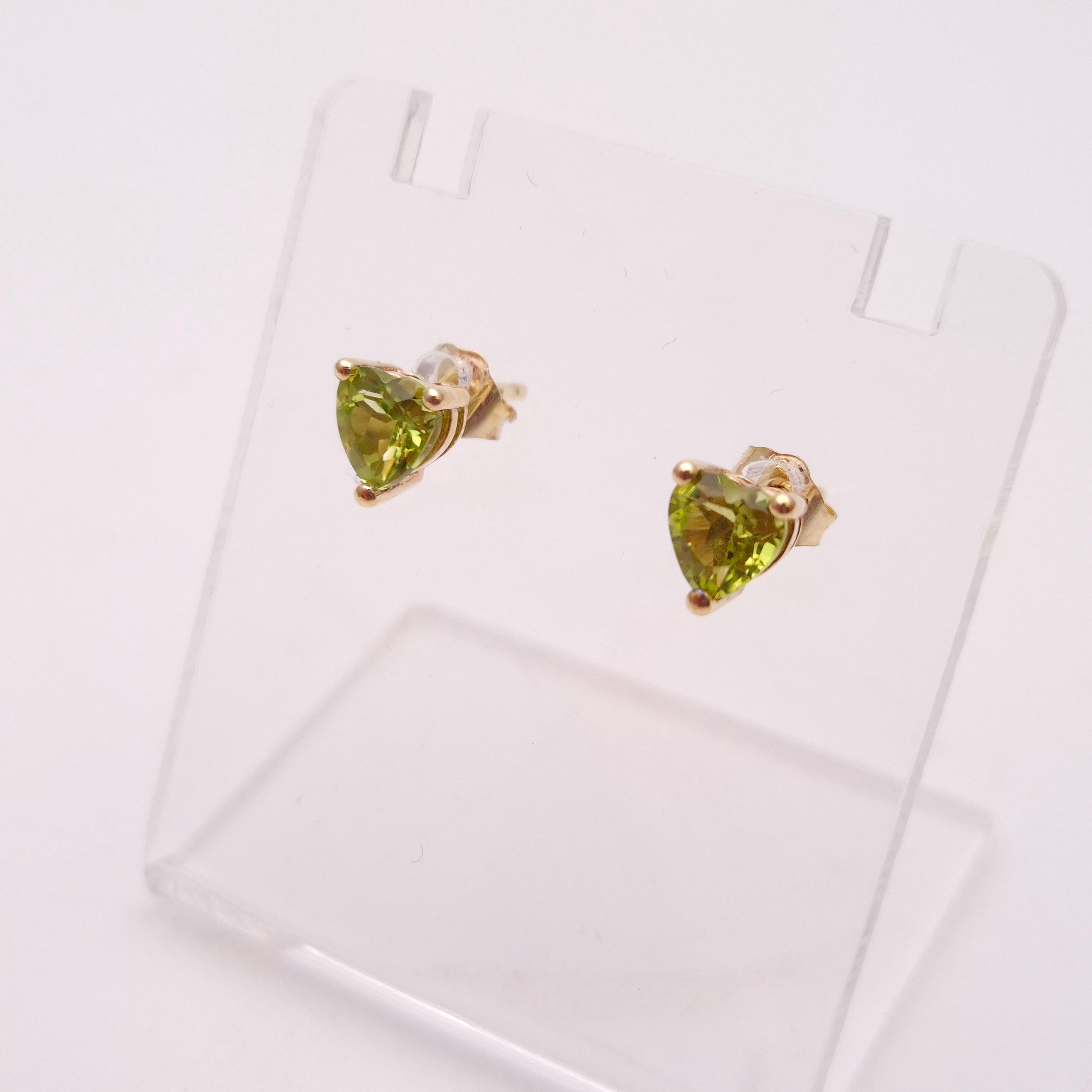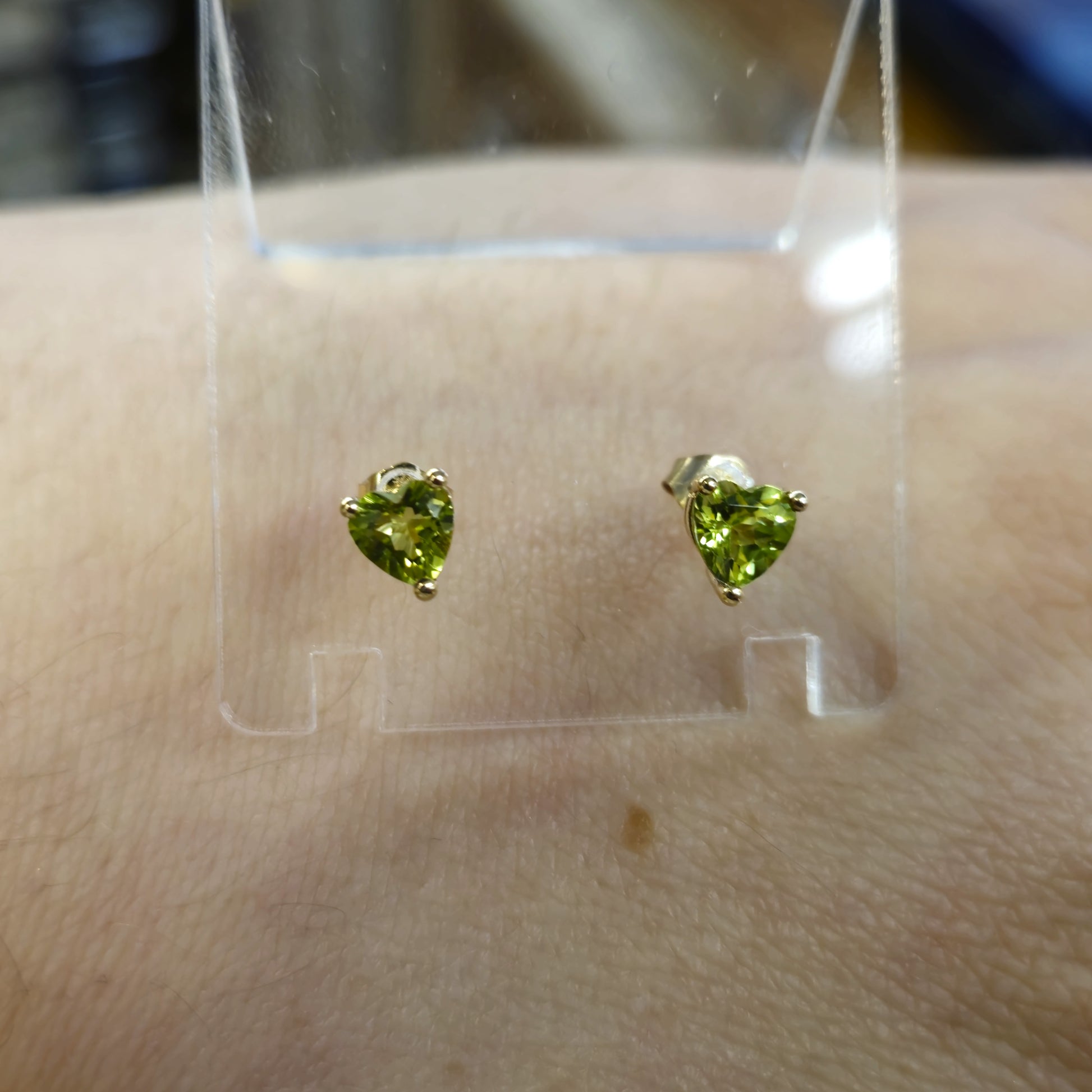 The necklace features a delicate heart-shaped peridot pendant suspended from a fine 9ct yellow gold chain with matching stud earrings also featuring heart-shaped peridots, set in simple yet elegant 9ct yellow gold settings.