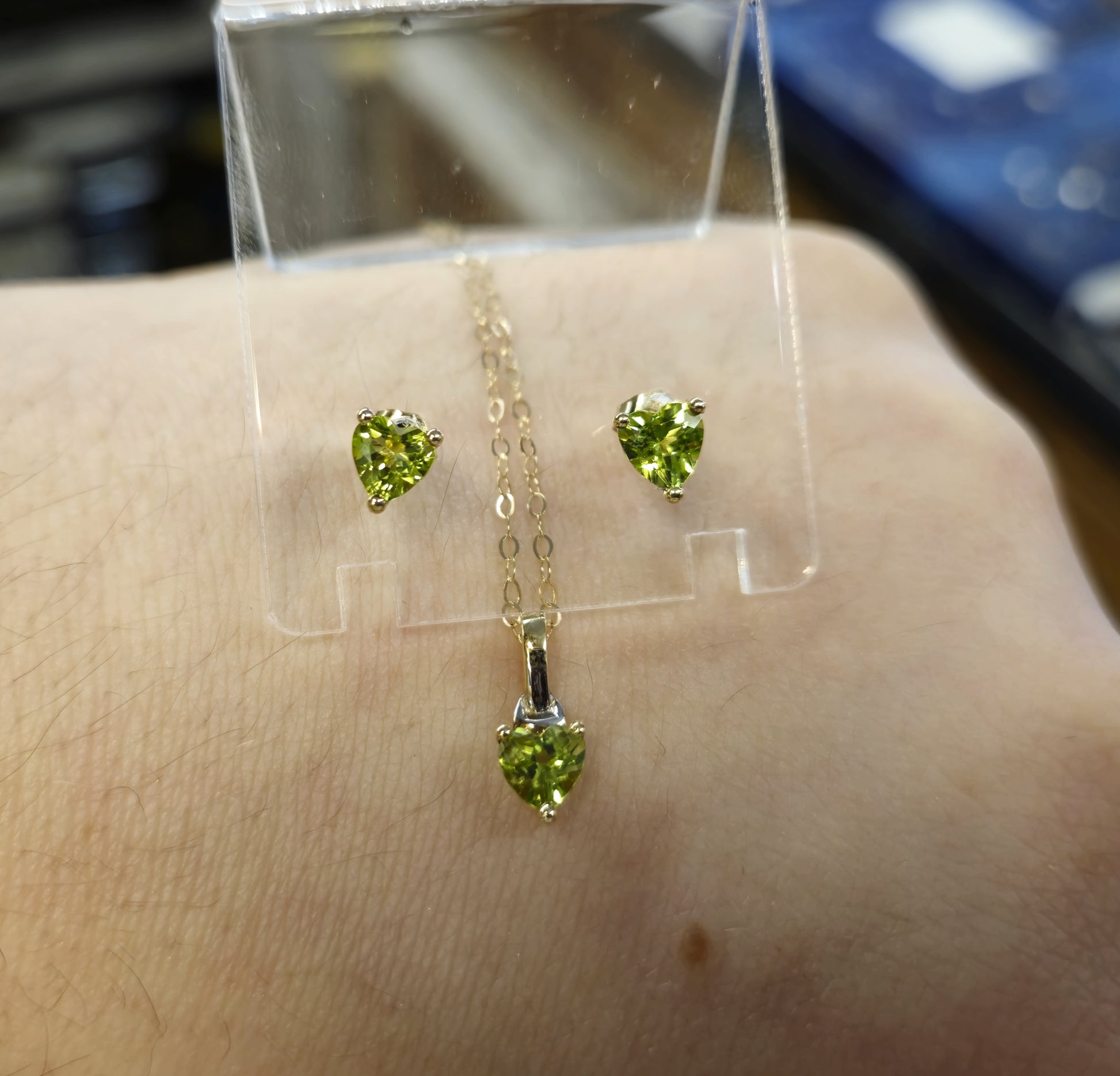 Fall in love with this sweet and vibrant 9ct yellow gold necklace and earring set. Each piece features a beautiful heart-shaped peridot gemstone, showcasing a lovely, bright green hue. The warm glow of the 9ct yellow gold perfectly complements the fresh, lively colour of the peridot, creating a charming and eye-catching ensemble.