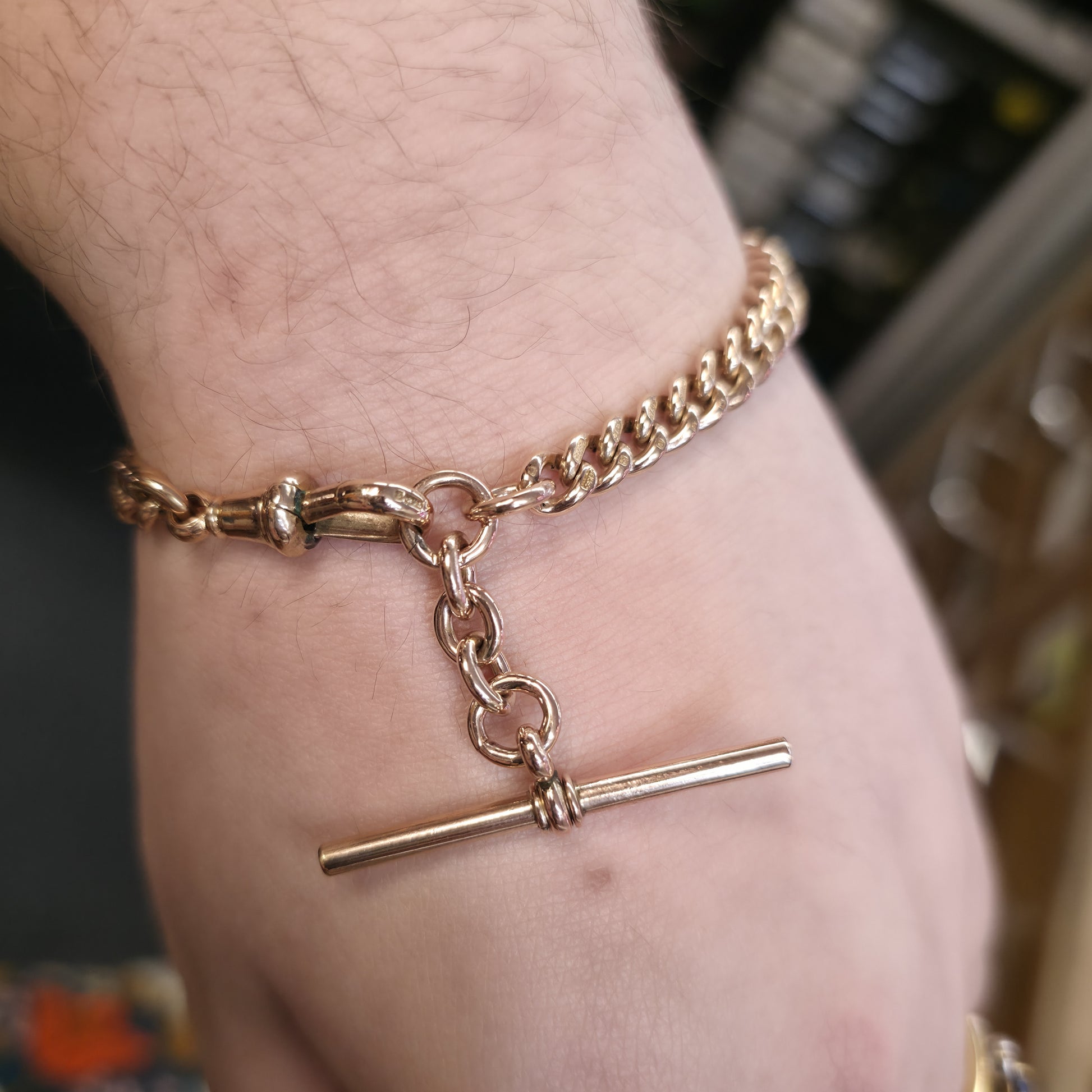 True to the classic Albert watch-chain style, this bracelet is finished with authentic hardware, including a polished T-bar and a robust swivel dog clip. Each curb link is meticulously crafted with a smooth finish and each individually stamped for 9ct. The substantial nature of the links makes this a highly durable piece, perfect for those who appreciate the weight and presence of traditional gold craftsmanship.