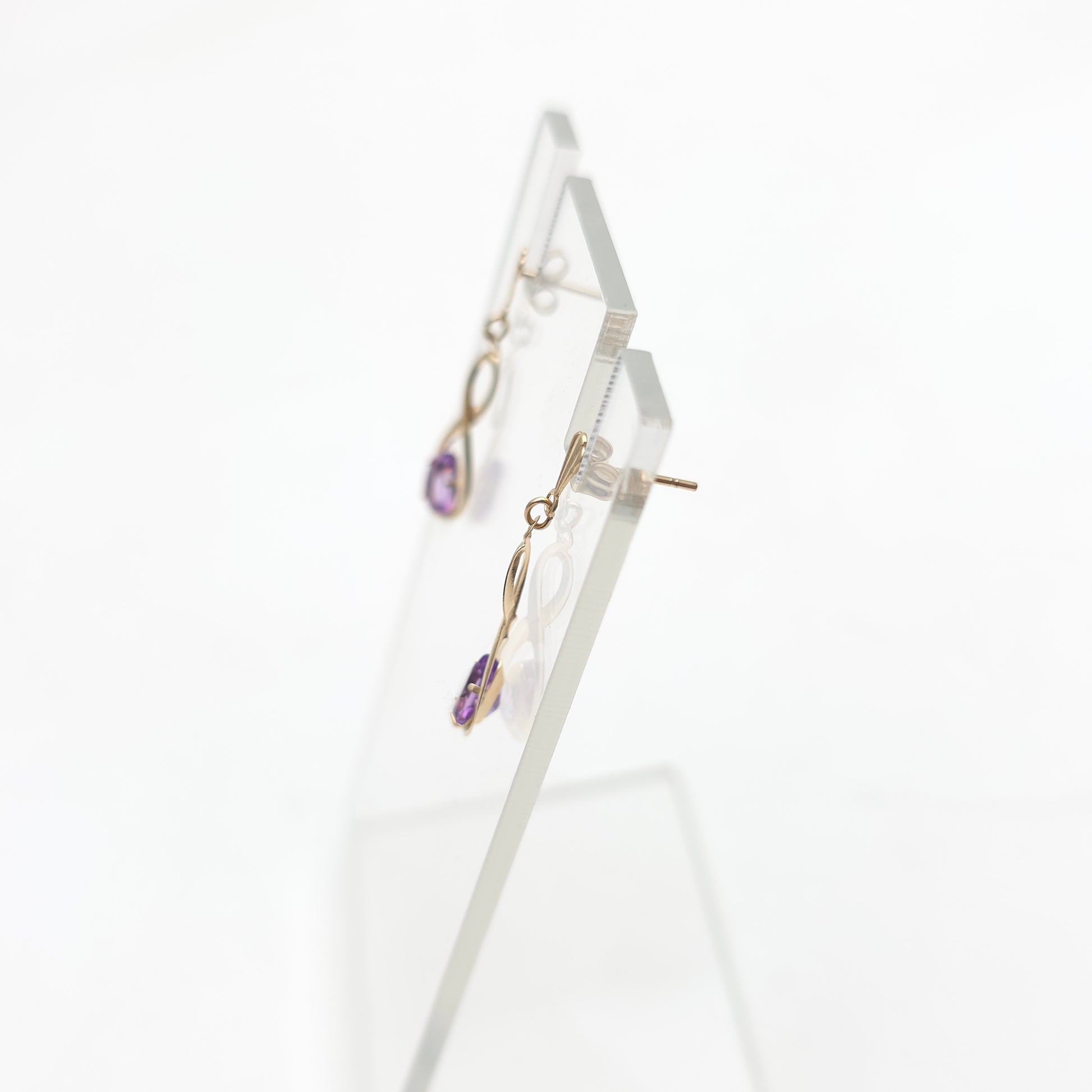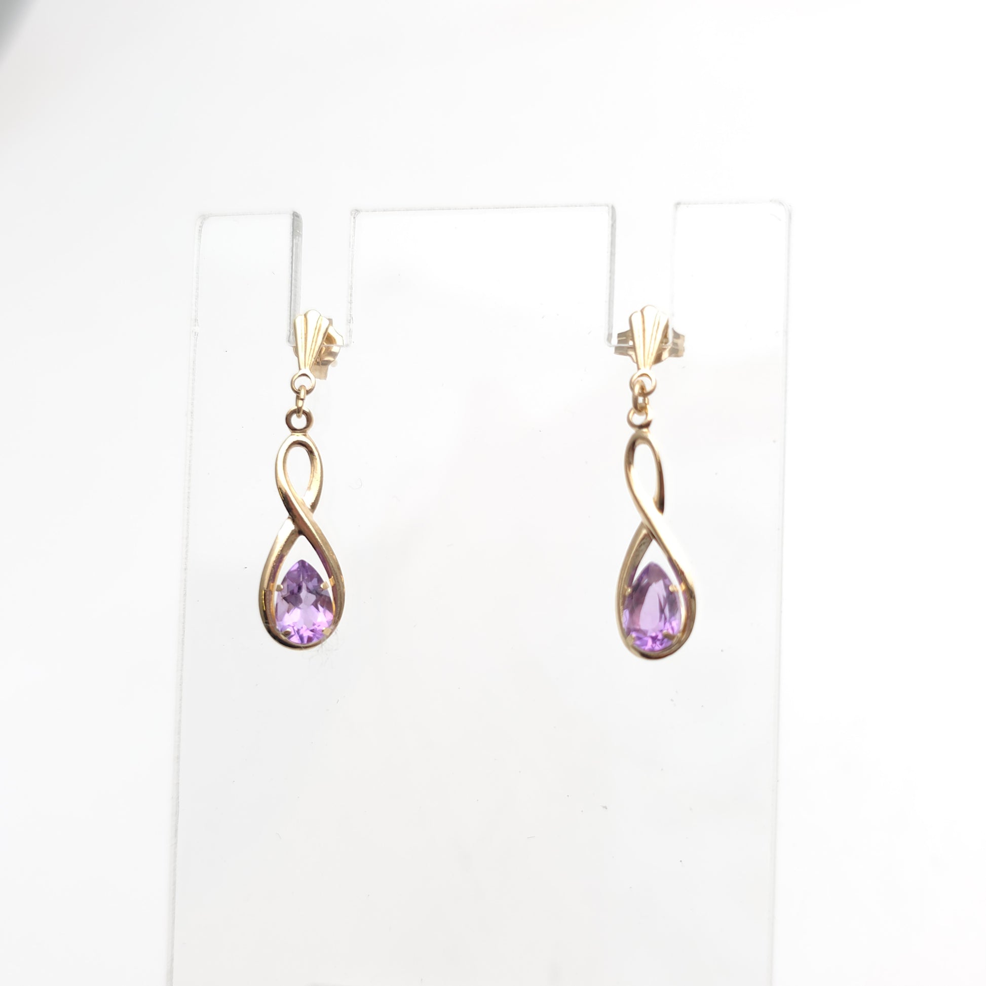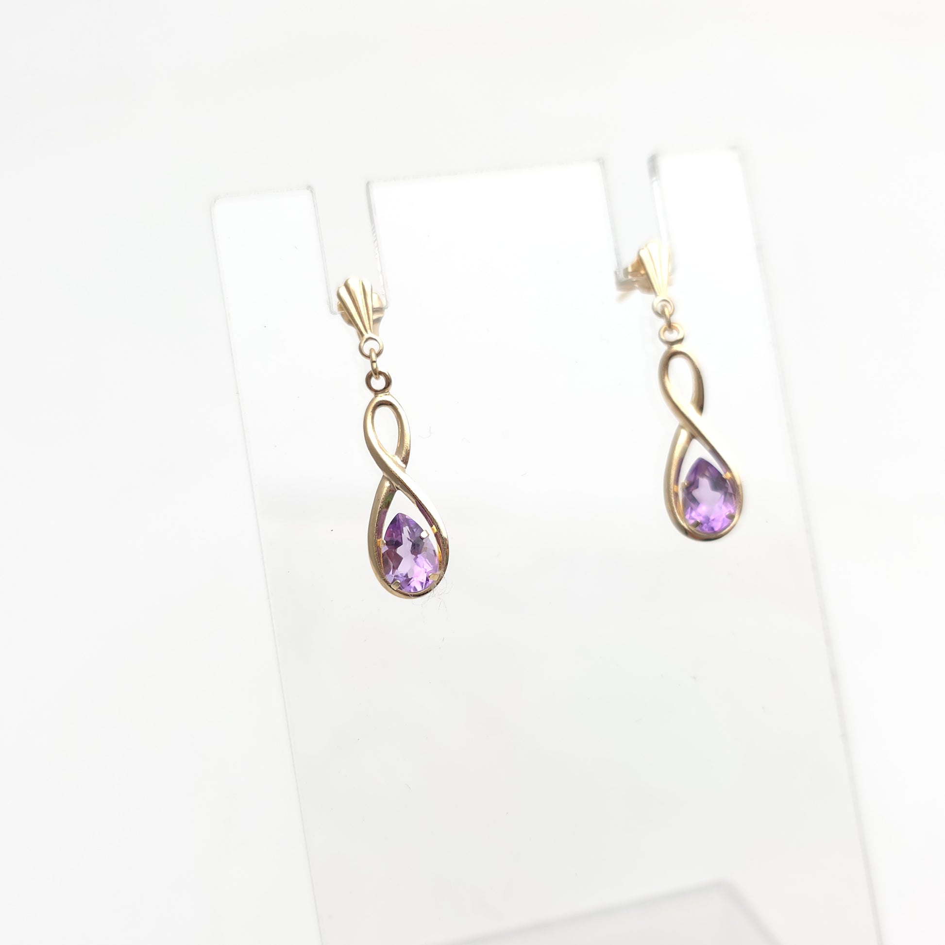 These elegant drop earrings feature a graceful "figure-8" or infinity-style silhouette, expertly crafted in polished 9ct yellow gold. Each earring is set with a vibrant, pear-cut amethyst that dangles delicately within the lower loop of the gold frame. The amethysts boast a beautiful, clear violet-purple hue, faceted to capture the light with every movement.