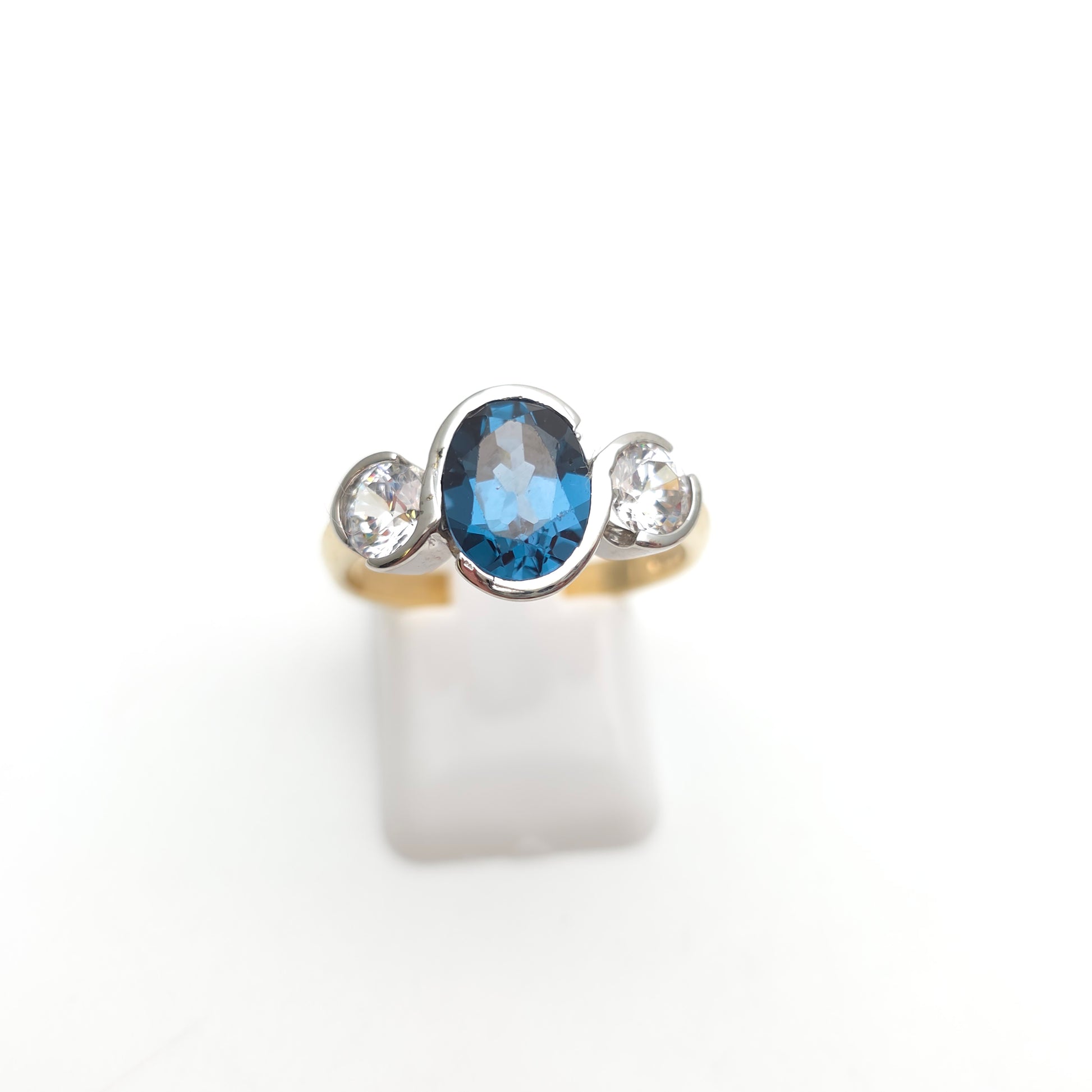 The centrepiece of this ring is a large, Oval-Cut London Blue Topaz Gemstone. The striking Topaz is flanked on either side by a sparkling Round Cubic Zirconia (CZ), completing the traditional Trilogy Design. The three stones are symbolically said to represent the past, present, and future, making the ring highly meaningful.