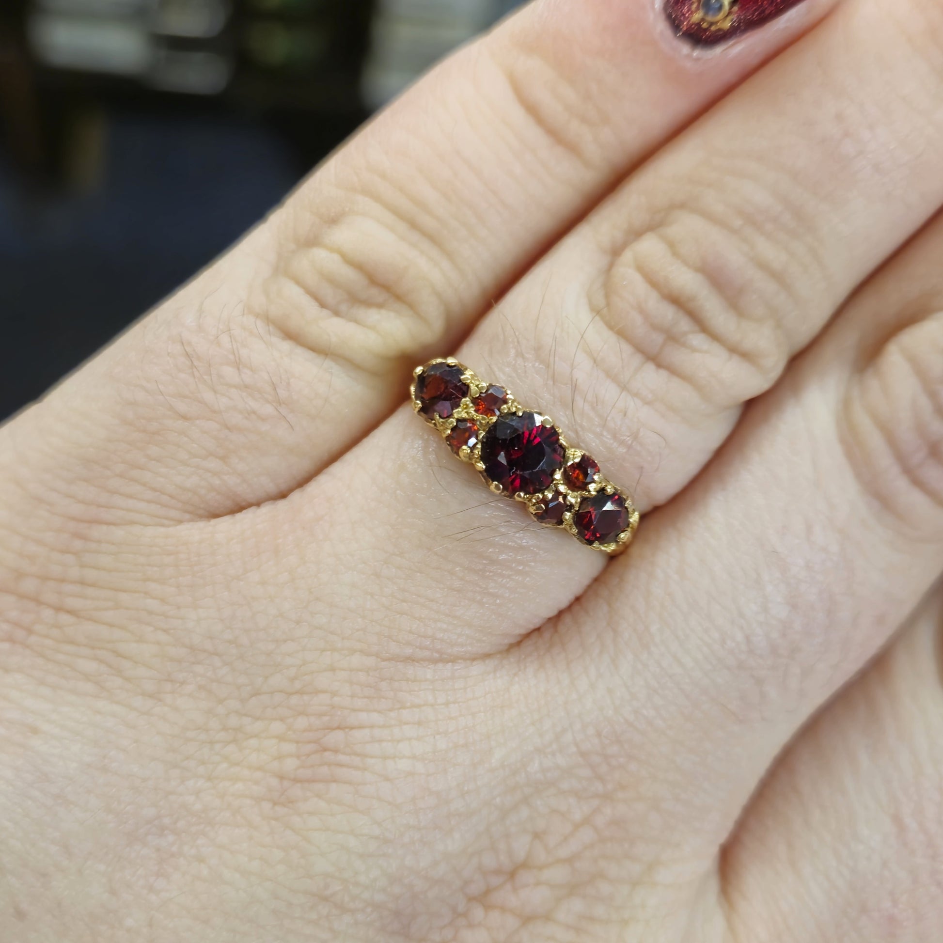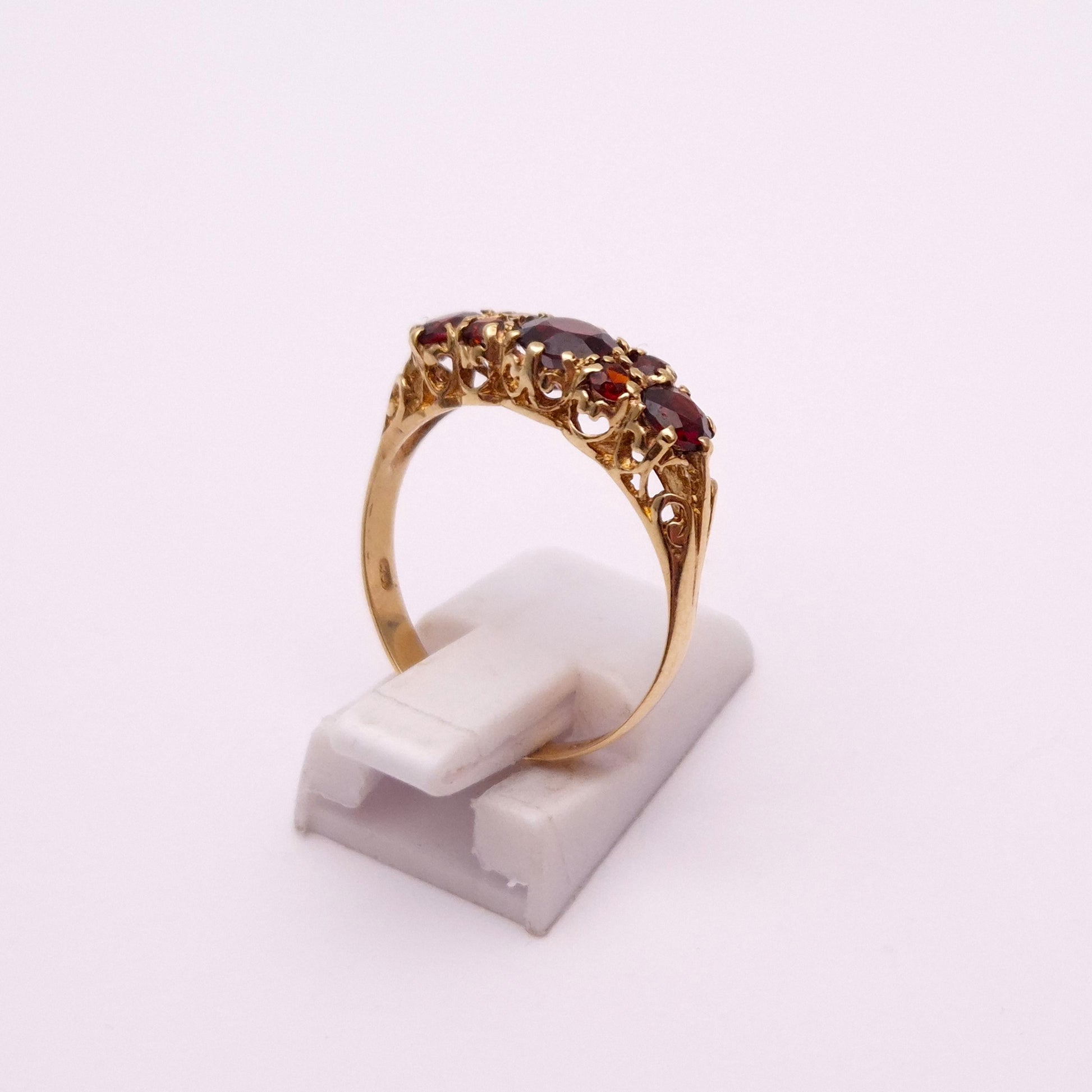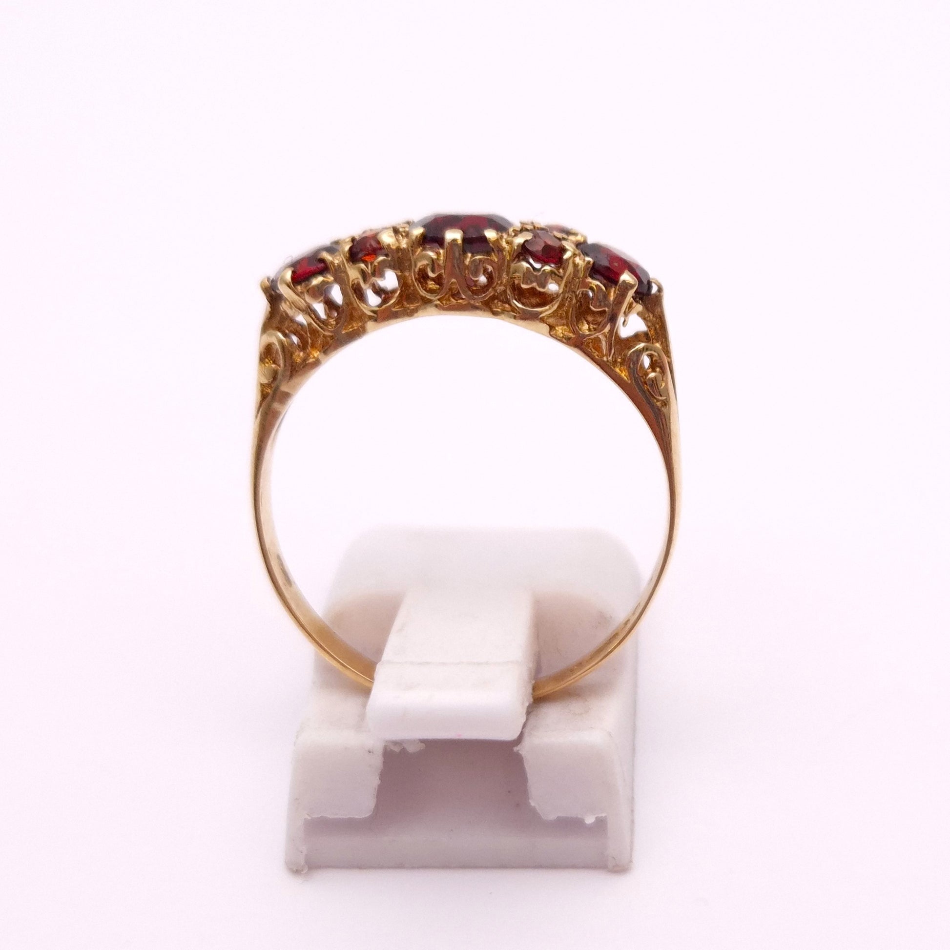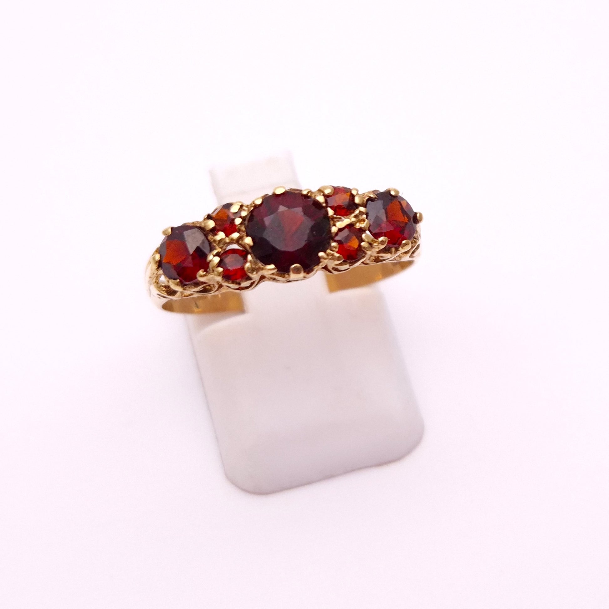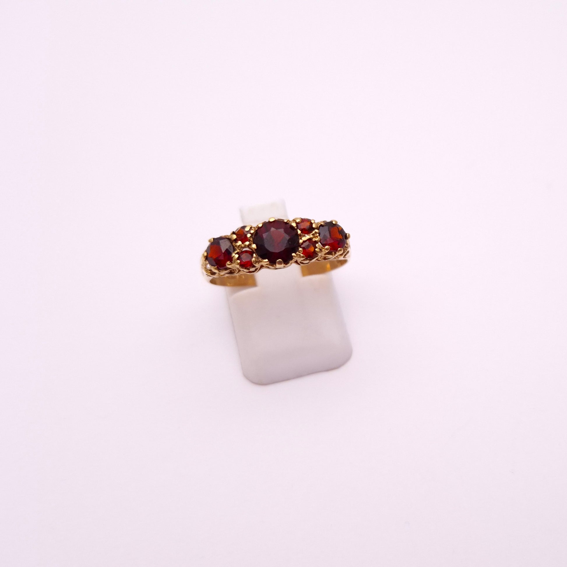 A lovely comfortable classic ring made from 9ct yelllow gold in a traditional 7 stone setting with 3 larger stones and 4 smaller stones separating them. The bridge has some intricate cut out detailing leading to the plain polished band.