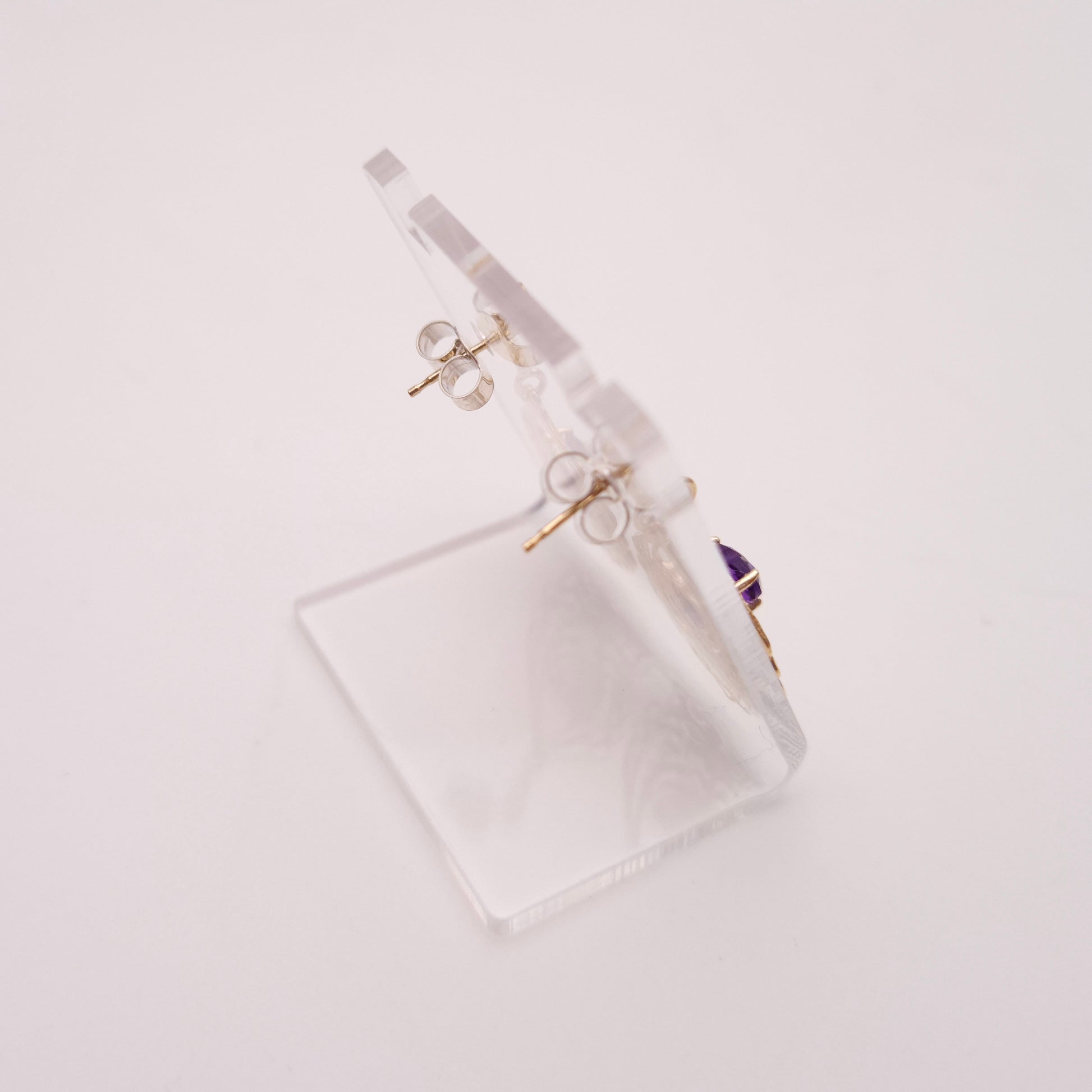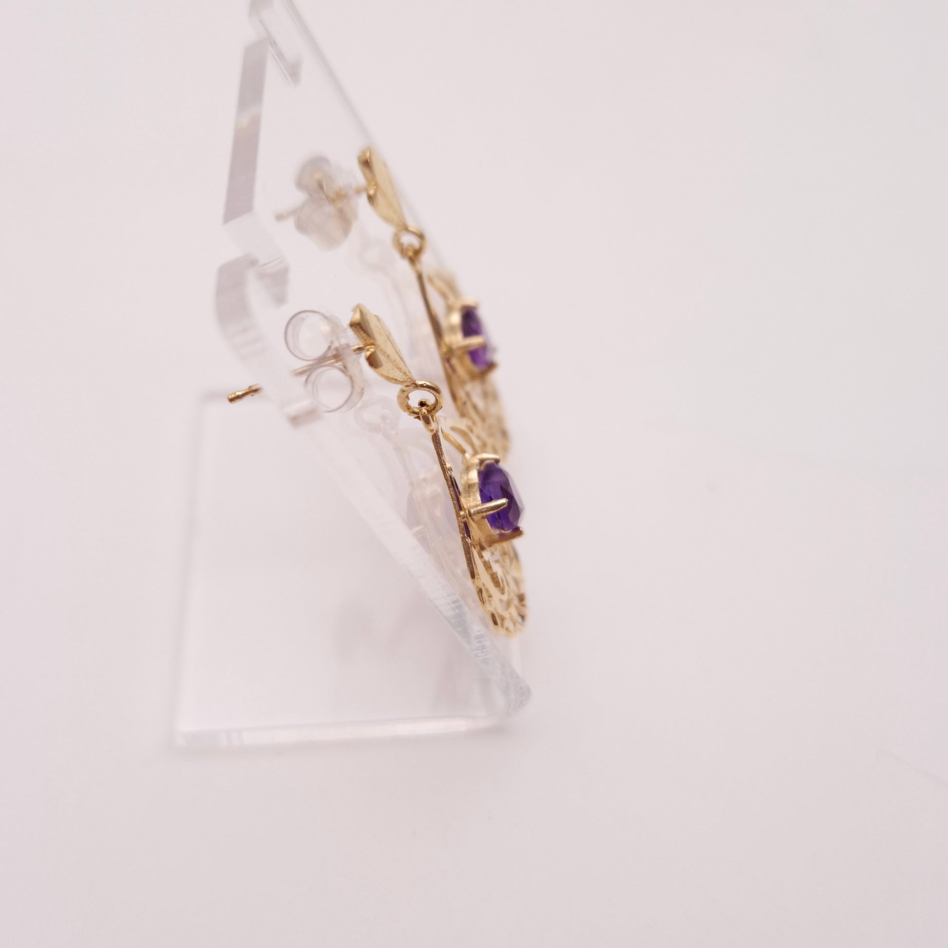 The earrings dangle elegantly and are secured with a decorative gold post fitting. The combination of the bold purple Amethyst, the intricate gold work, and the heart shape makes these earrings exceptionally romantic and eye-catching. They are perfect for special occasions or as a memorable gift for a loved one who appreciates vintage-style jewellery and bold colour