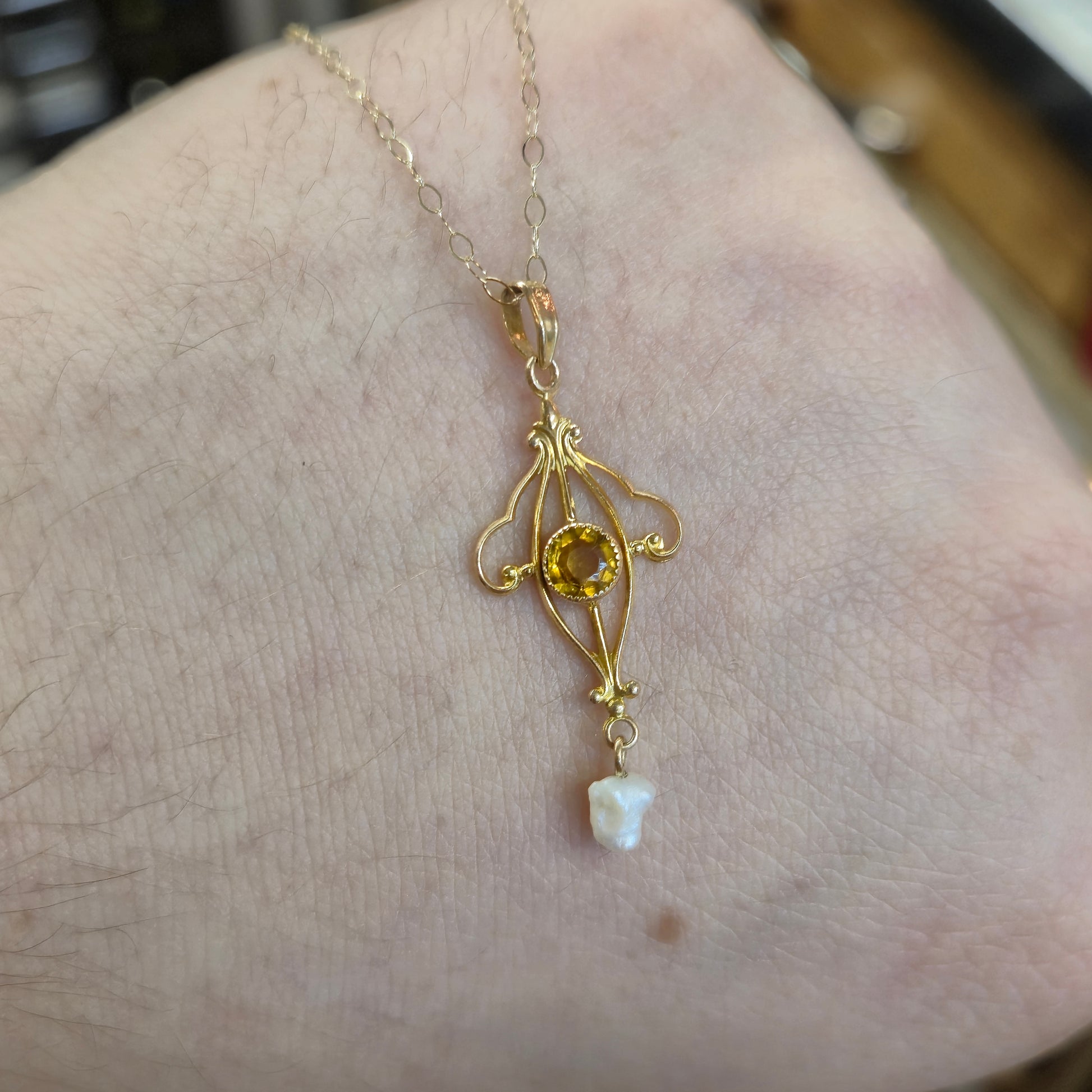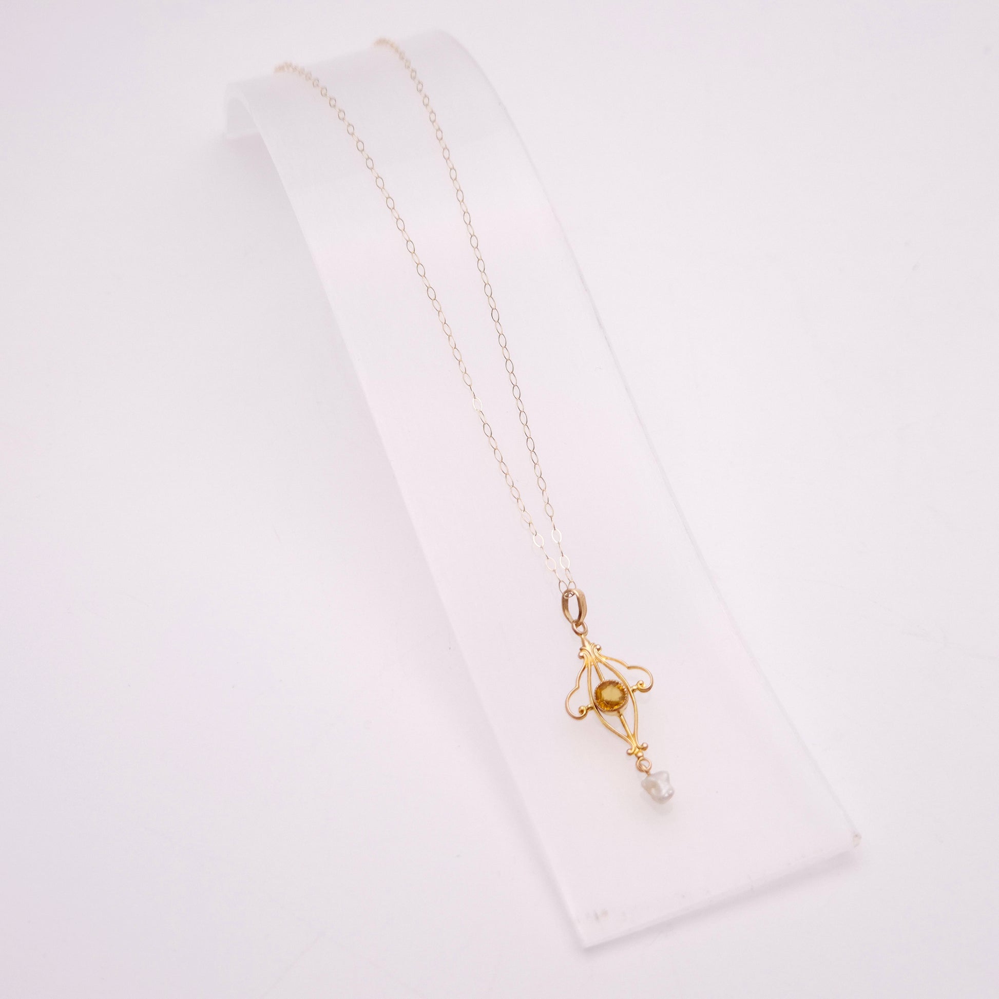 The design of the pendant is characterized by elegant Openwork Filigree and scrolling lines, typical of Edwardian or Art Nouveau Reproduction styles. The central element is a single Round-Cut Orange Paste gemstone, which glows with a warm, amber-like hue, mounted securely within the intricate gold frame. Suspended delicately from the base of the ornate setting is a small, natural-looking Dogtooth Pearl, which provides a soft, luminous contrast and adds movement to the piece.