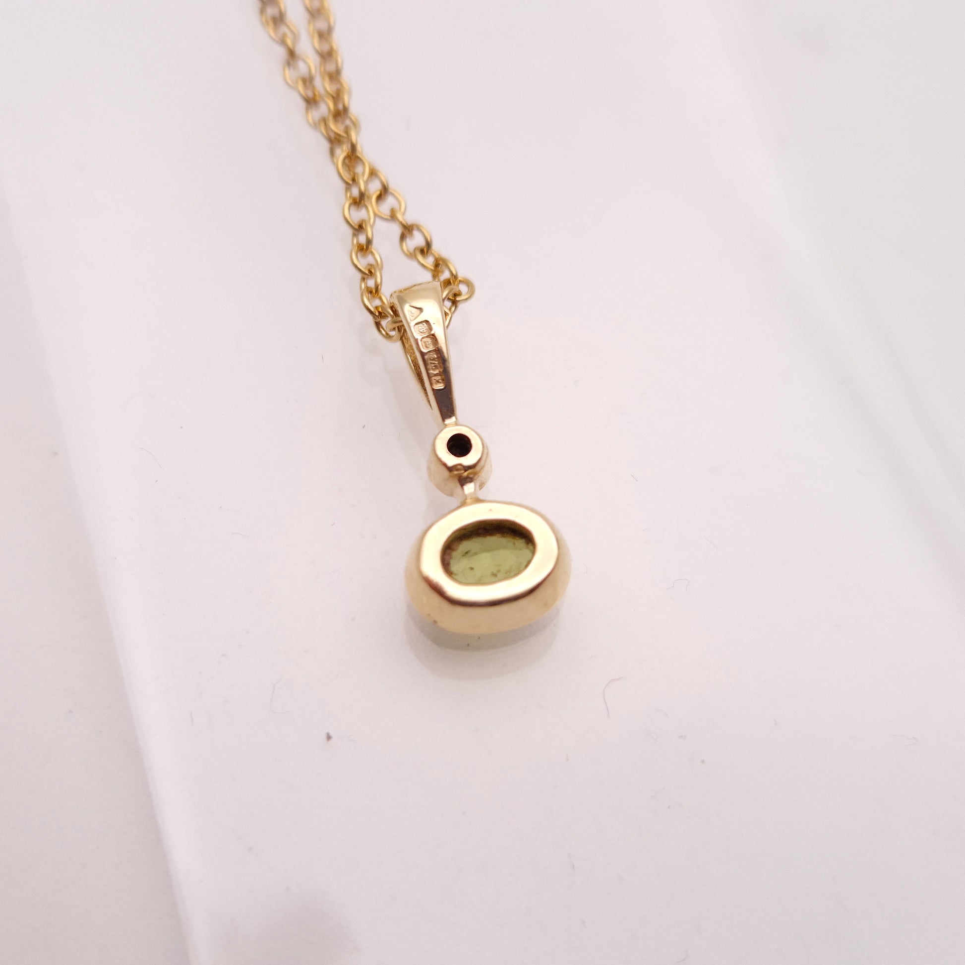 The peridot is held in a warm 9ct yellow gold setting and is accented by a single bezel set round diamond set above the peridot, which provides a brilliant contrast and enhance the central stone's natural beauty. This classic and elegant design makes the pendant a versatile accessory for any occasion.