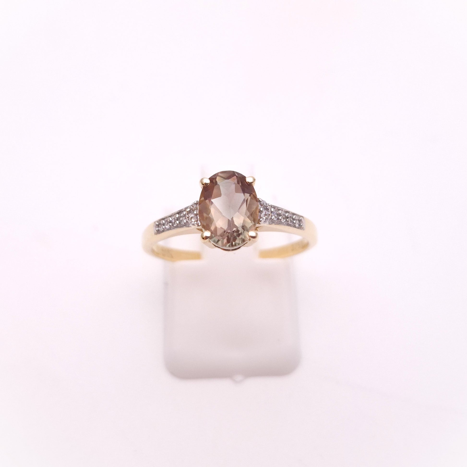 At the centre of this ring is a beautifully cut oval scapolite, a gemstone admired for its subtle yet striking colour-change properties, often displaying a unique blend of earthy browns, yellows, and warm greens. Its distinctive appearance ensures this ring stands out from the crowd. The classic warmth of the 9ct yellow gold setting perfectly complements the gemstone's natural tones. The ring is further enhanced by brilliant diamond shoulders, which add a timeless sparkle and luxury to the design, gracefully framing the central stone.
