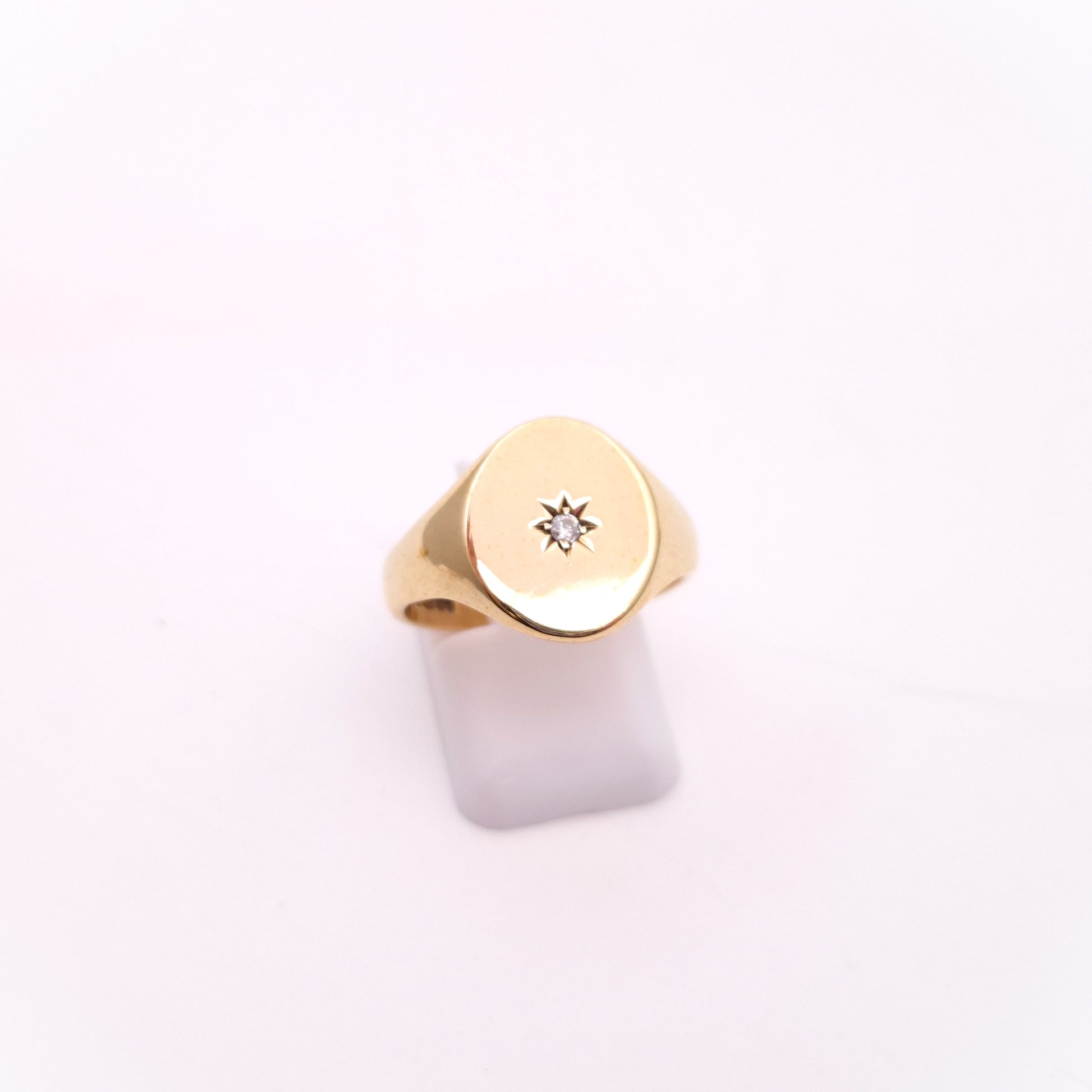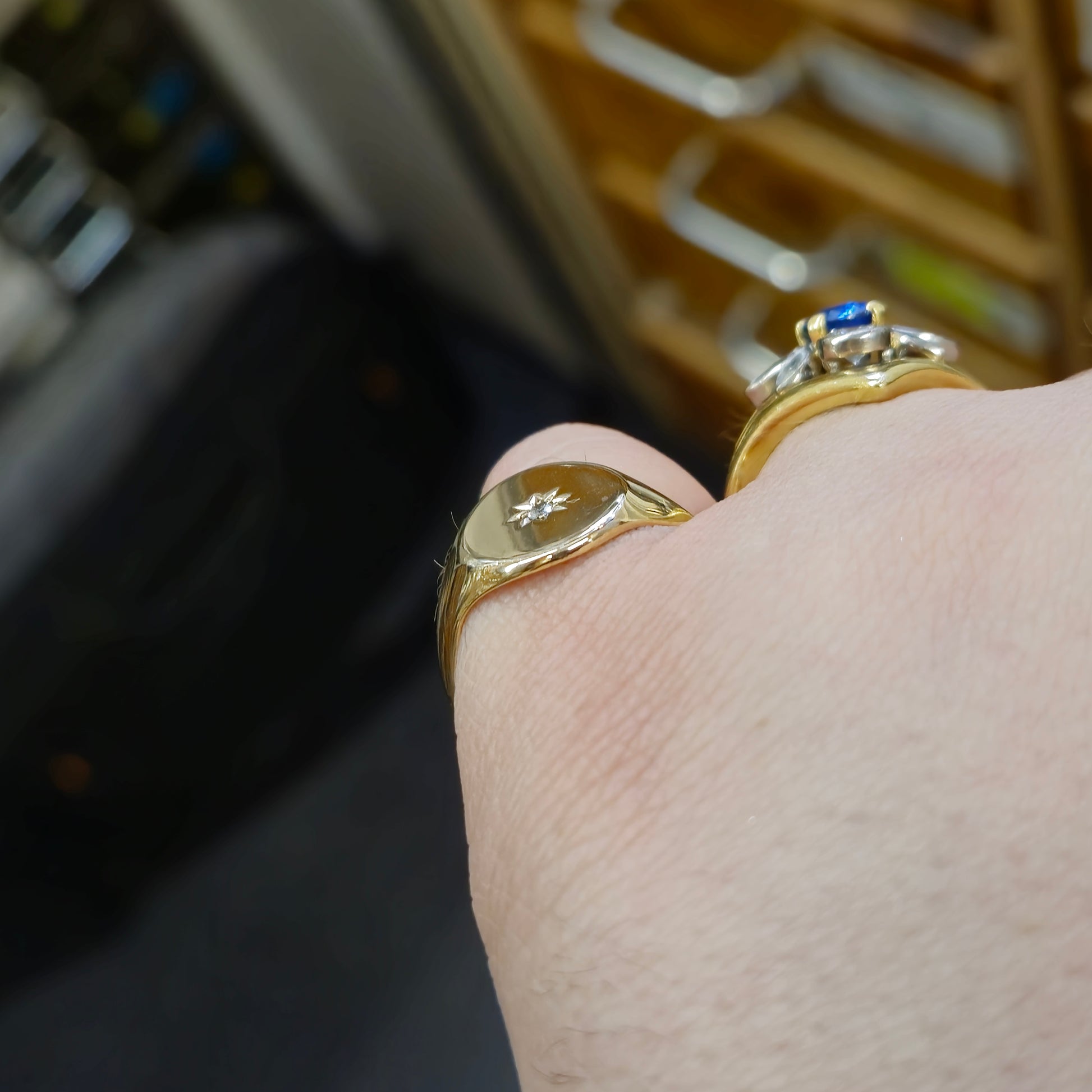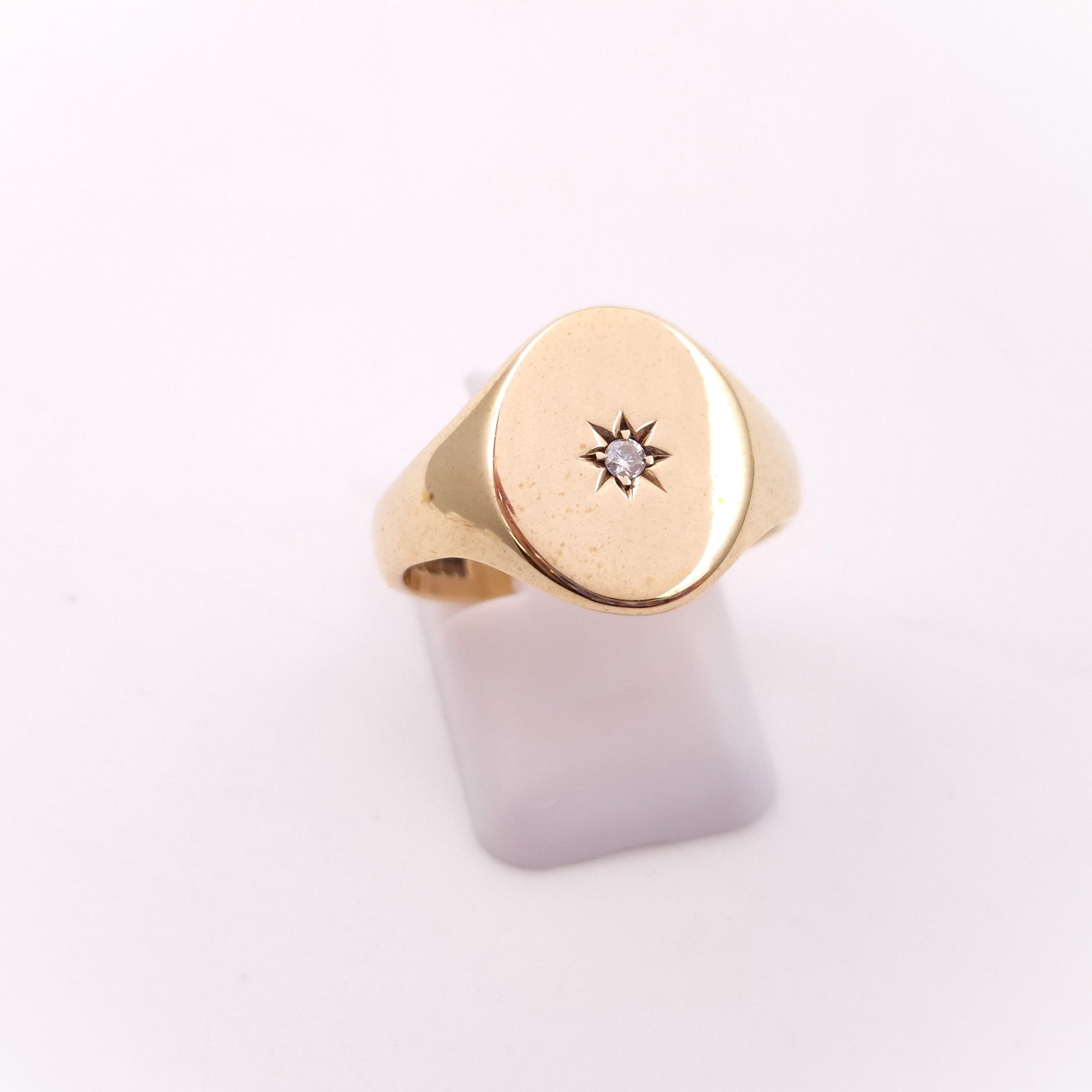Add a touch of classic sophistication to your look with this beautiful 9ct yellow gold signet-style ring. Crafted with a smooth, polished oval face, this ring offers a timeless appeal. The centrepiece is a delicate, sparkling diamond set in a starburst design, catching the light with every movement.