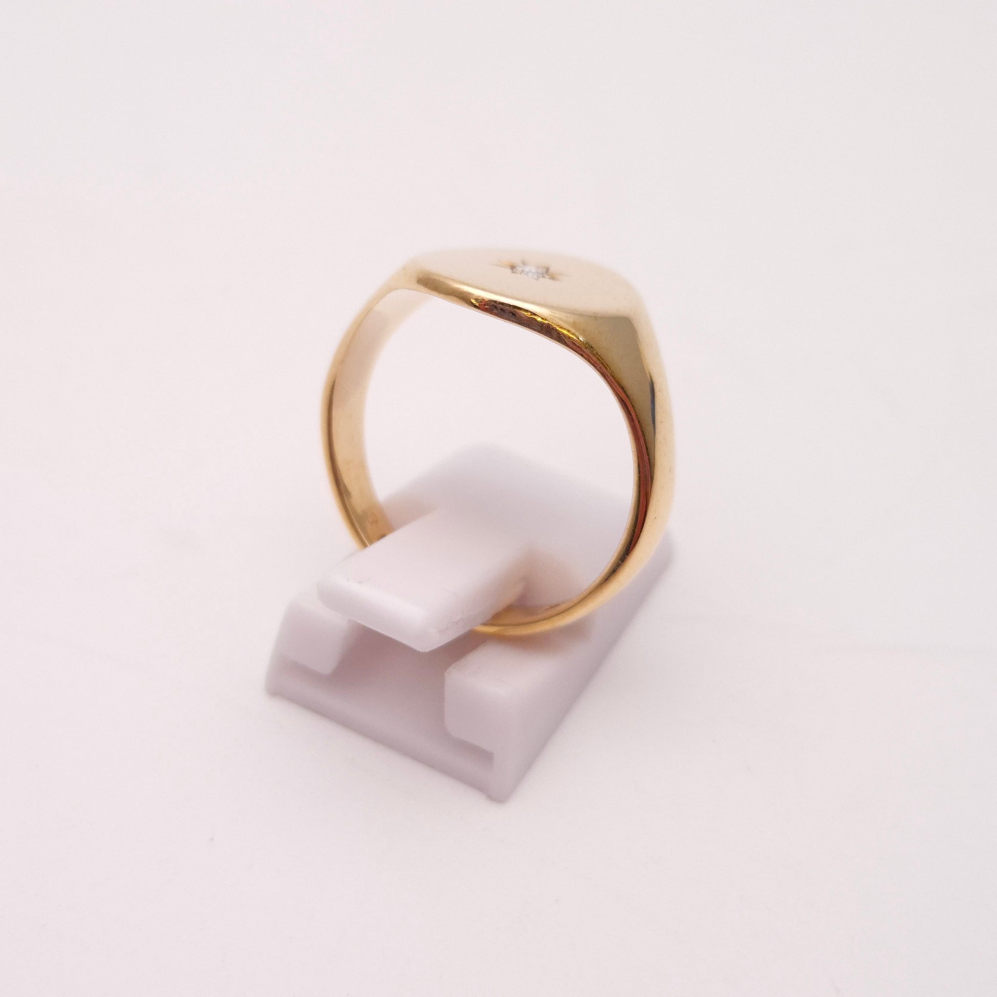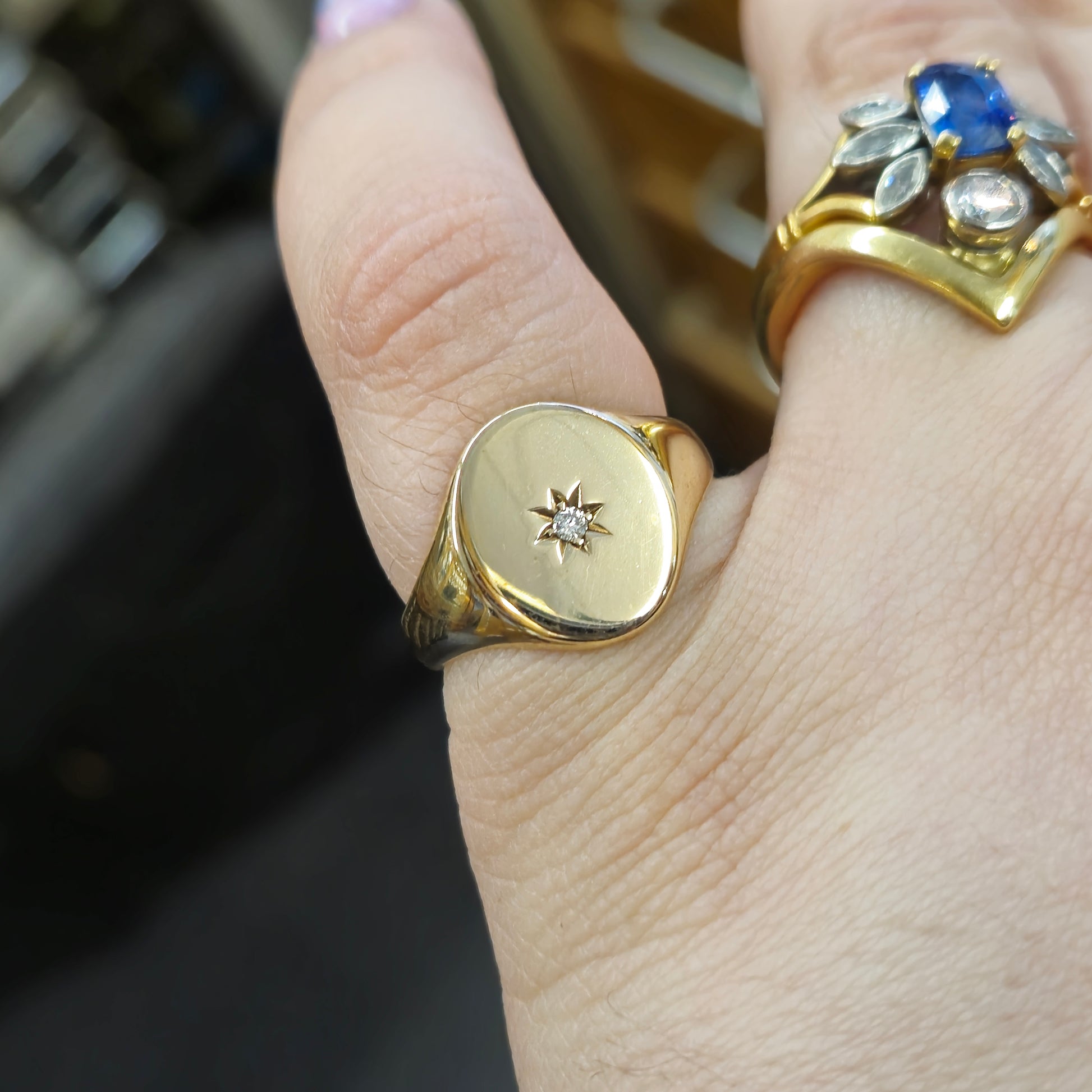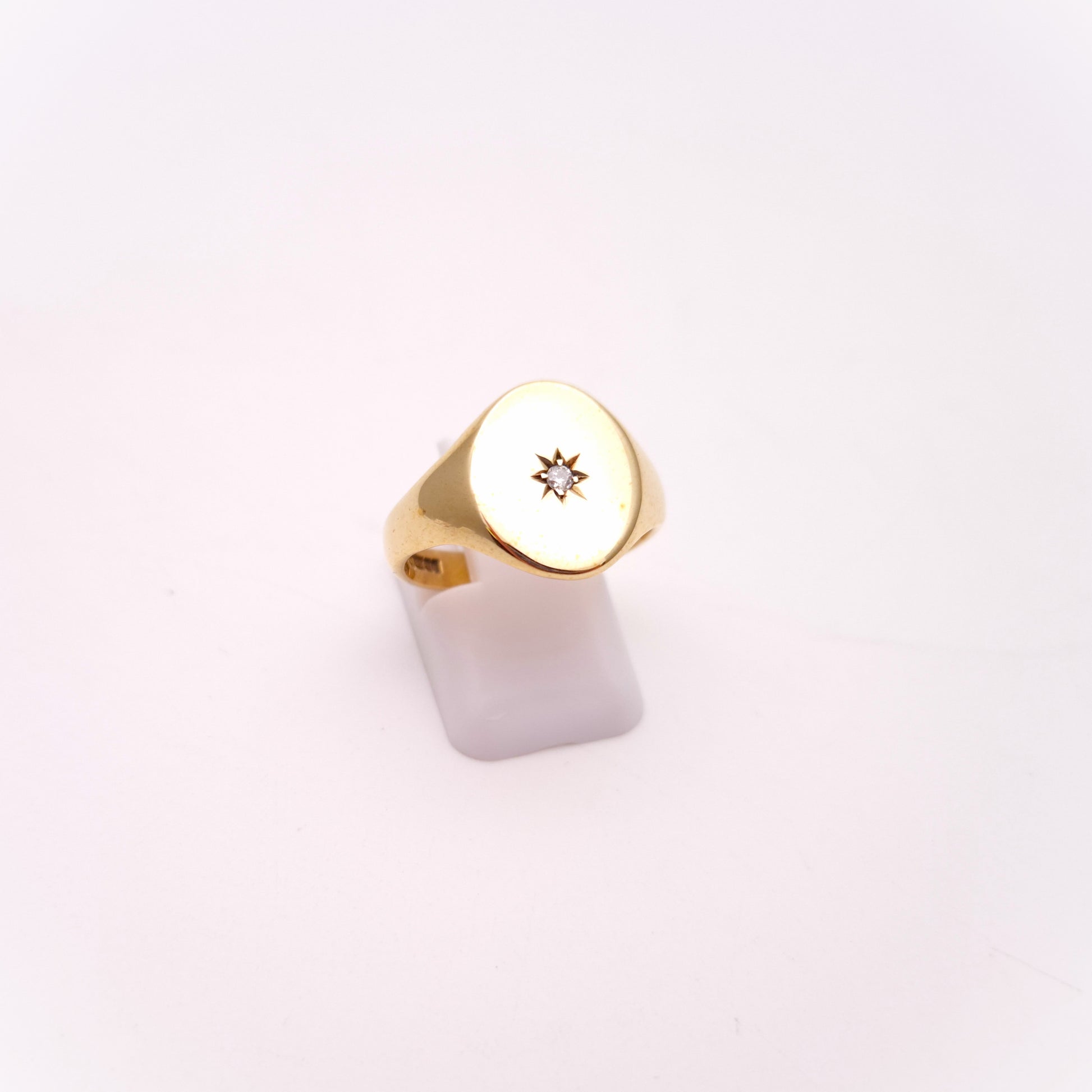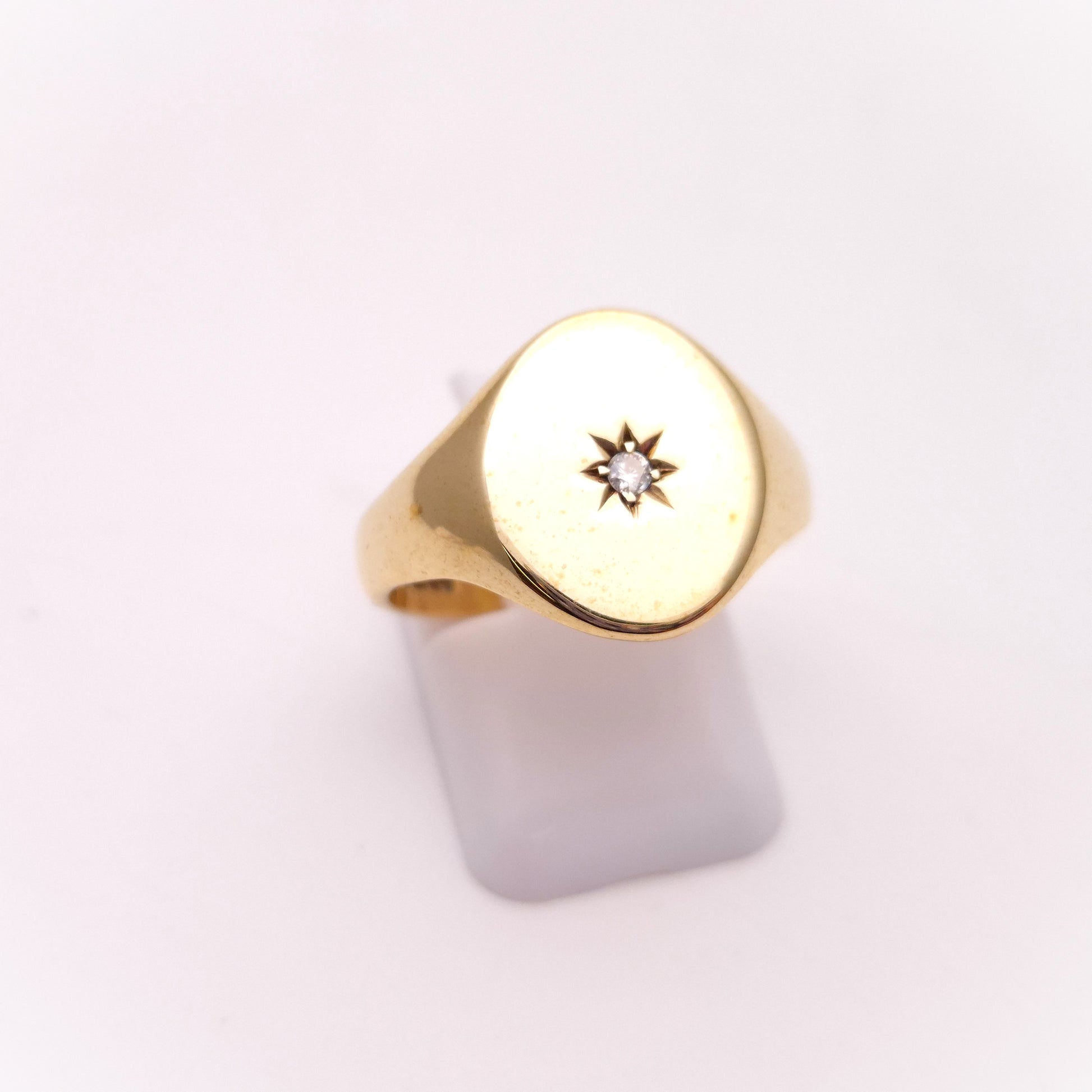Add a touch of classic sophistication to your look with this beautiful 9ct yellow gold signet-style ring. Crafted with a smooth, polished oval face, this ring offers a timeless appeal. The centrepiece is a delicate, sparkling diamond set in a starburst design, catching the light with every movement.
