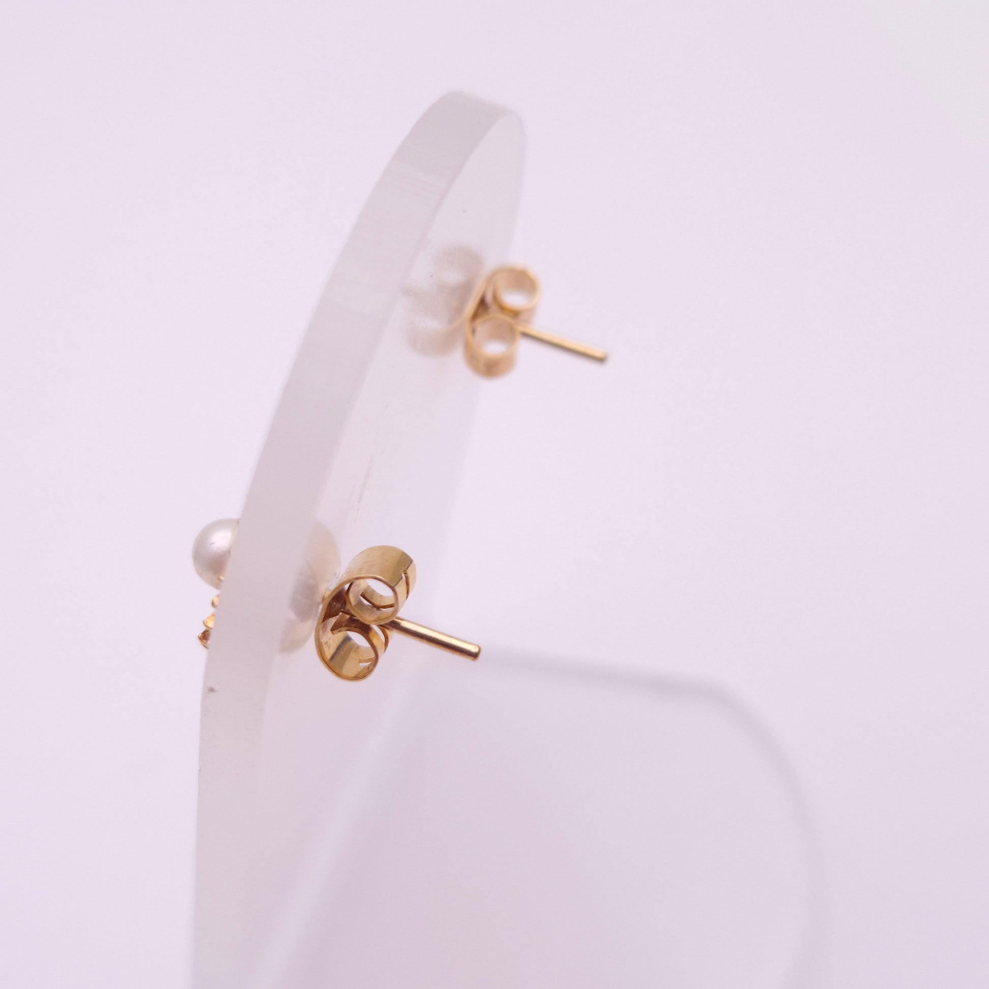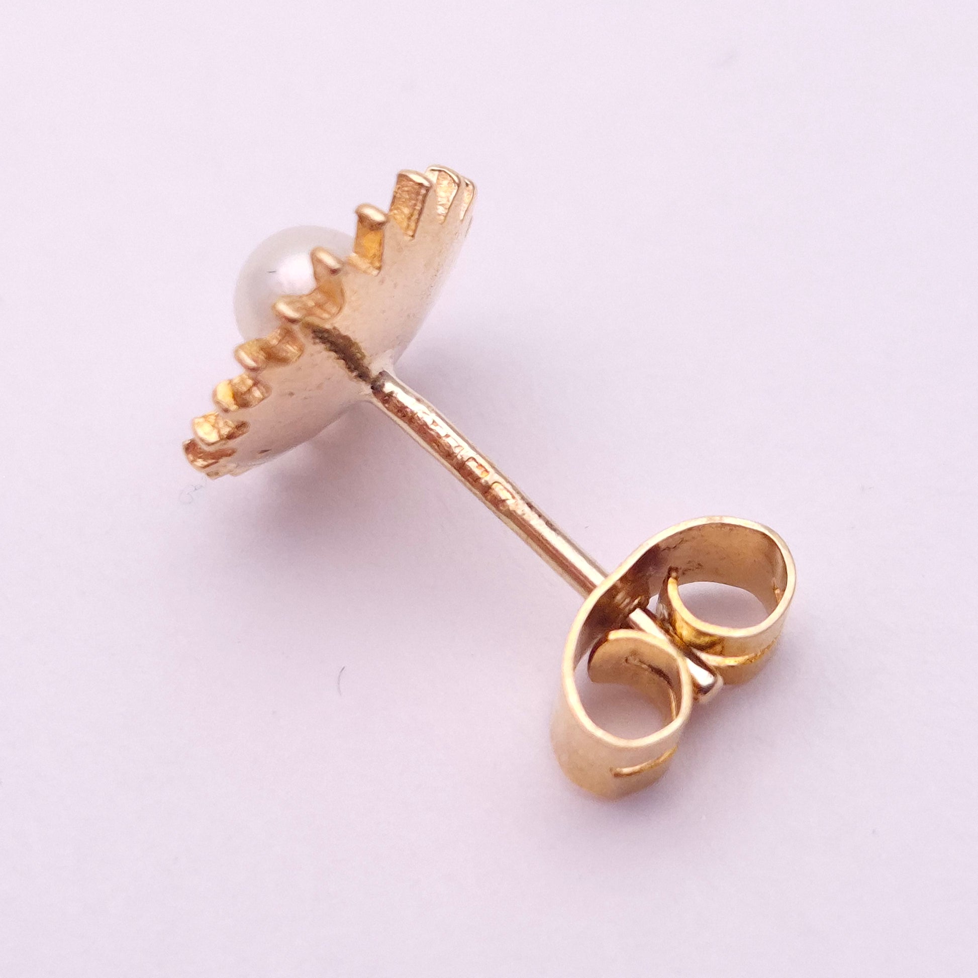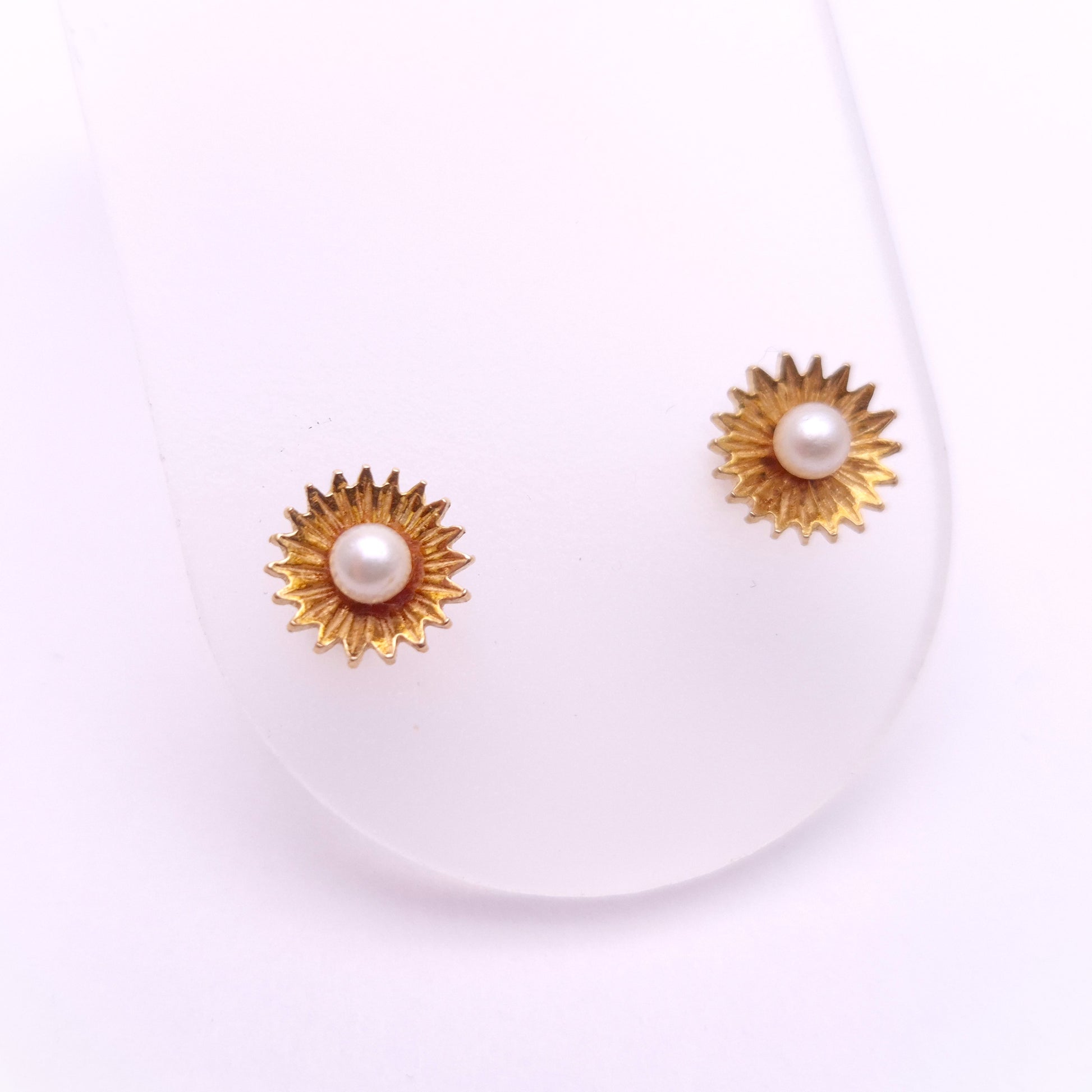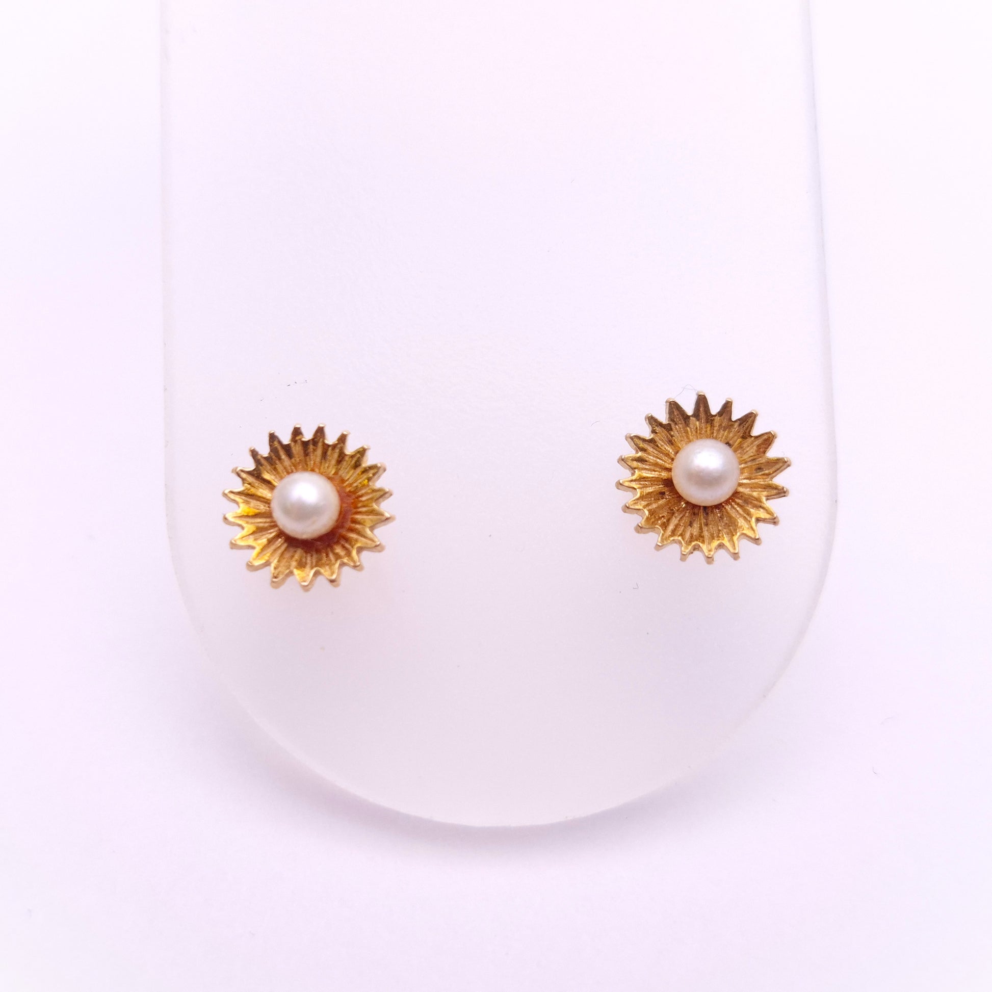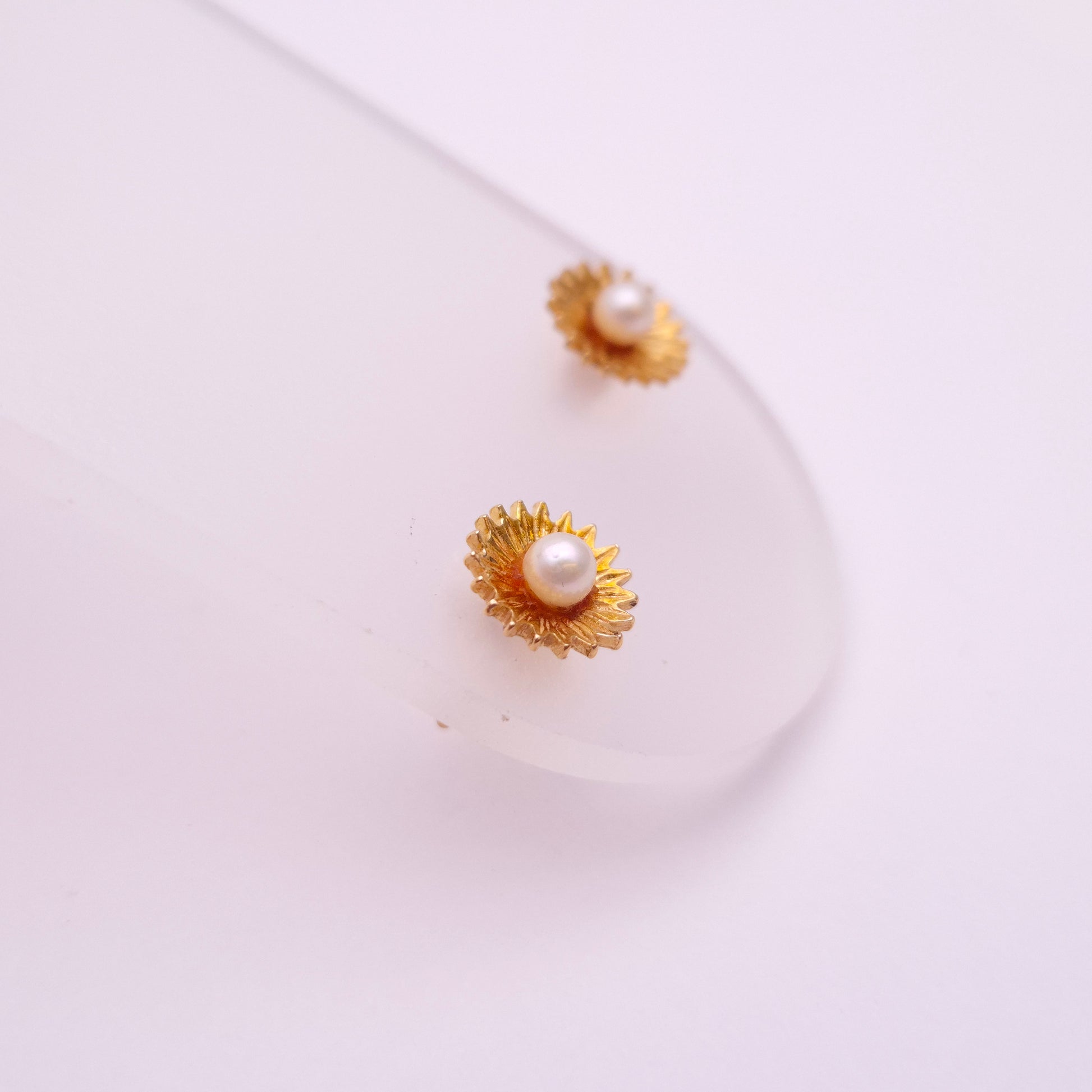 These sweet stud earrings are crafted in warm 9ct yellow gold and feature a charming starburst or flower-like design. Each earring showcases a delicate, textured gold setting resembling petals or rays, with a lustrous, creamy white pearl nestled at the centre. These earrings offer a touch of vintage-inspired elegance and subtle sophistication, perfect for adding a delicate accent to any look.
