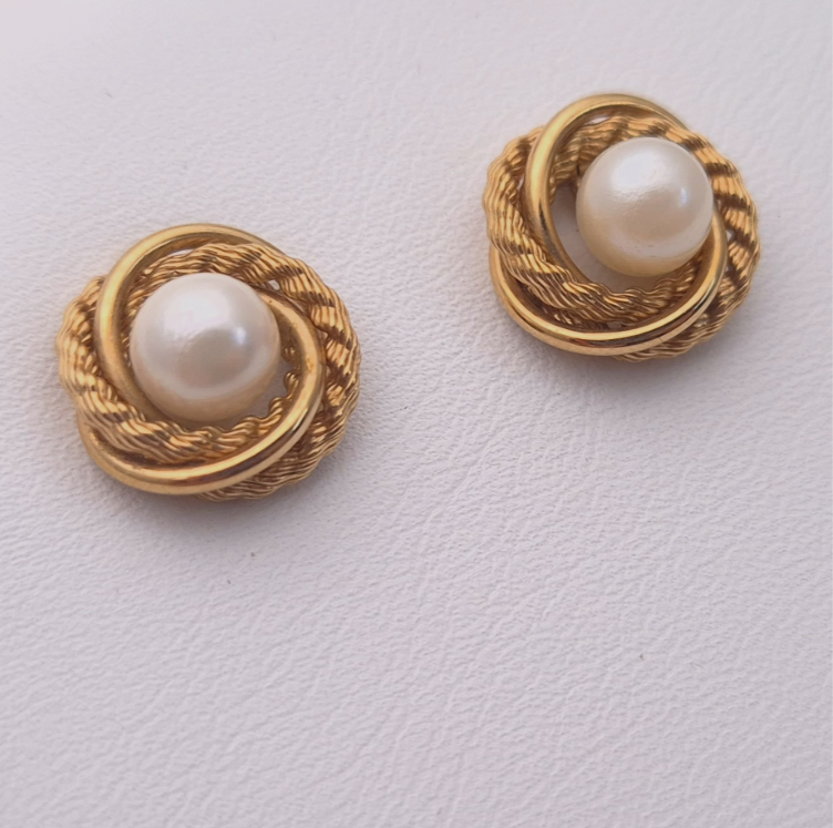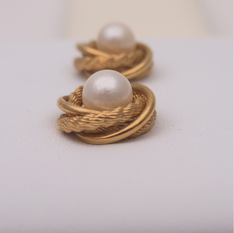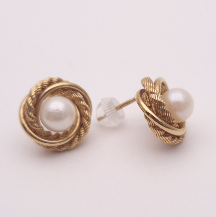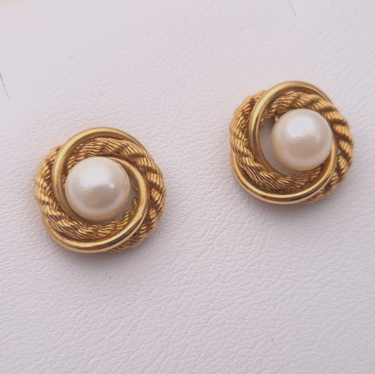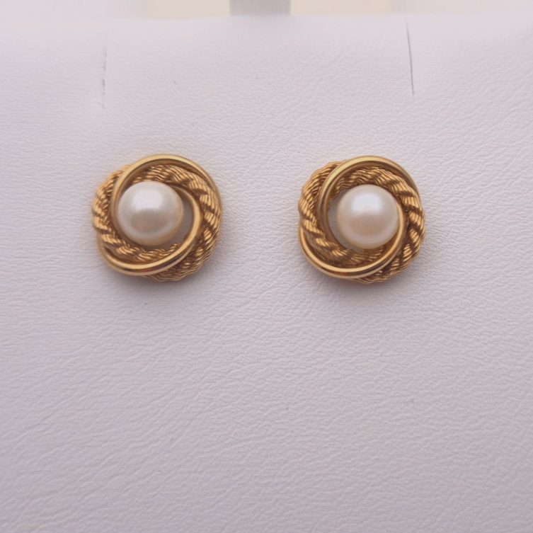This lovely pair of earrings is made from 9ct yellow gold and are centred around a pretty white pearl which is surrounded by a swirl of textured and polished strands to make a knot swirl surround.