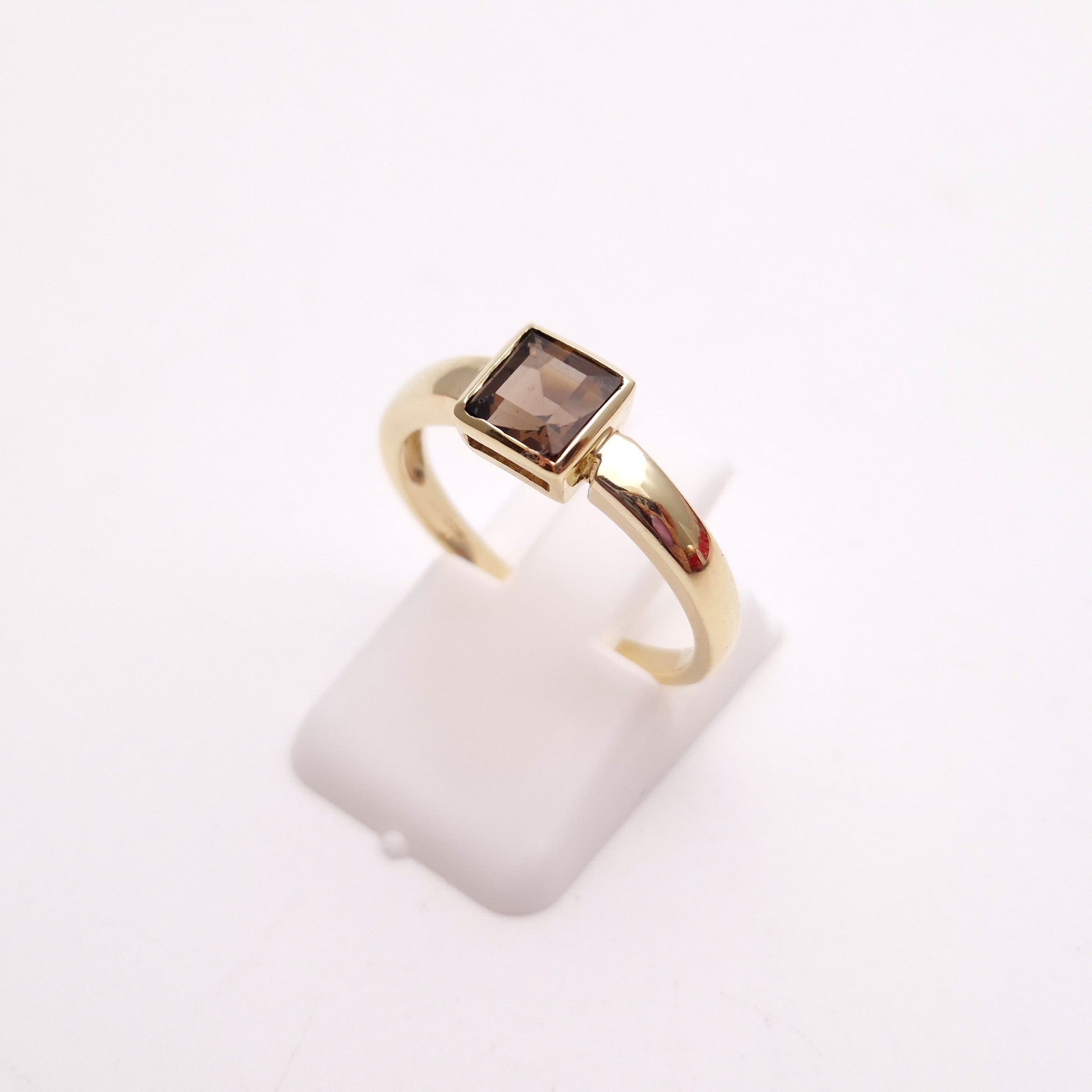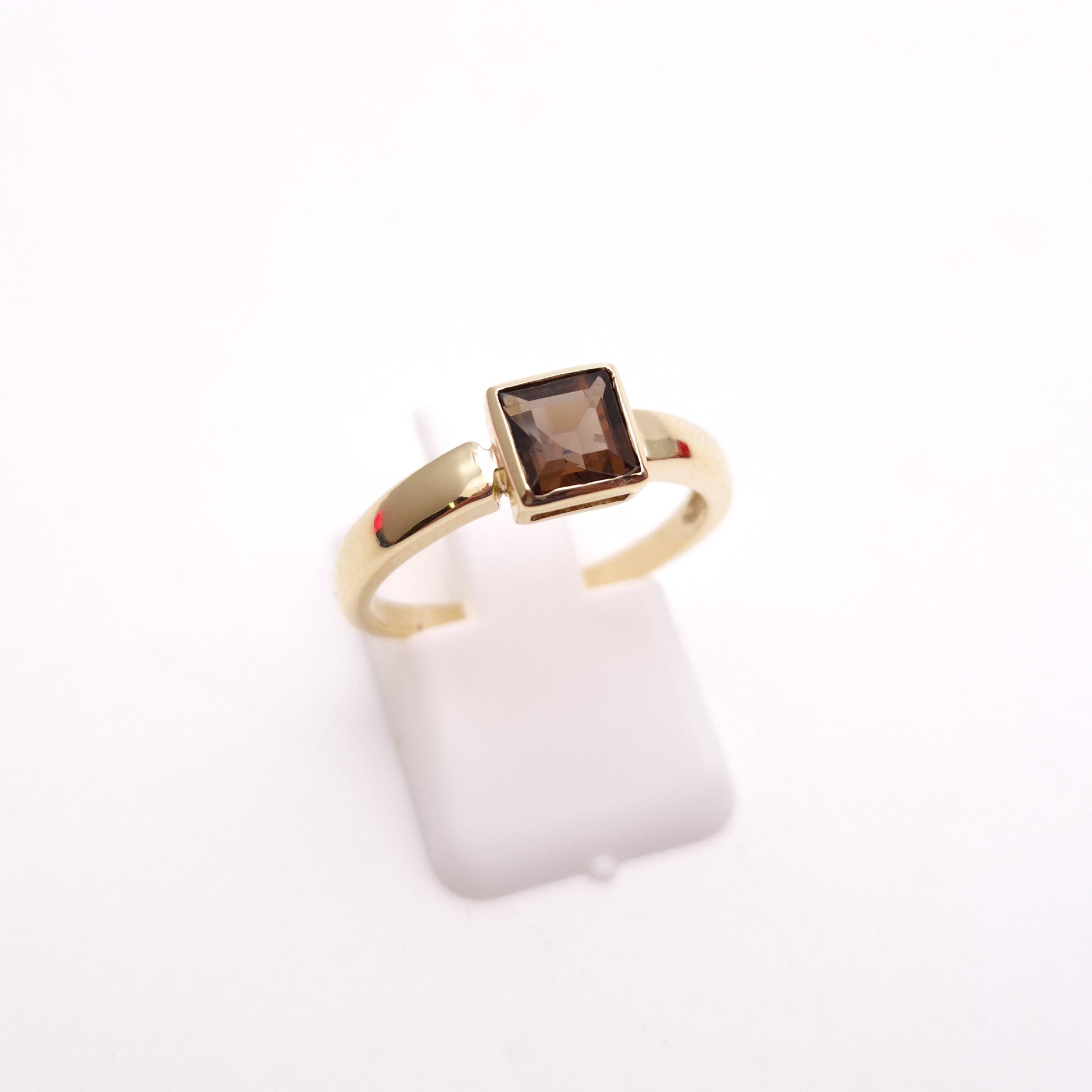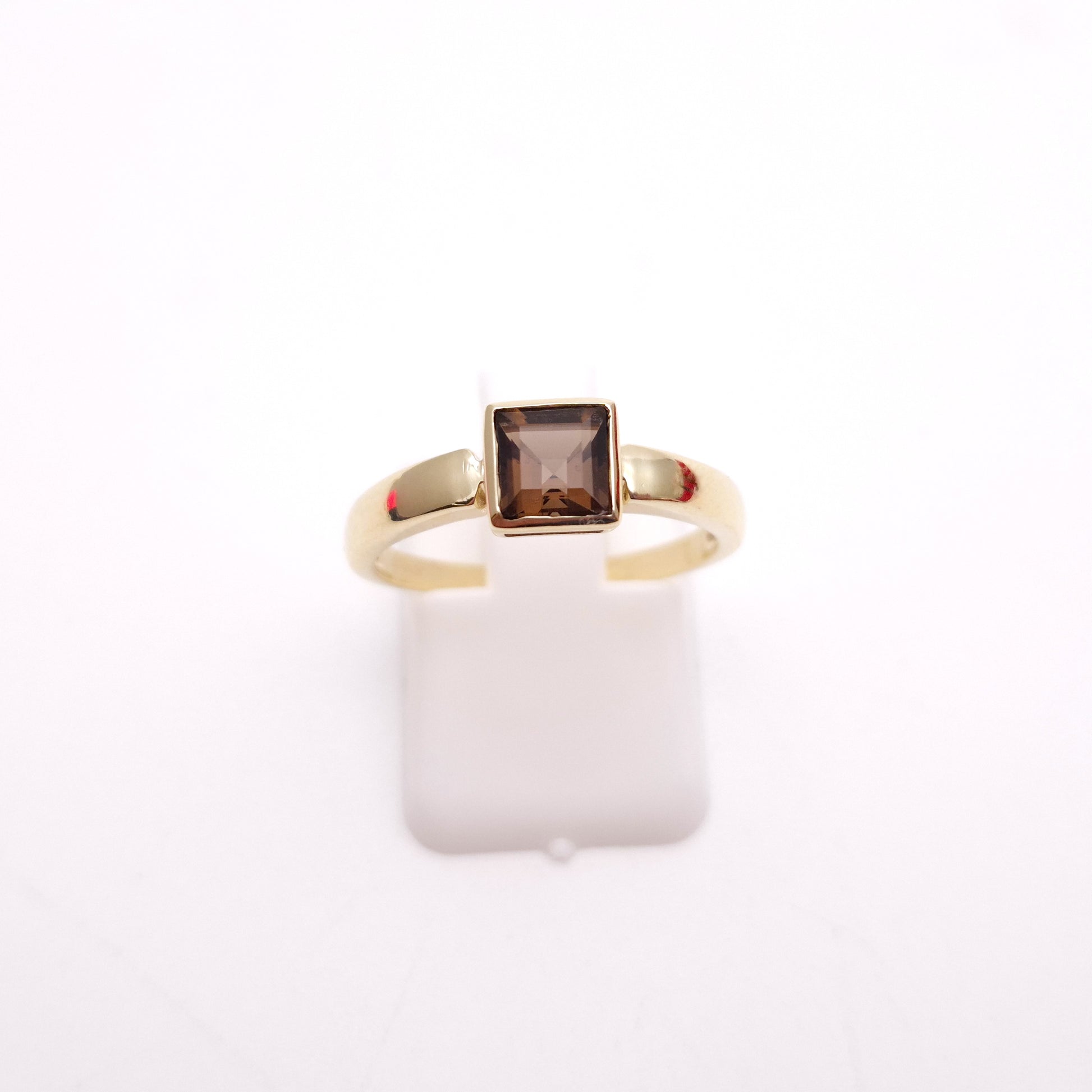 The smoky quartz is securely held within a sleek bezel setting, where the polished 9ct yellow gold completely surrounds the stone's edges. This setting style provides a clean, contemporary frame that both protects the gemstone and highlights its square shape. The polished yellow gold band is smooth and tapers gently, ensuring comfortable wear.