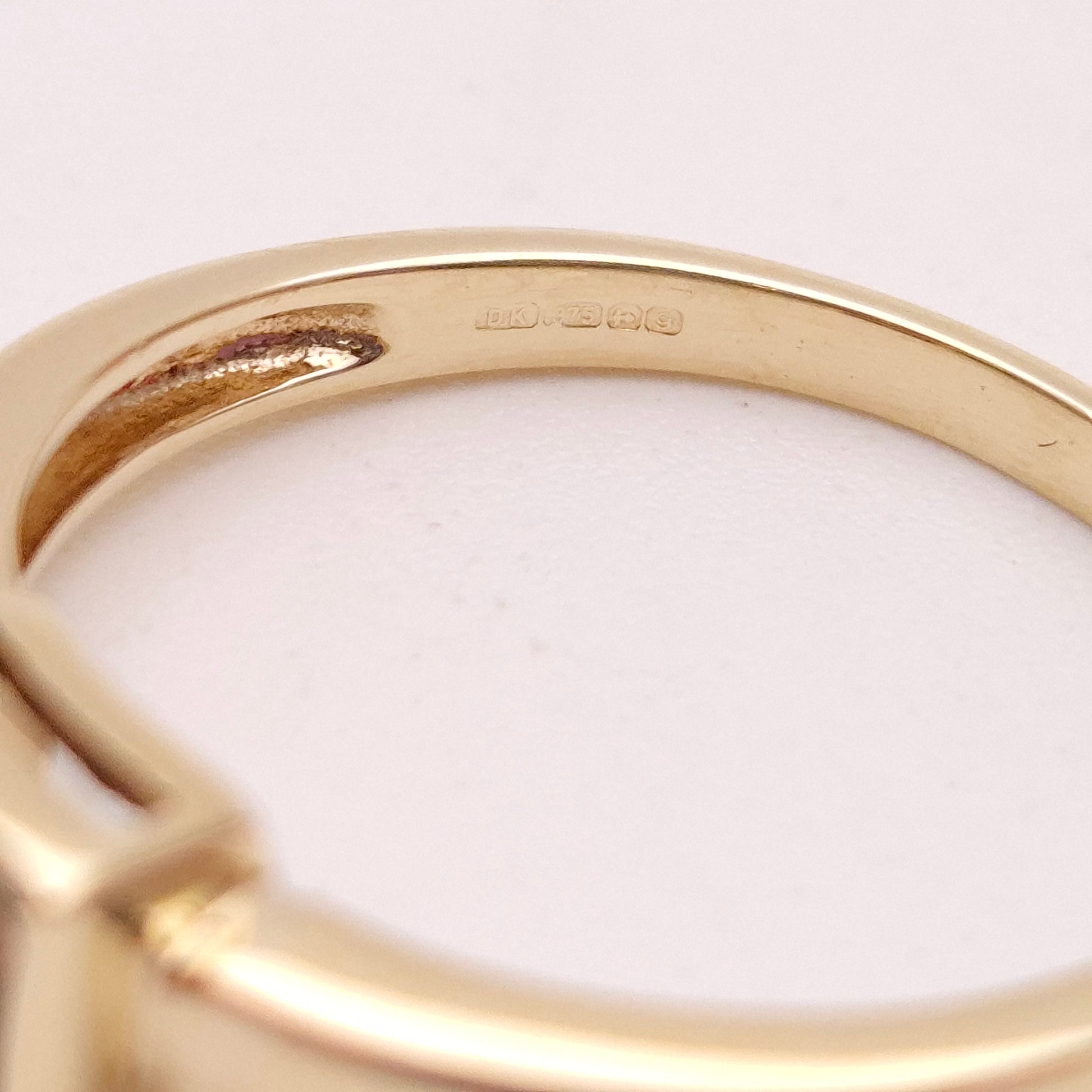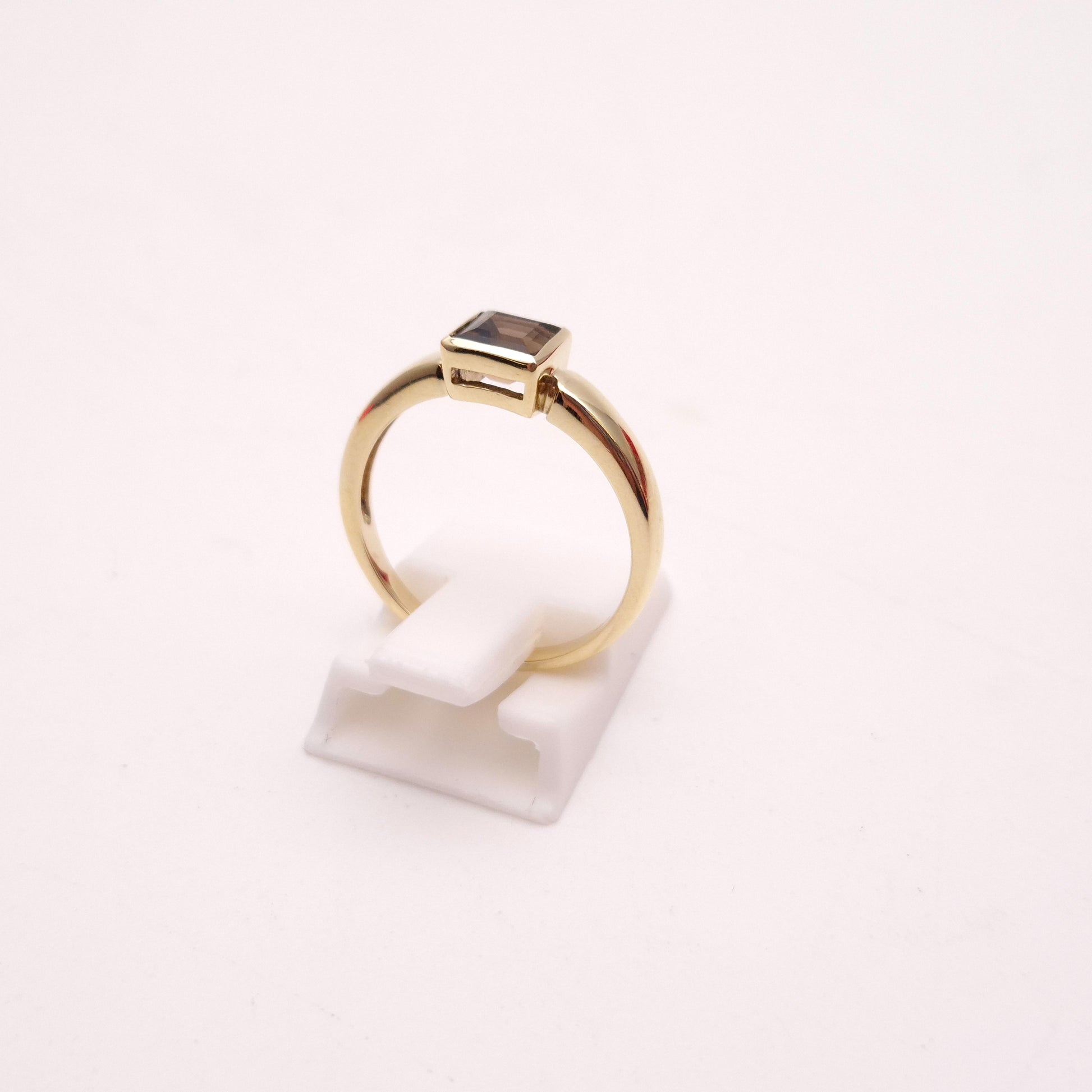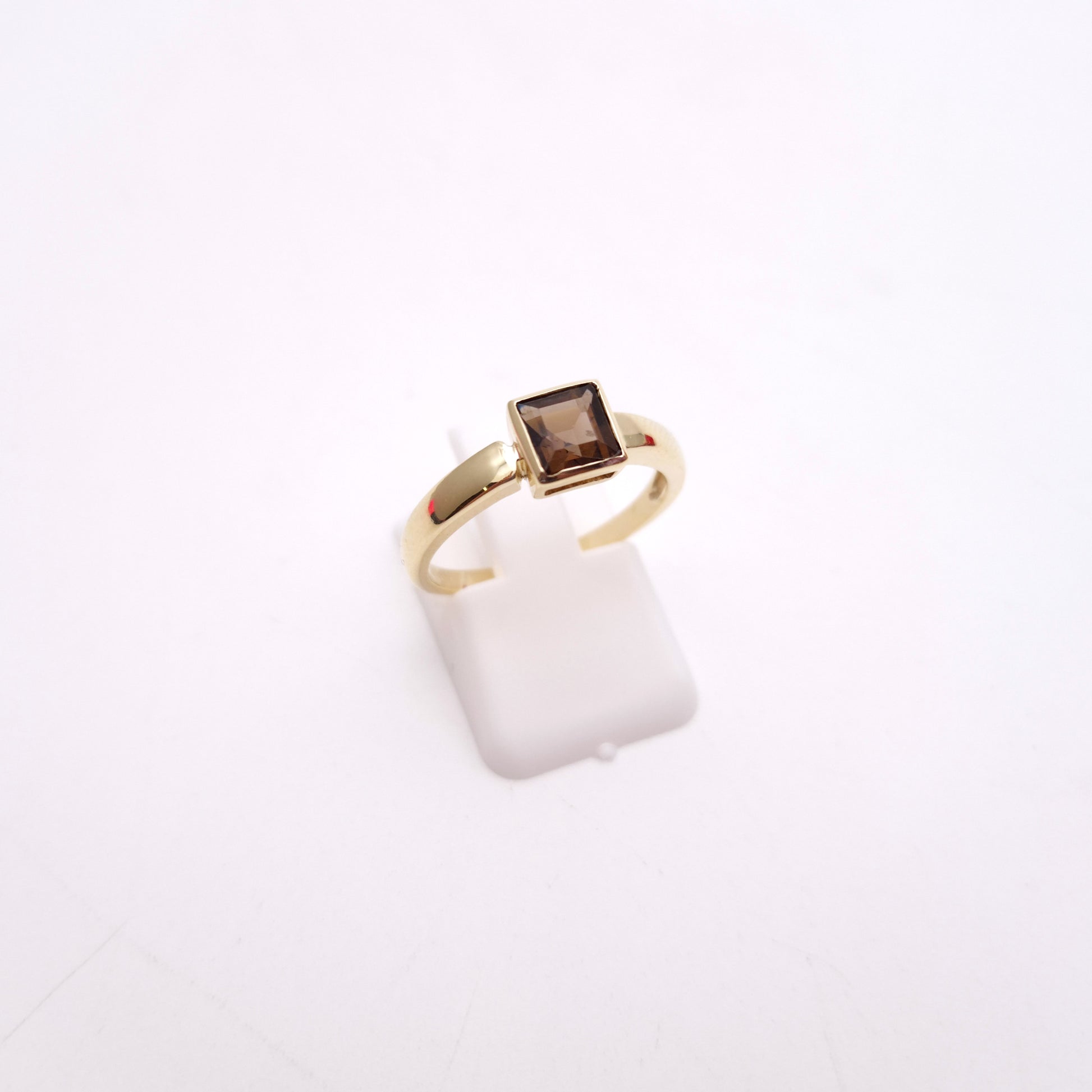 The smoky quartz is securely held within a sleek bezel setting, where the polished 9ct yellow gold completely surrounds the stone's edges. This setting style provides a clean, contemporary frame that both protects the gemstone and highlights its square shape. The polished yellow gold band is smooth and tapers gently, ensuring comfortable wear.