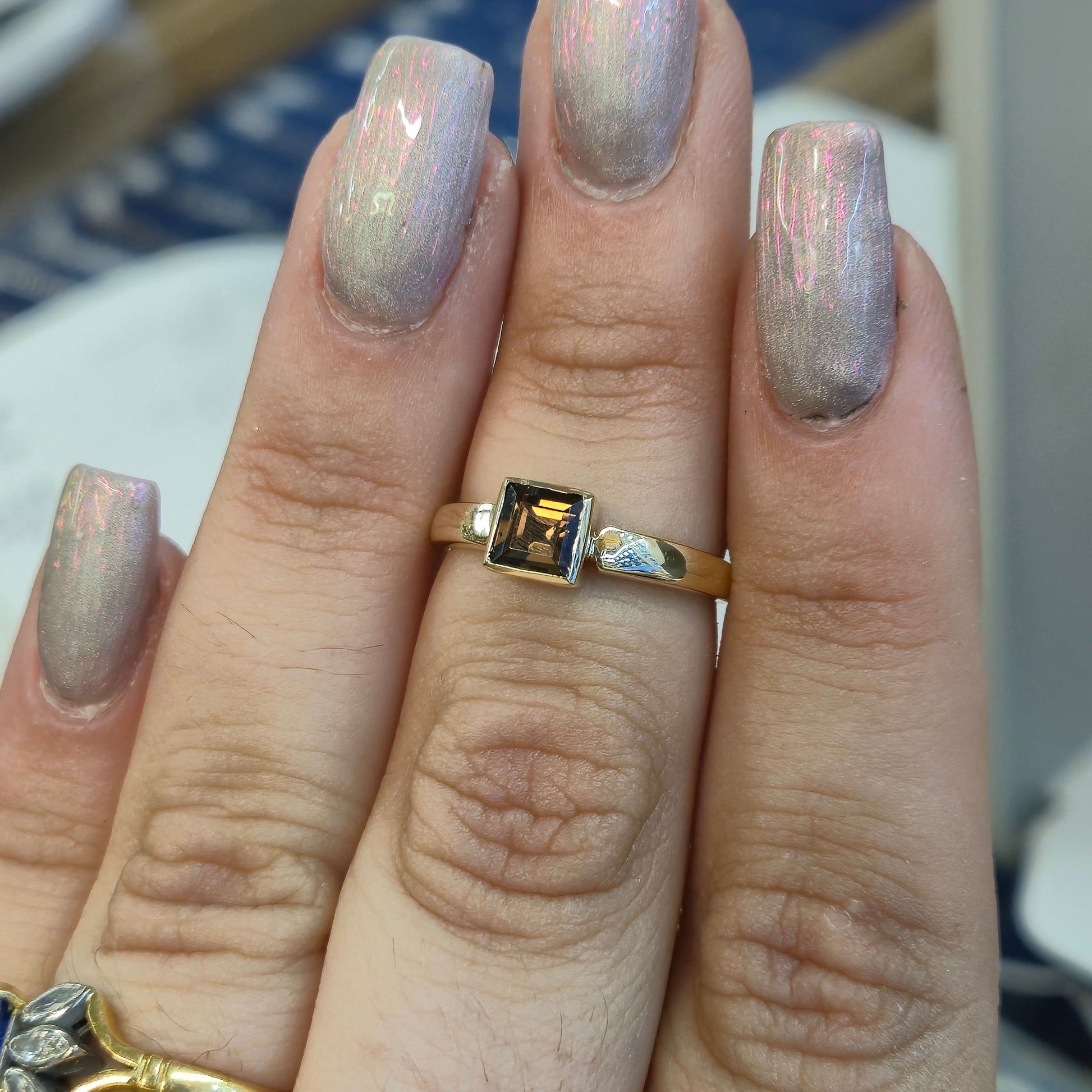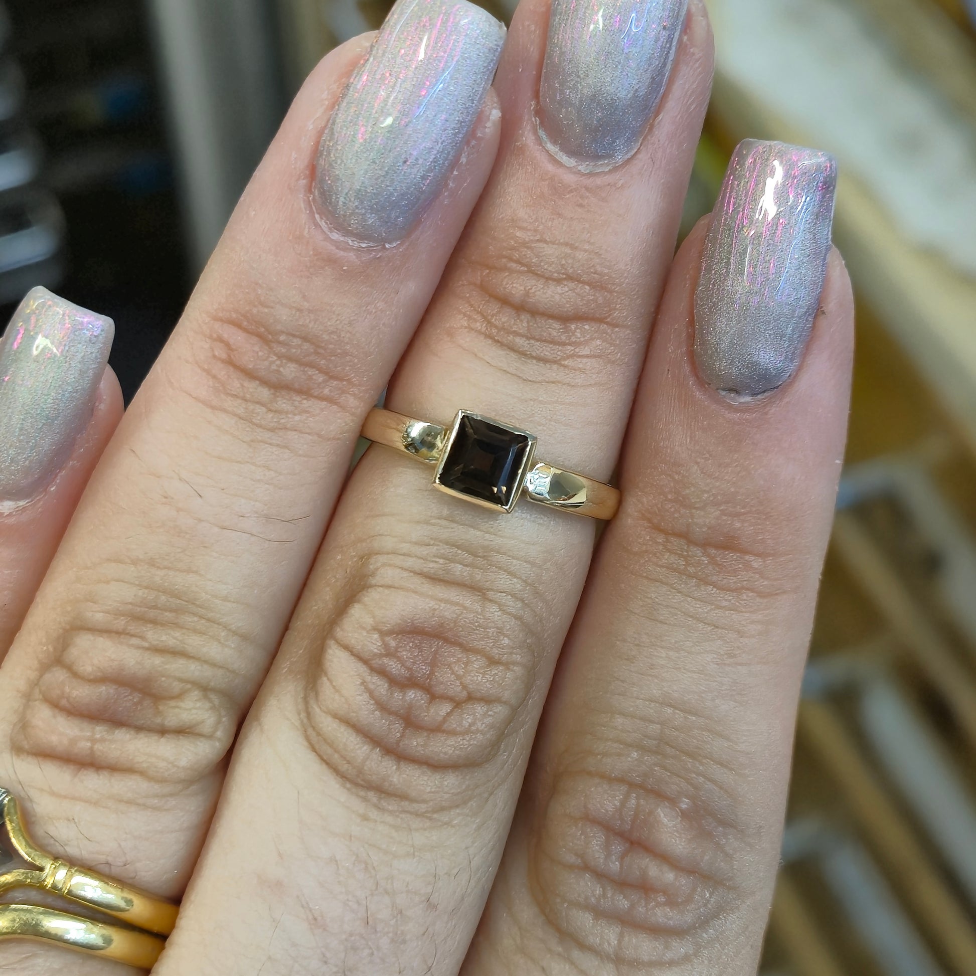 This stylish ring features a captivating square-cut smoky quartz, set in warm 9ct yellow gold, offering a modern yet sophisticated appeal.
