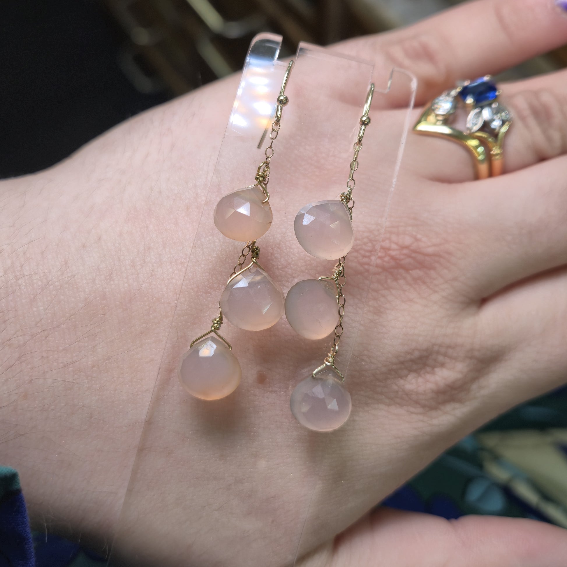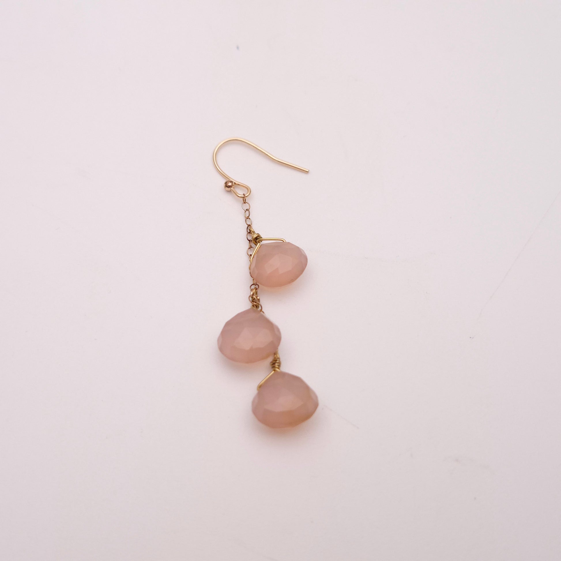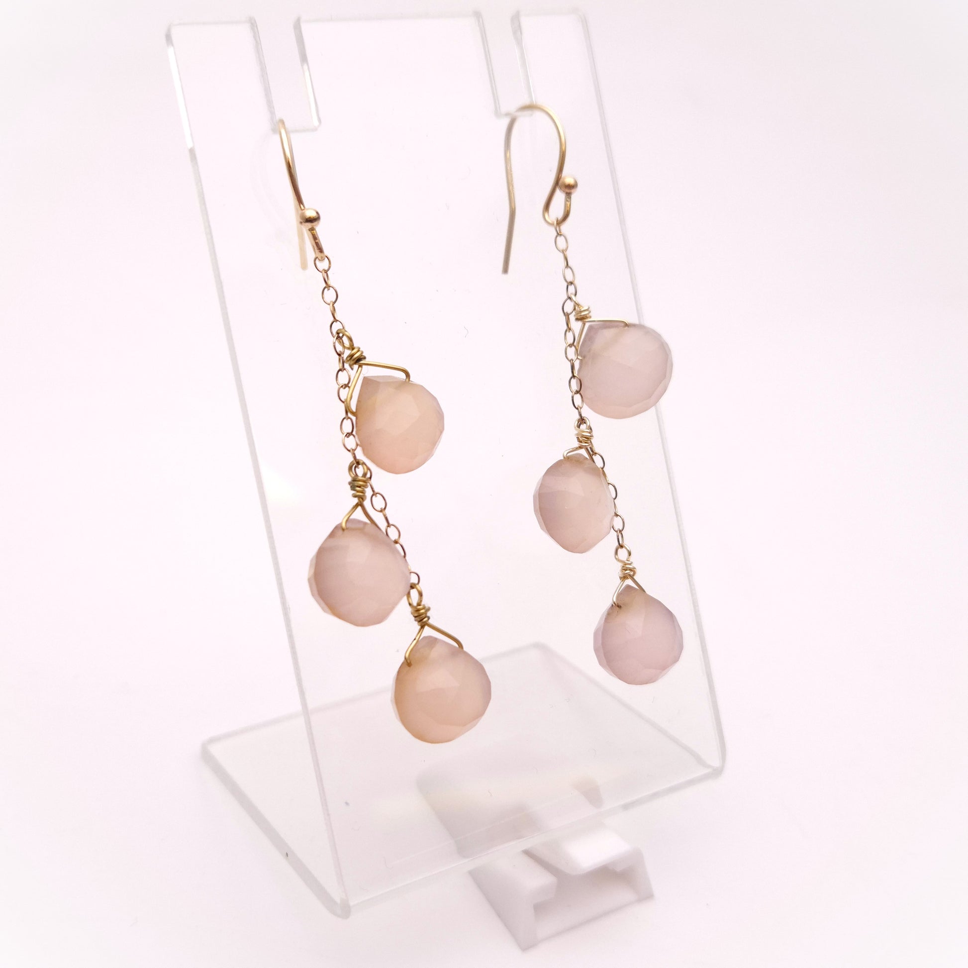 Each earring features three beautifully faceted rose quartz beads that dangle from a fine 9ct yellow gold chain. The beads, known as the stone of unconditional love, have a soft, ethereal pink hue that glows gently as they catch the light. The faceting creates a subtle, captivating sparkle that is both understated and enchanting.