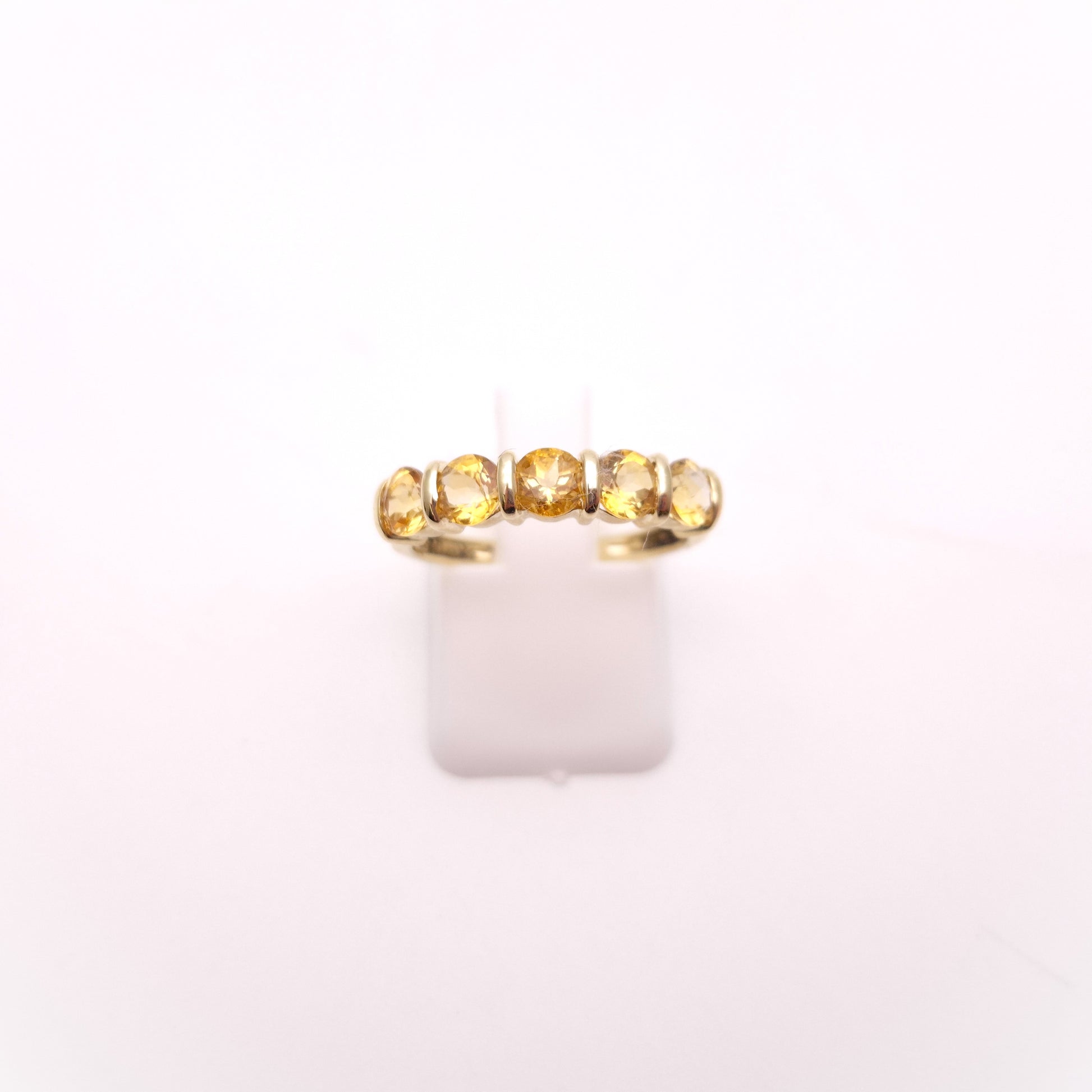 The design features a traditional Five Stone Row running across the top of the finger. This row is composed of five evenly sized round brilliant-cut Citrine gemstones. Citrine is known for its joyful, clear colour, and the brilliant cut maximizes the light reflection and sparkle of each stone. The stones are secured in a clean, modern bar setting, which elevates them slightly and ensures maximum visibility. This ring is a wonderful piece to wear alone or to stack with other bands. It is an ideal gift for a November birthstone (Citrine) or for anyone who appreciates the warmth and happiness associated with yellow gemstones.