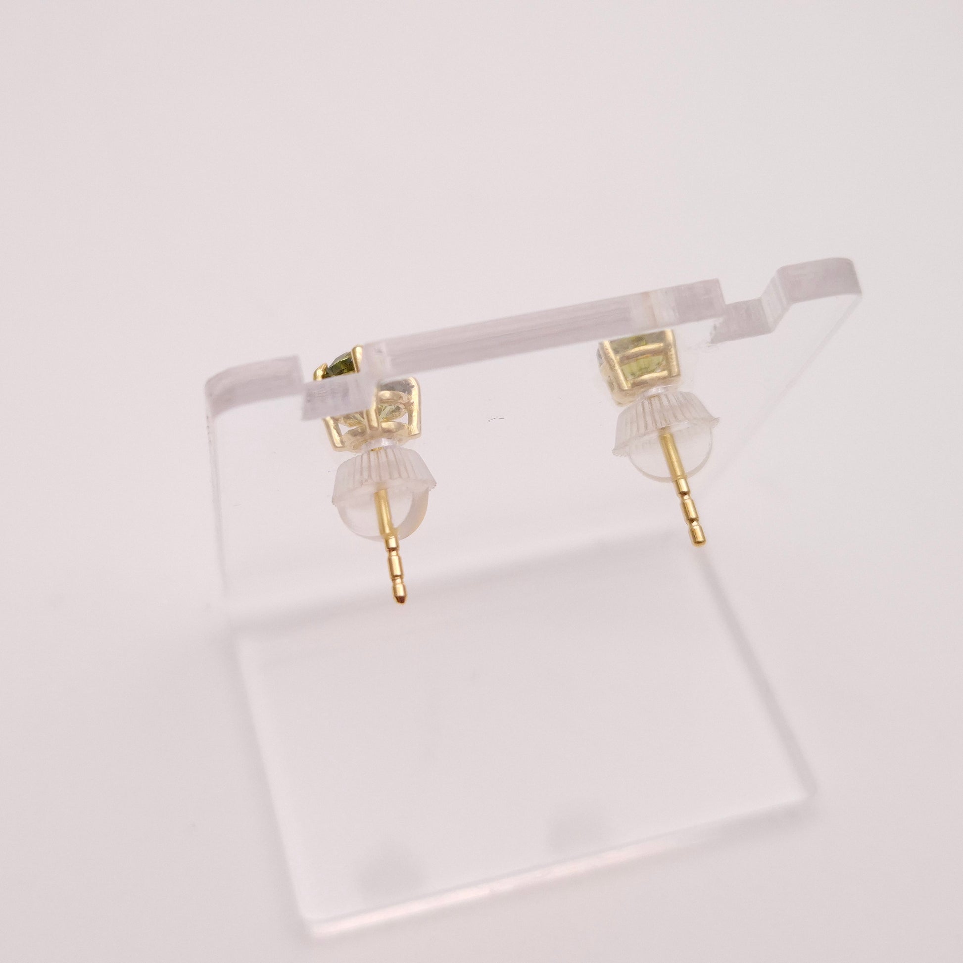 Each earring features a single, round brilliant-cut Green Topaz, which displays a beautiful, bright olive-green hue. The stones are prominently displayed in a classic four-prong setting, which securely holds the gem while allowing maximum light to enter and enhance its sparkle. The traditional stud design ensures these earrings are comfortable and secure, fastening with a post and back. These solitaire studs are a timeless and versatile addition to any jewellery collection, offering a sophisticated pop of colour and enduring elegance.