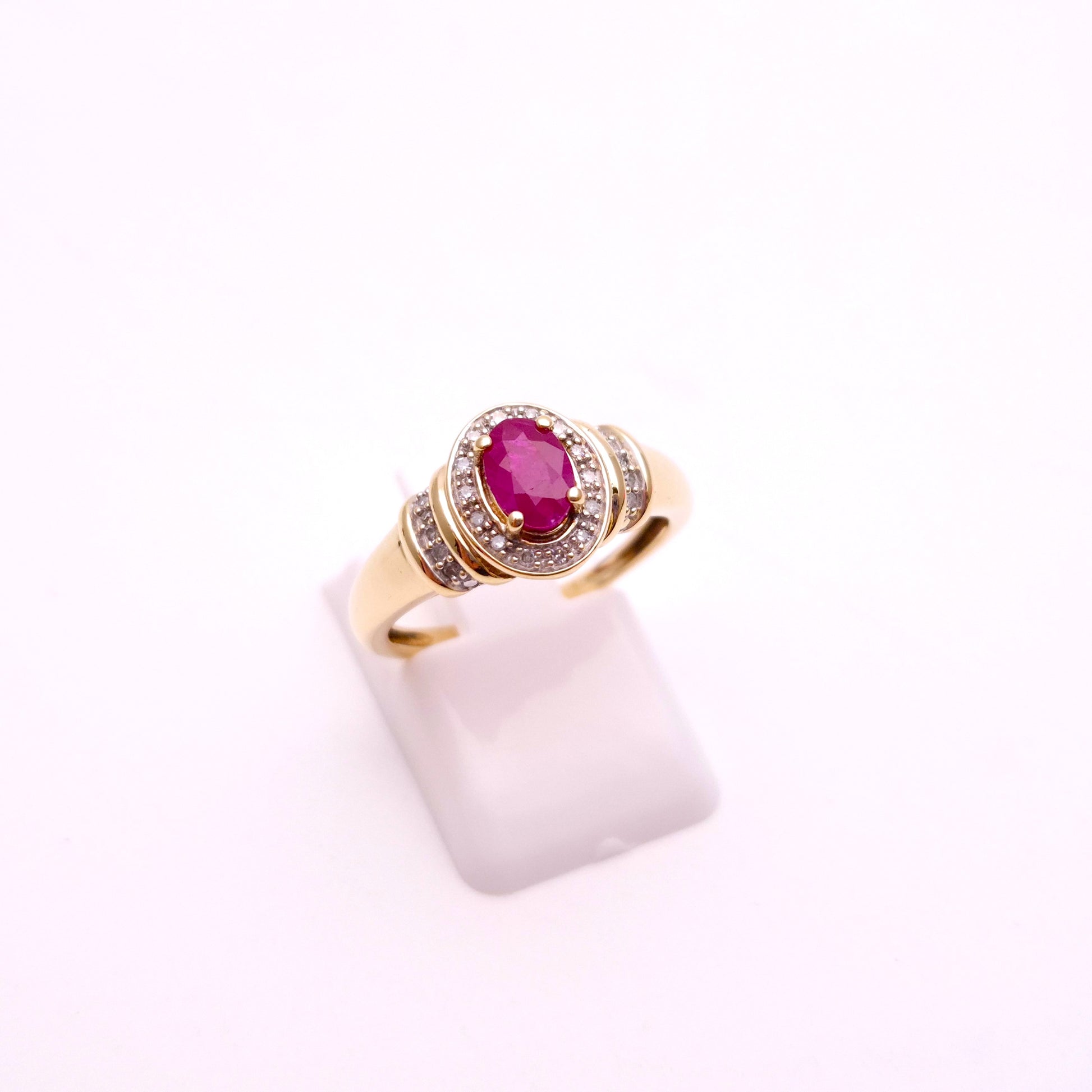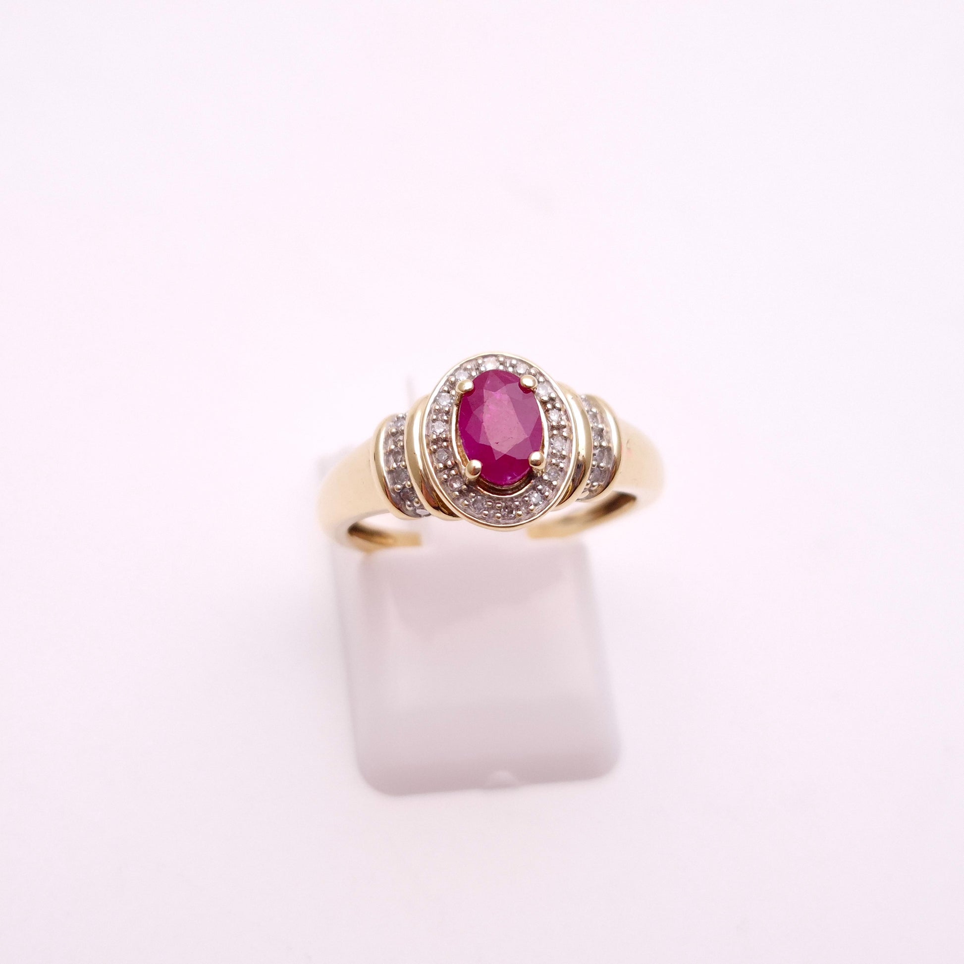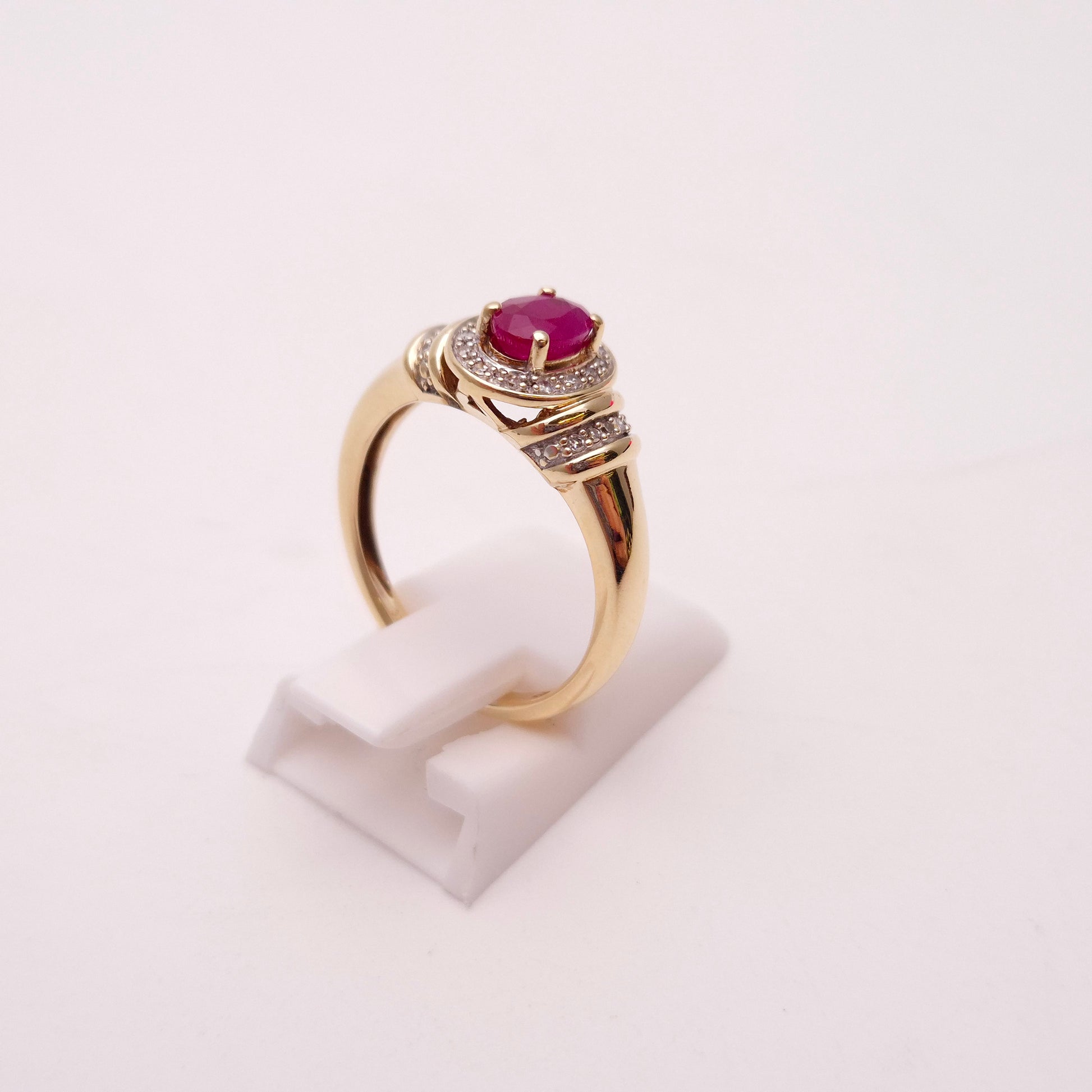 At the heart of the ring is a beautiful oval-cut ruby, showcasing its intense, passionate red hue. This captivating gem is encircled by a sparkling halo of genuine diamonds, which amplify the ruby's brilliance and create a much larger visual presence. Additional diamonds gracefully adorn the shoulders of the ring, extending the sparkle down the elegant 9ct yellow gold band. The warm glow of the gold perfectly complements the fiery red of the ruby and the crisp white of the diamonds, creating a truly luxurious combination.