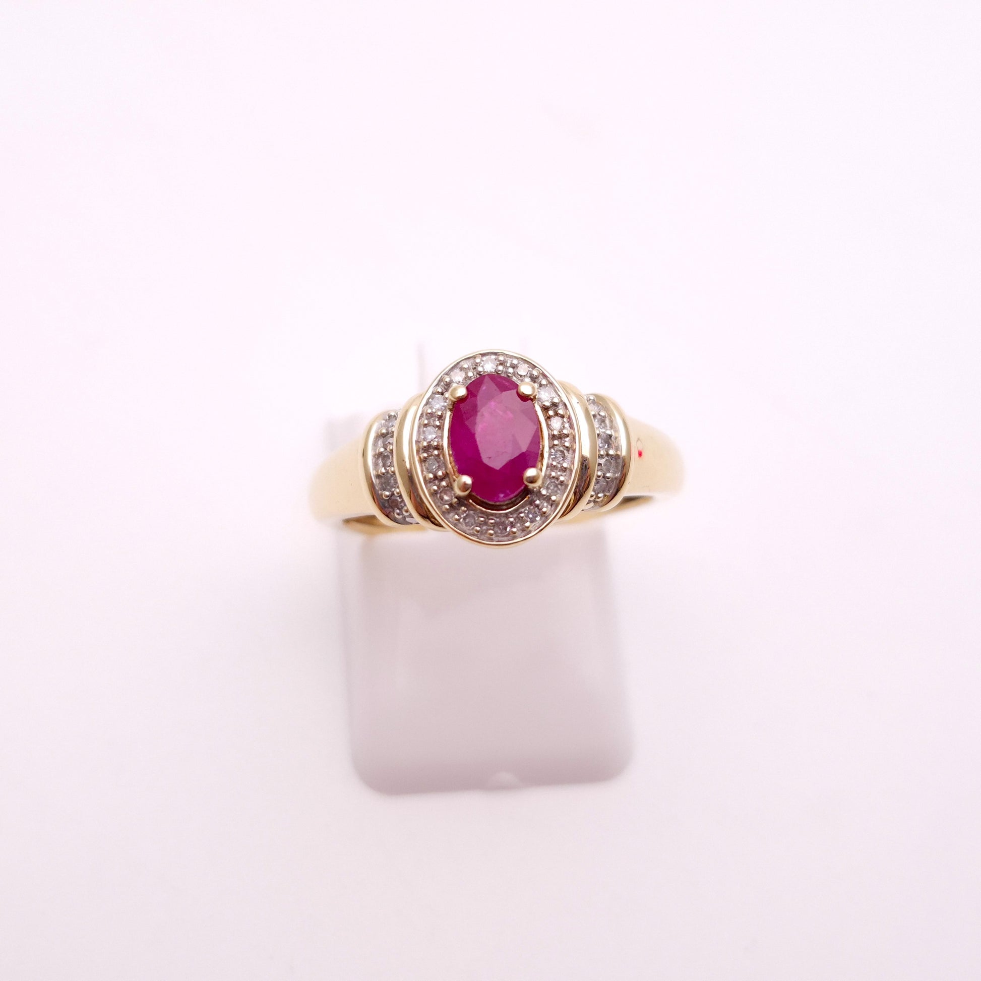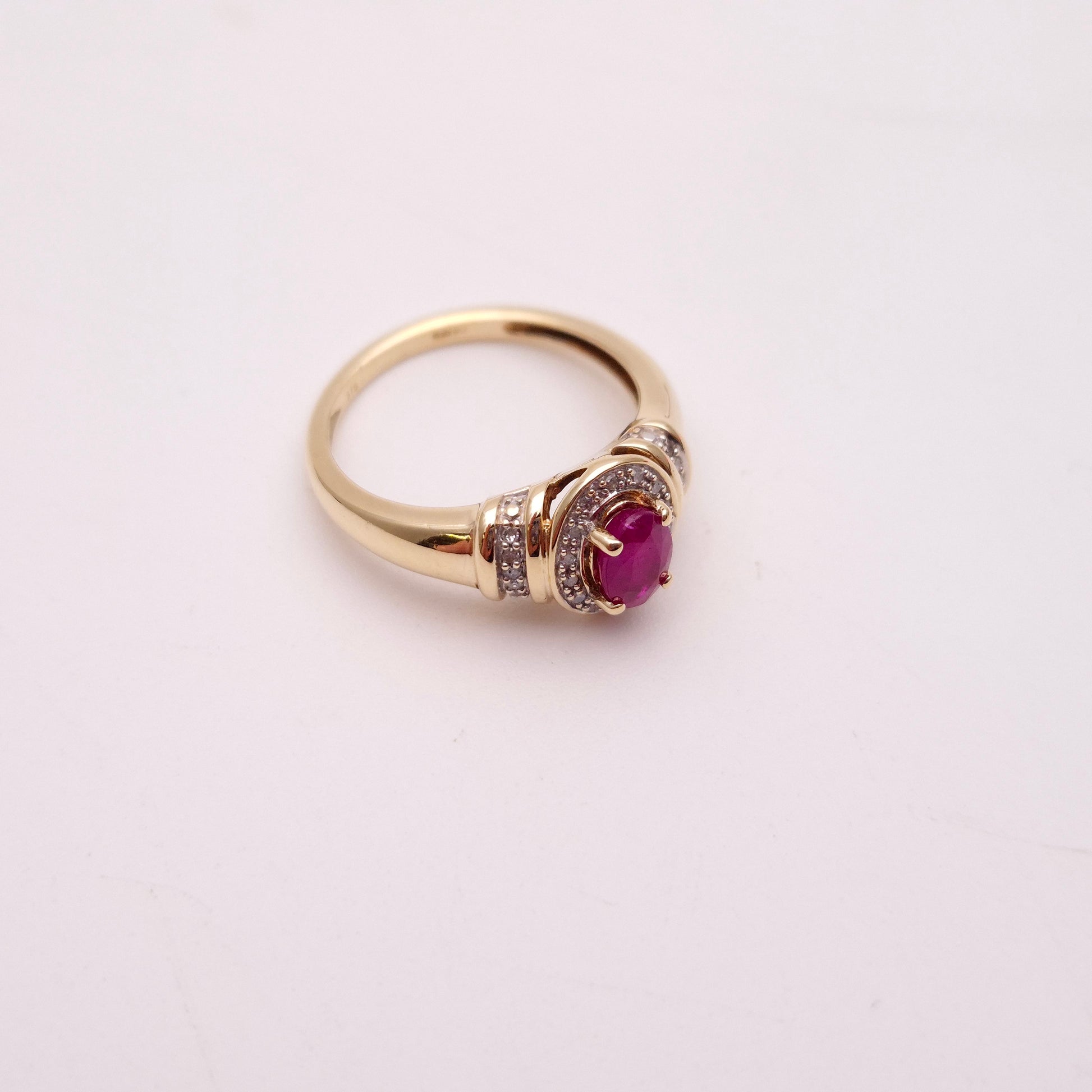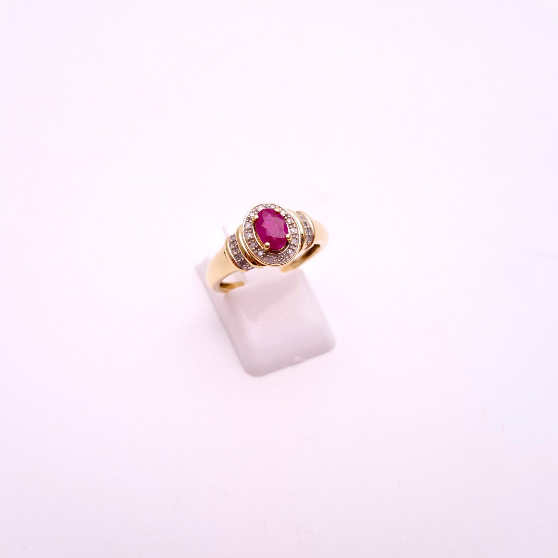 At the heart of the ring is a beautiful oval-cut ruby, showcasing its intense, passionate red hue. This captivating gem is encircled by a sparkling halo of genuine diamonds, which amplify the ruby's brilliance and create a much larger visual presence. Additional diamonds gracefully adorn the shoulders of the ring, extending the sparkle down the elegant 9ct yellow gold band. The warm glow of the gold perfectly complements the fiery red of the ruby and the crisp white of the diamonds, creating a truly luxurious combination.