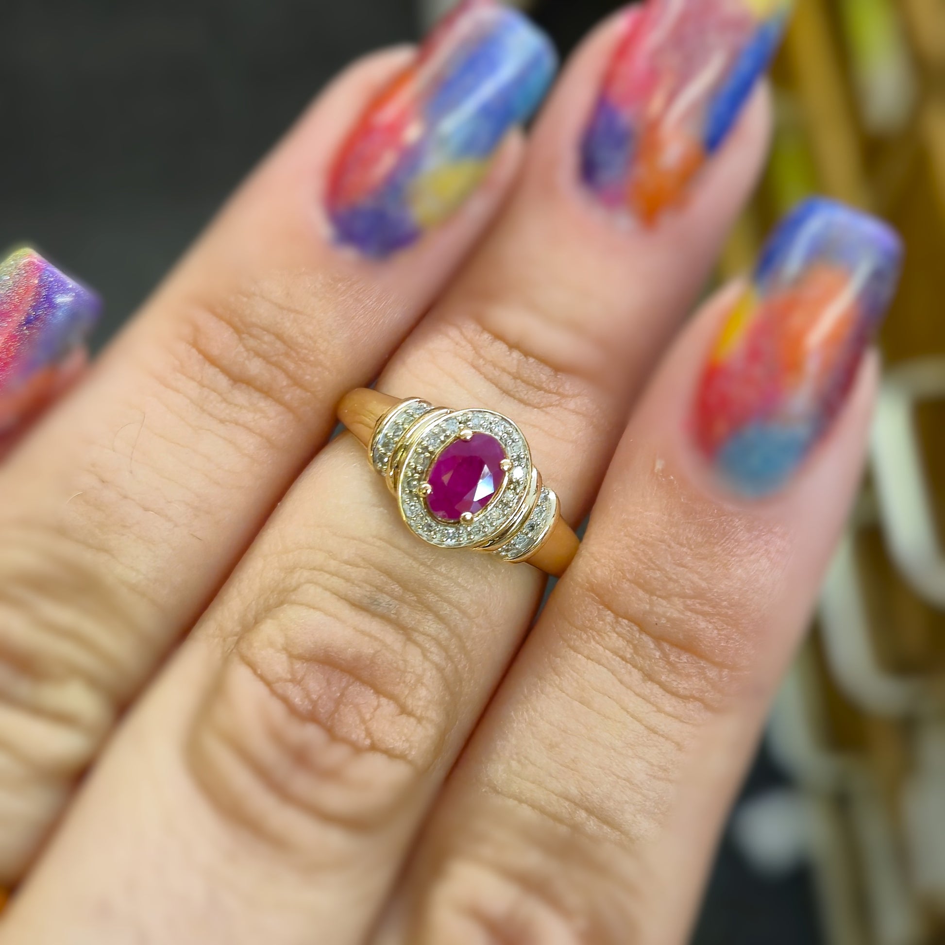 Experience classic elegance with a vibrant twist in this gorgeous 9ct yellow gold ring, featuring a dazzling ruby centrepiece surrounded by a brilliant diamond halo. This exquisite piece offers both rich colour and captivating sparkle.