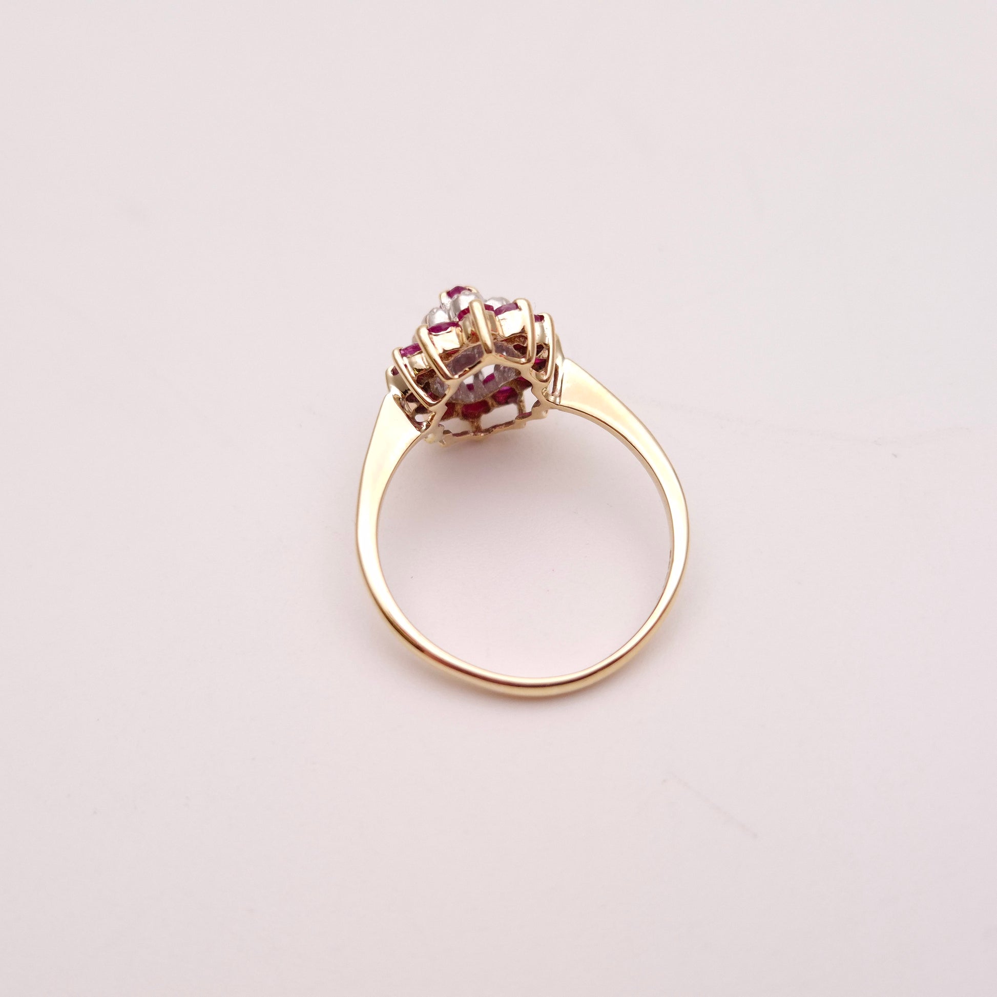 The ring's head is shaped into an elegant marquise or oval outline, densely packed with vibrant gemstones. At the centre is a marquise-cut or oval-shaped Ruby, which is surrounded by a dazzling border of small, round-cut diamonds. An additional border of round cut rubies then complete the cluster surrounding the other stones . The overall design creates a magnificent display of colour and light, reminiscent of a blooming flower or a vintage cocktail piece. The cluster setting maximizes the visible spread of the gemstones, giving the ring a substantial and luxurious appearance on the finger. This gorgeous ring is a perfect statement piece for special occasions or a memorable gift for a loved one.