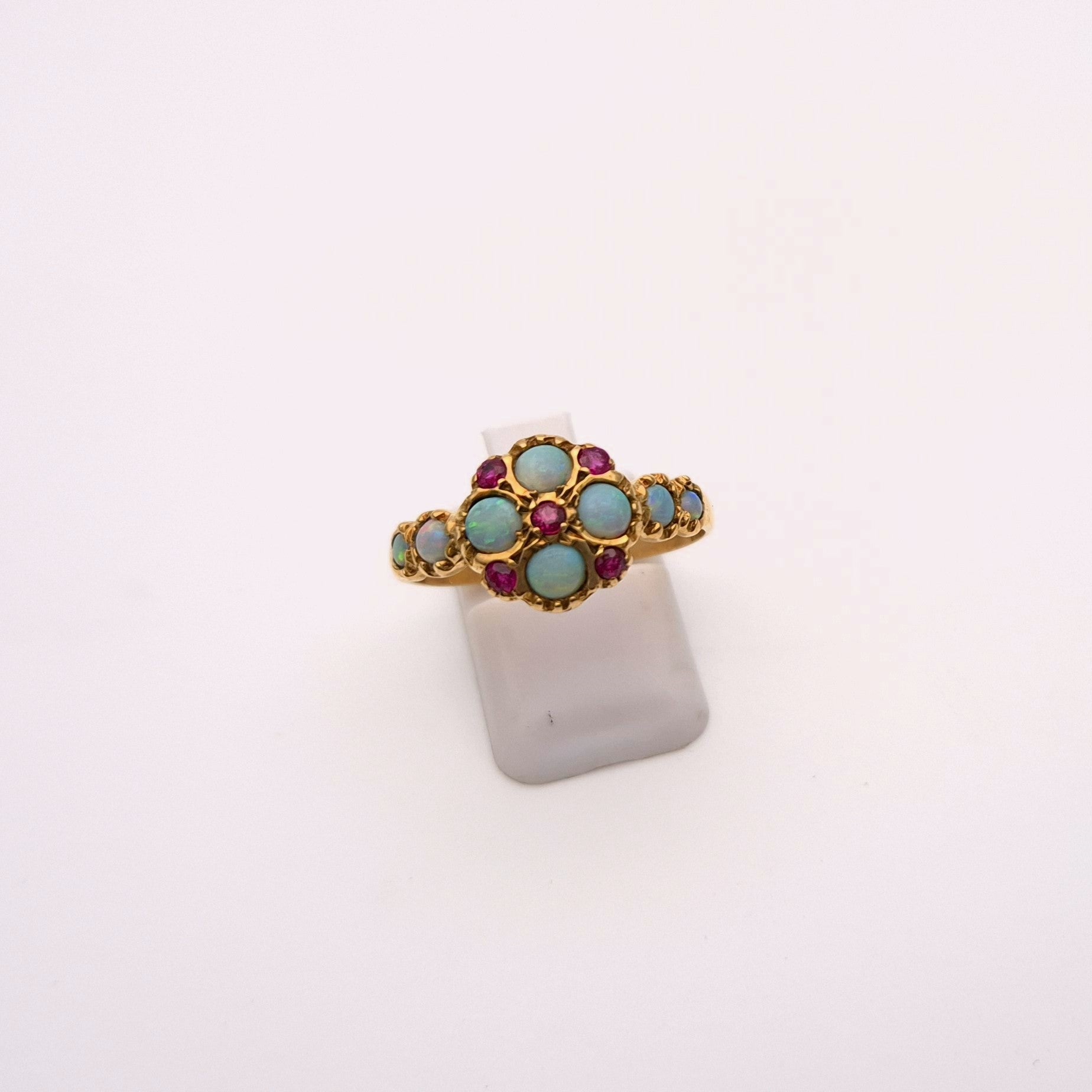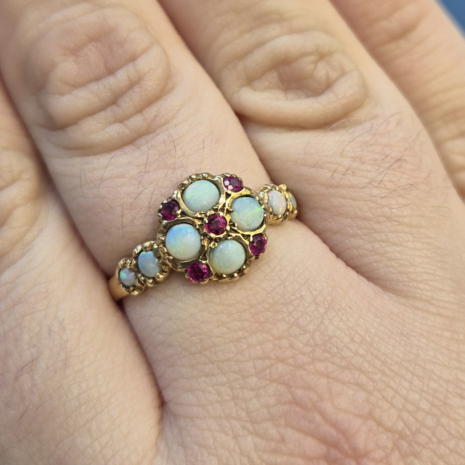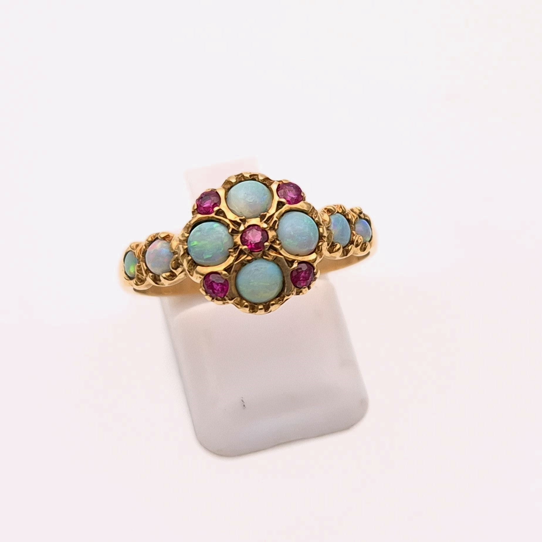 This beautiful 9ct yellow gold ring features a stunning cluster setting with 5 small ruby and 4 round opal stones in a quatrefoil type formation. The ring is a repro piece in an antique style hallmarked as from Birmingham in 1987. The shoulders are also set with a further two opals on each side.