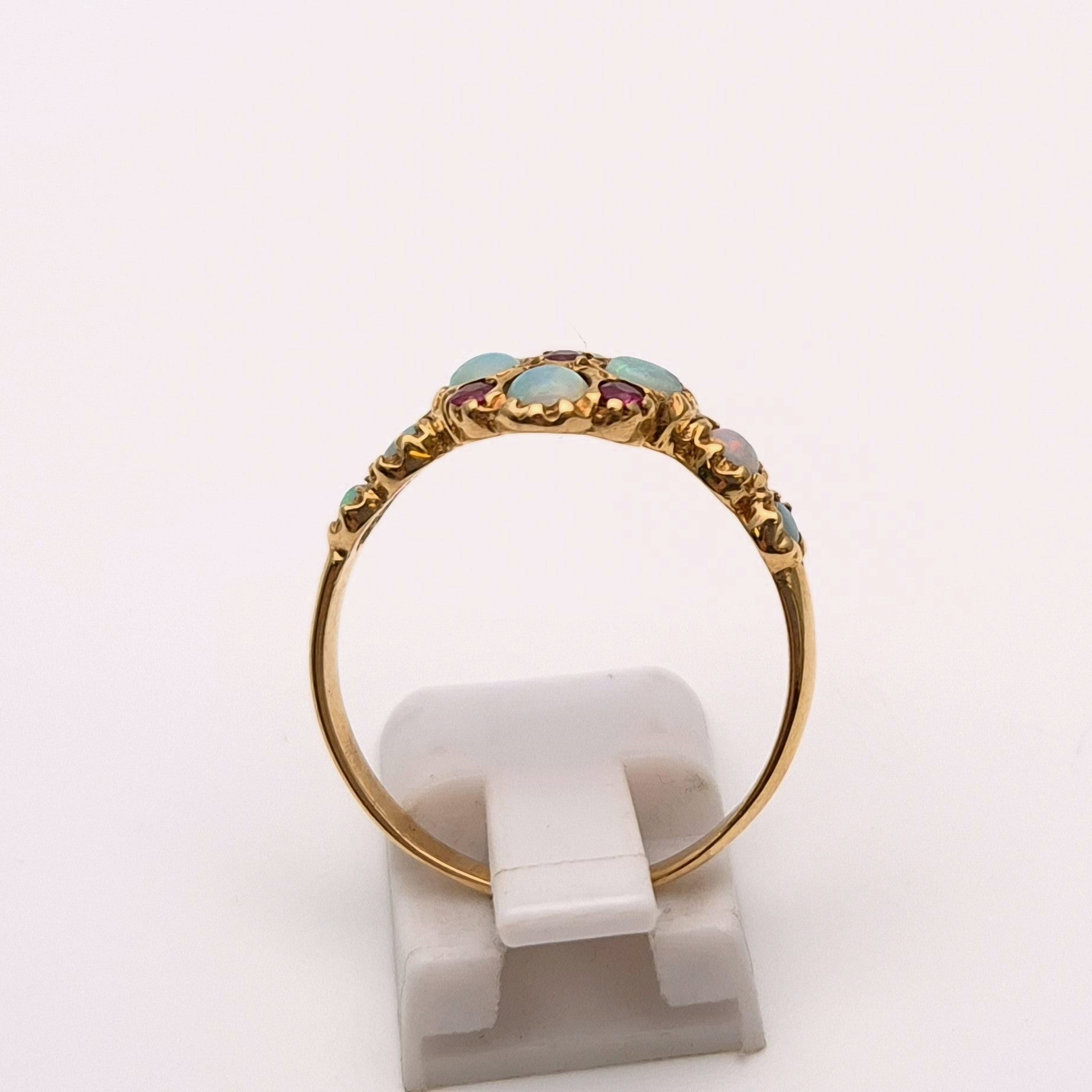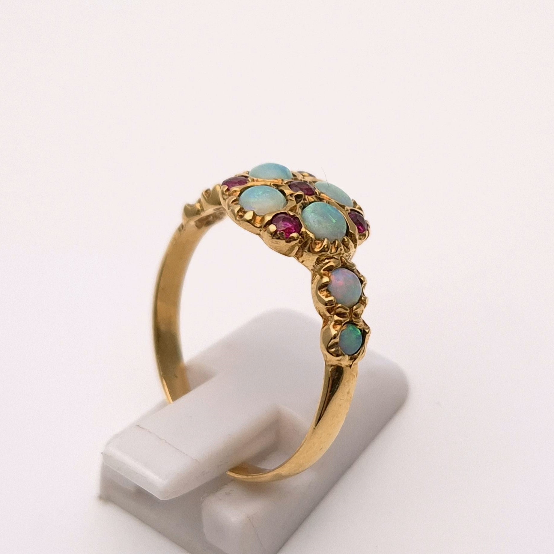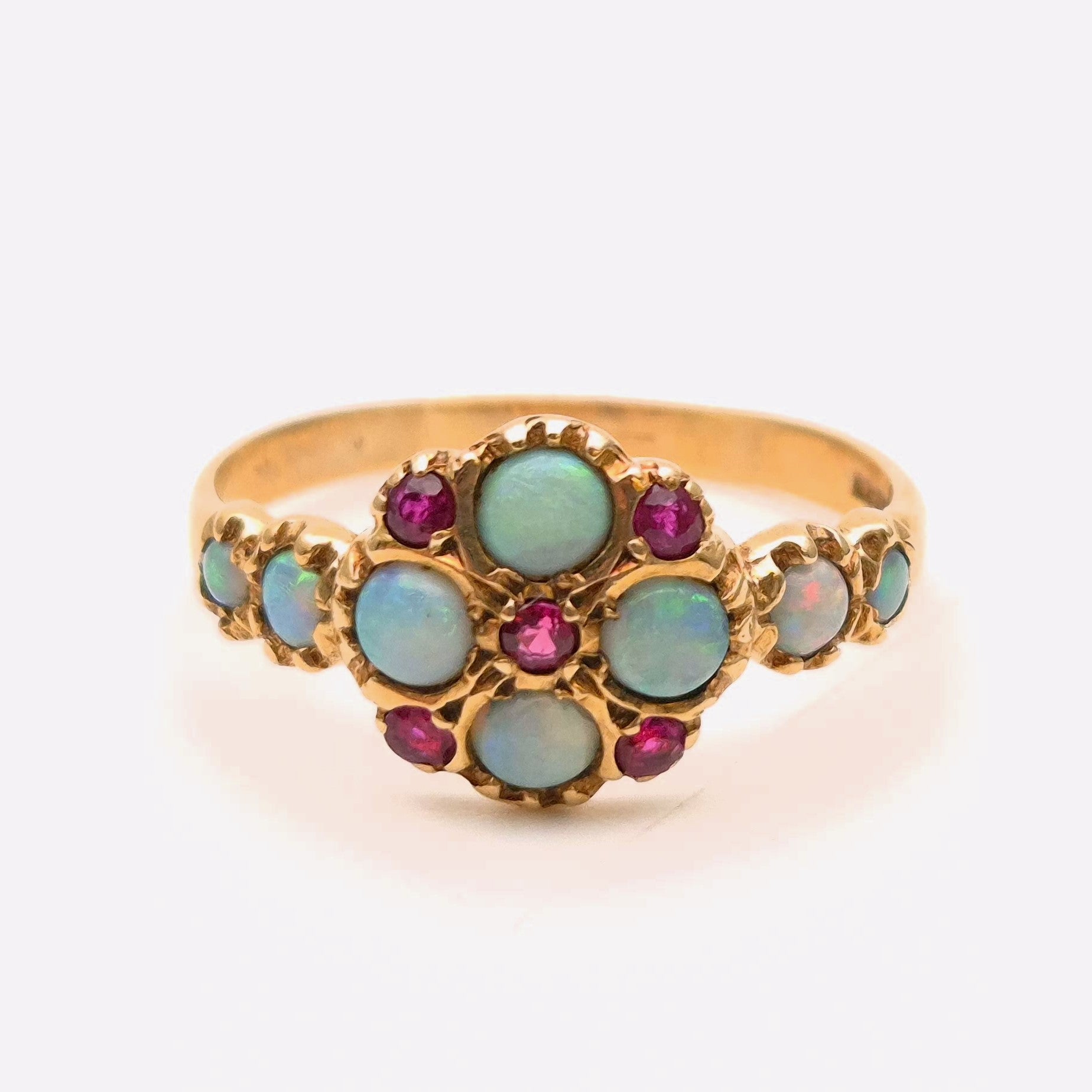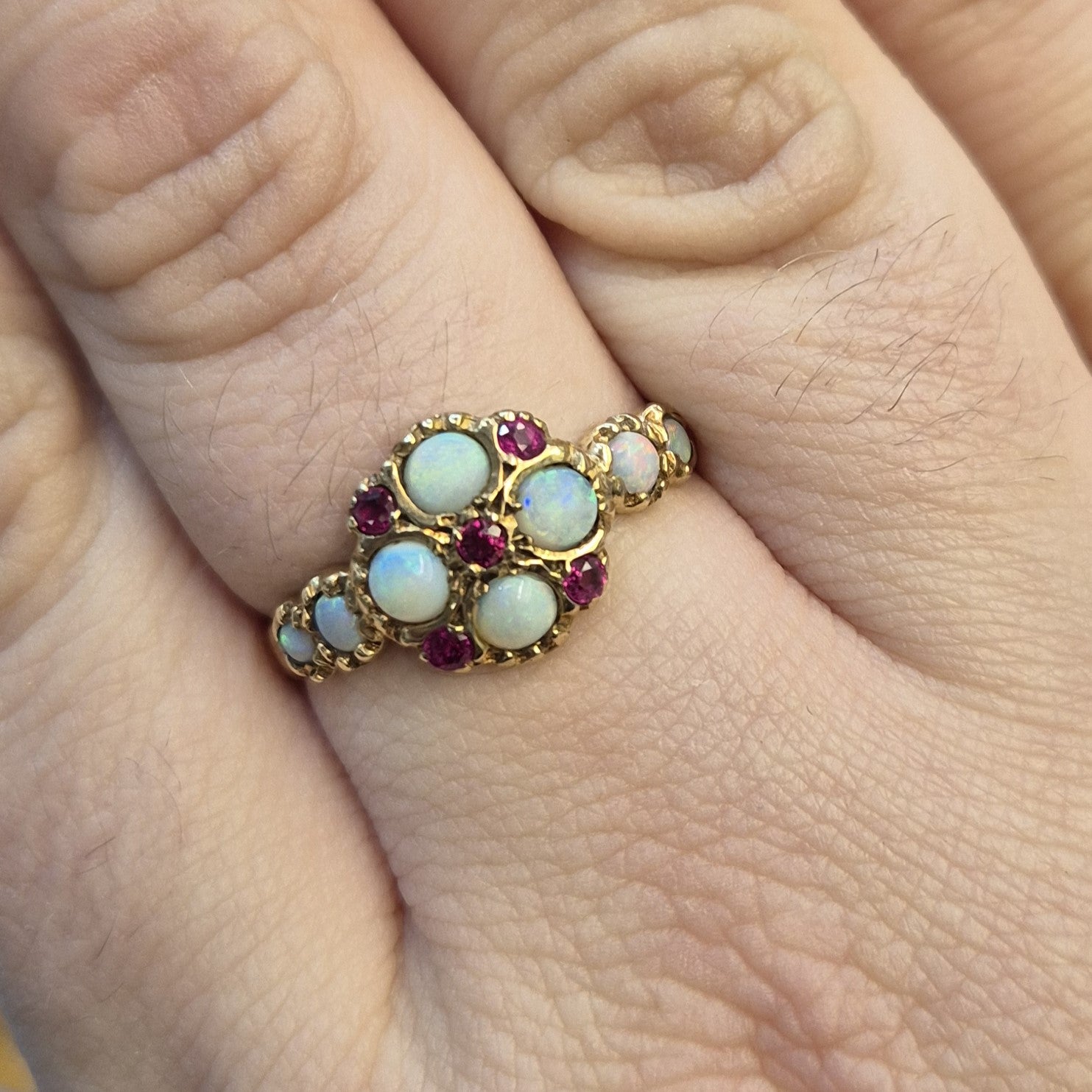 This beautiful 9ct yellow gold ring features a stunning cluster setting with 5 small ruby and 4 round opal stones in a quatrefoil type formation. The ring is a repro piece in an antique style hallmarked as from Birmingham in 1987. The shoulders are also set with a further two opals on each side.