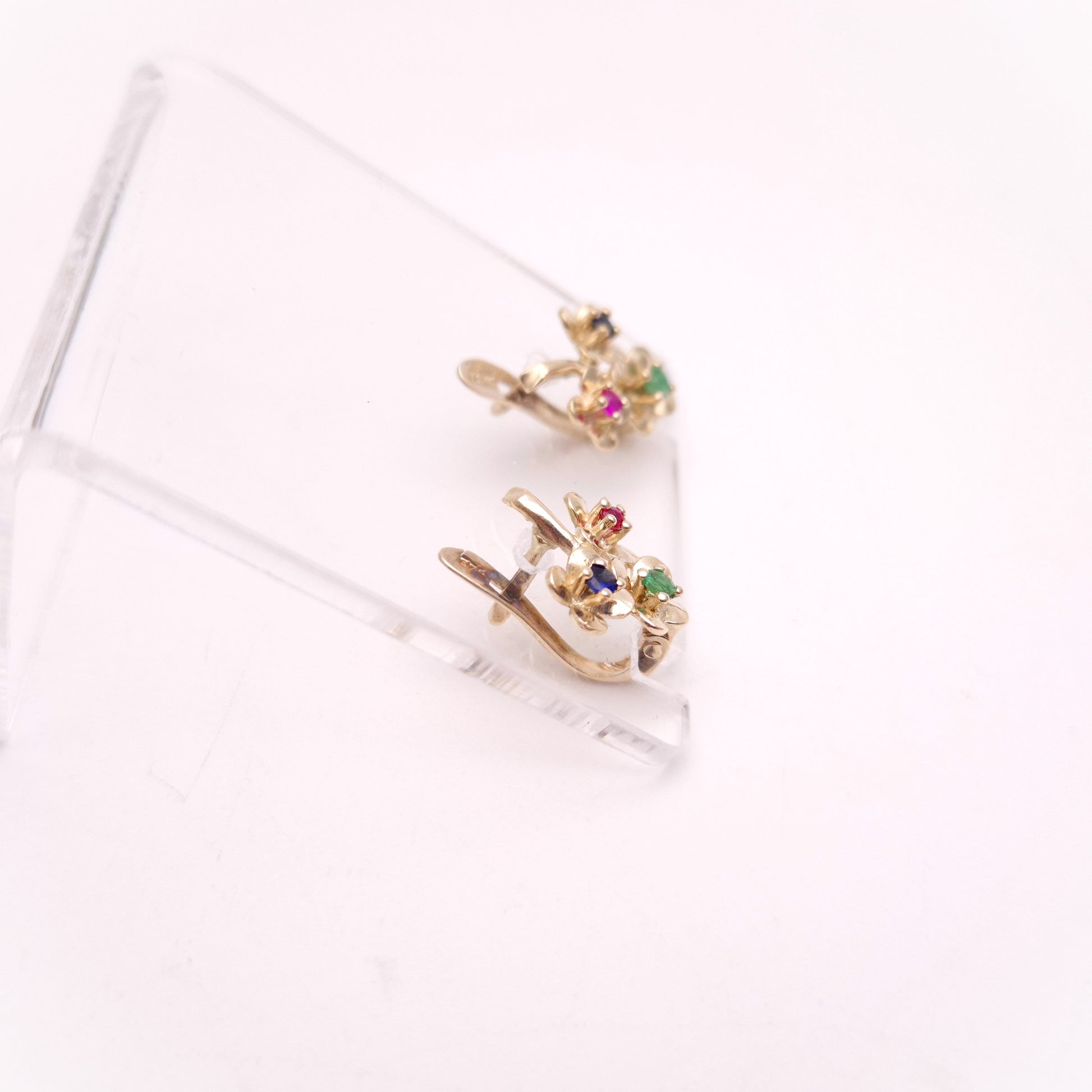 The focal point of each earring is a beautiful three-flower cluster, sculpted from polished yellow gold. Each individual flower is centred with a vibrant, round-cut gemstone, creating a captivating and colourful display. You'll find a rich ruby, a lush emerald , and a deep sapphire on each earring. This striking combination of colours makes the earrings versatile and eye-catching. The deep hues of the precious gemstones contrast beautifully with the sunny glow of the yellow gold, making them a truly joyful and elegant addition to any jewellery collection. They are a wonderful choice for those who love coloured stones, birthstone jewellery, or small, high-quality decorative pieces.