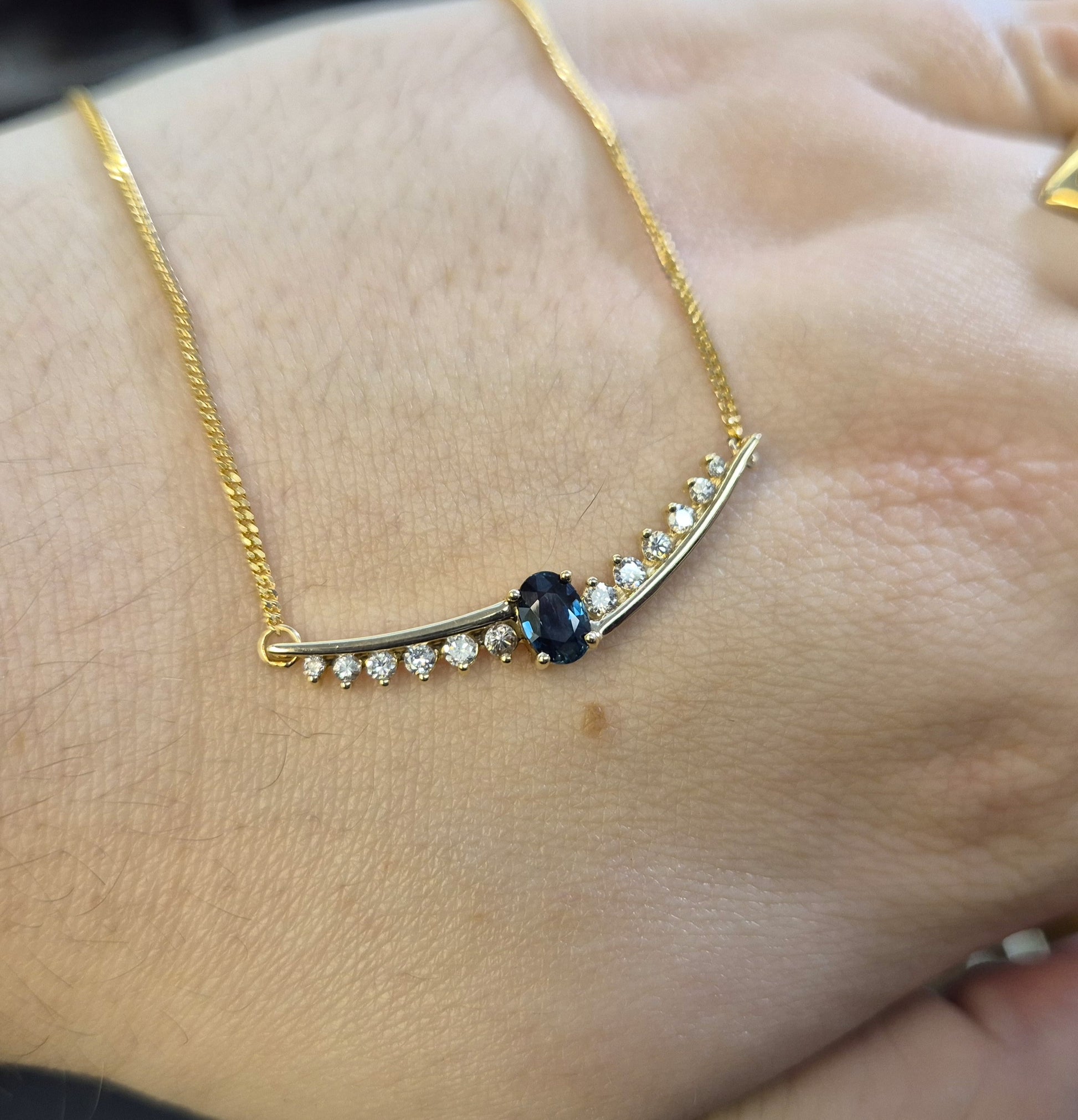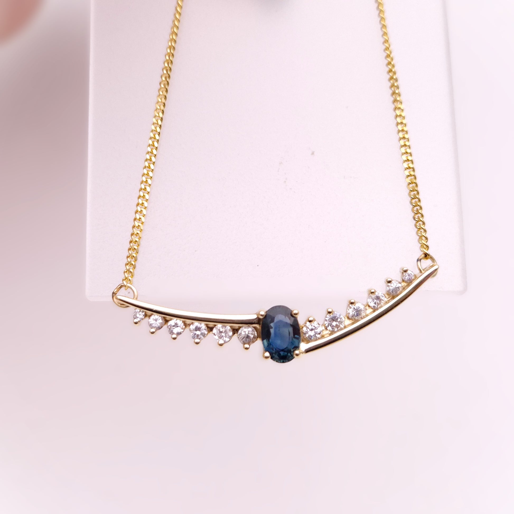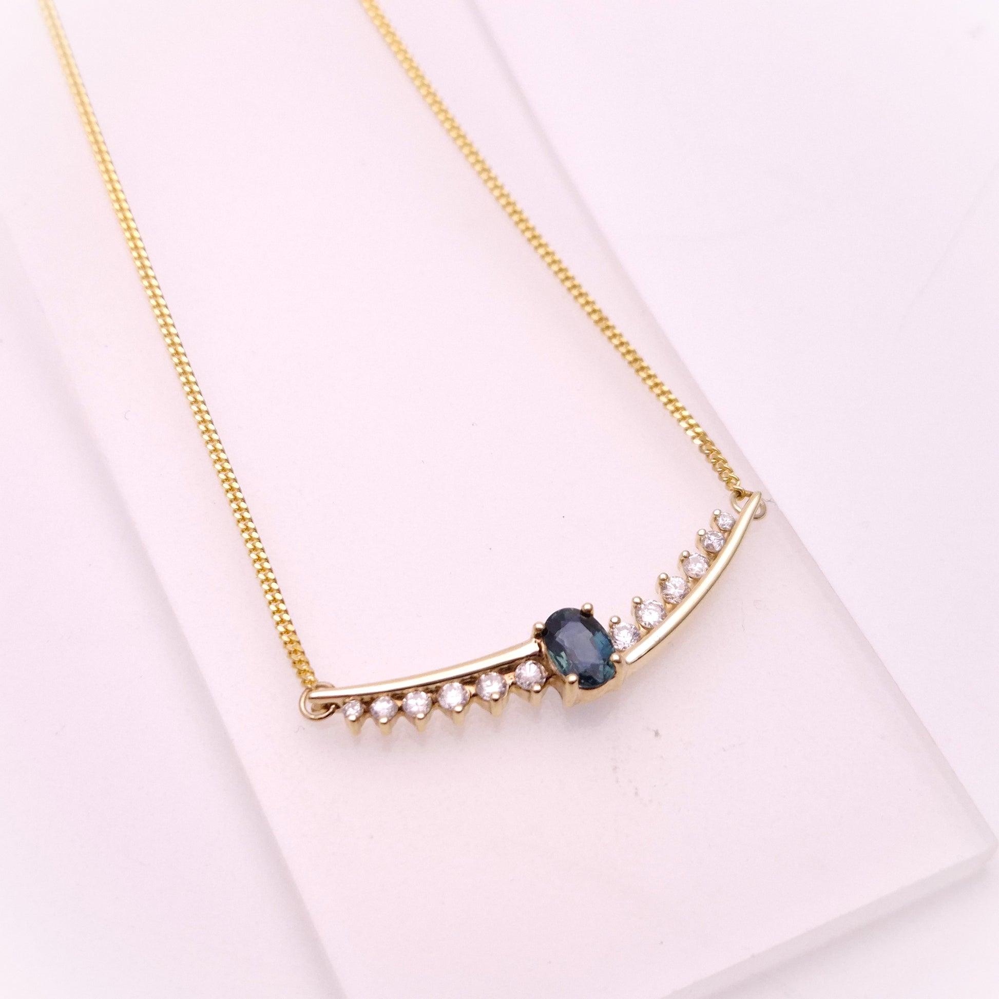 Elevate your jewellery collection with this exquisite 9ct Yellow Gold Sapphire and Diamond Curved Bar Necklace. This piece features a beautifully designed curved bar pendant, showcasing a central oval sapphire and sparkling diamond accents, creating a truly elegant and sophisticated look, attached to the central pendant section is a yellow gold fine curb chain which takes the total length of the necklace to 18 inches