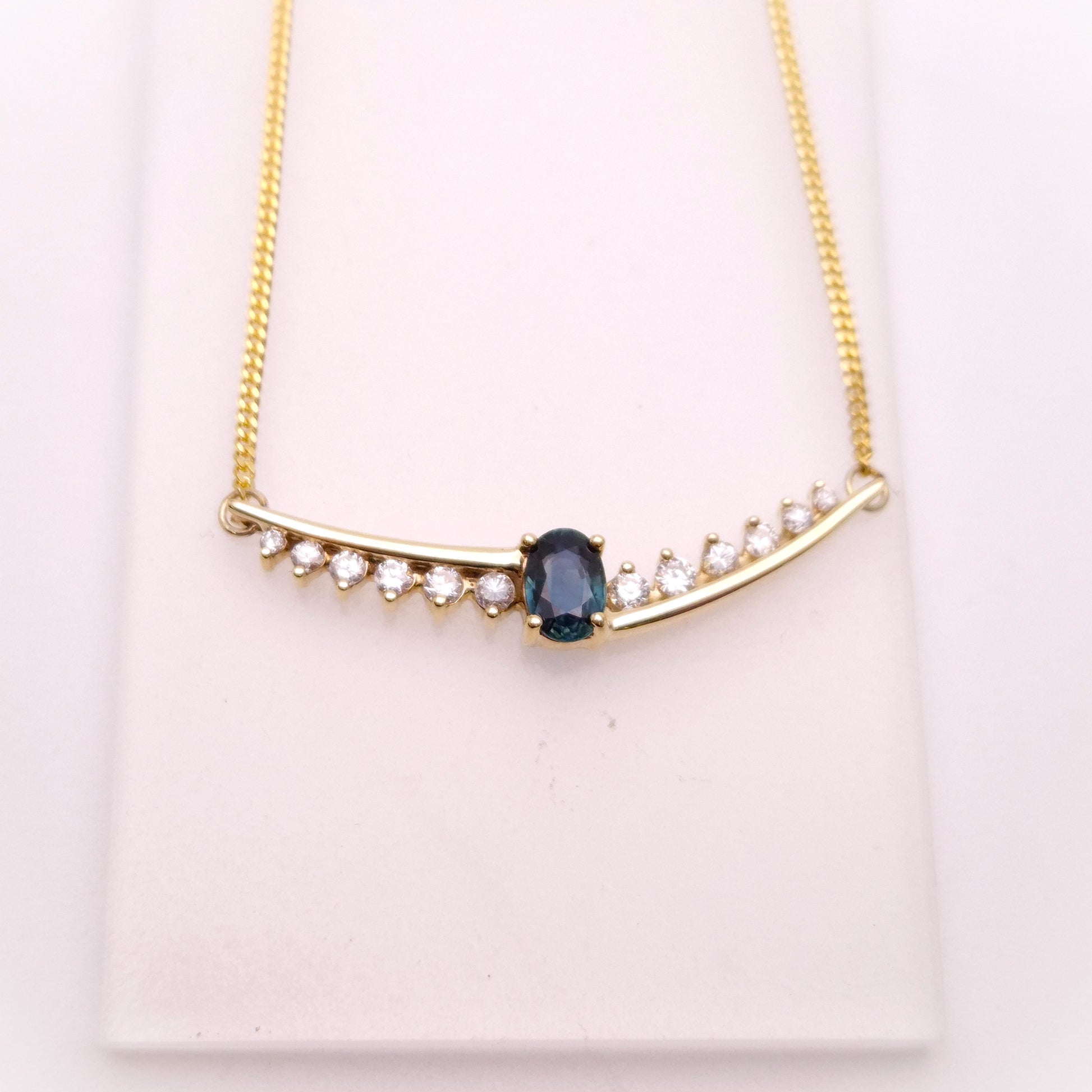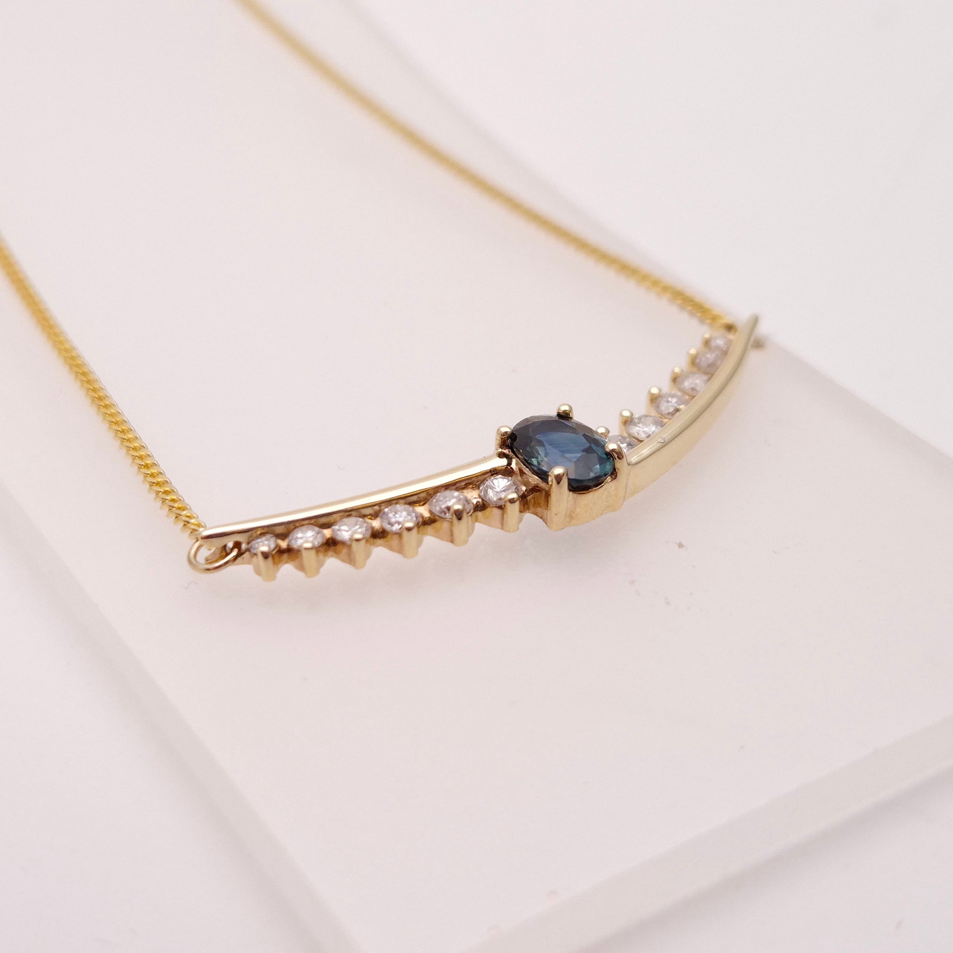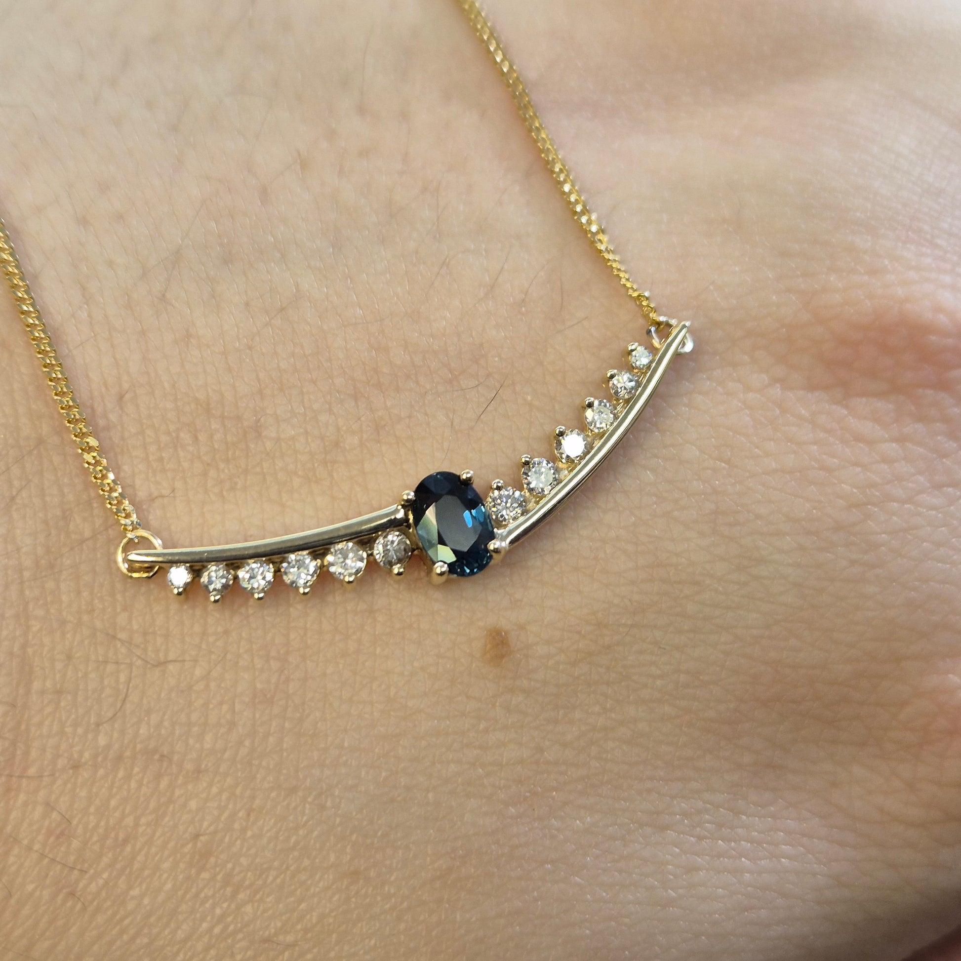 Elevate your jewellery collection with this exquisite 9ct Yellow Gold Sapphire and Diamond Curved Bar Necklace. This piece features a beautifully designed curved bar pendant, showcasing a central oval sapphire and sparkling diamond accents, creating a truly elegant and sophisticated look, attached to the central pendant section is a yellow gold fine curb chain which takes the total length of the necklace to 18 inches