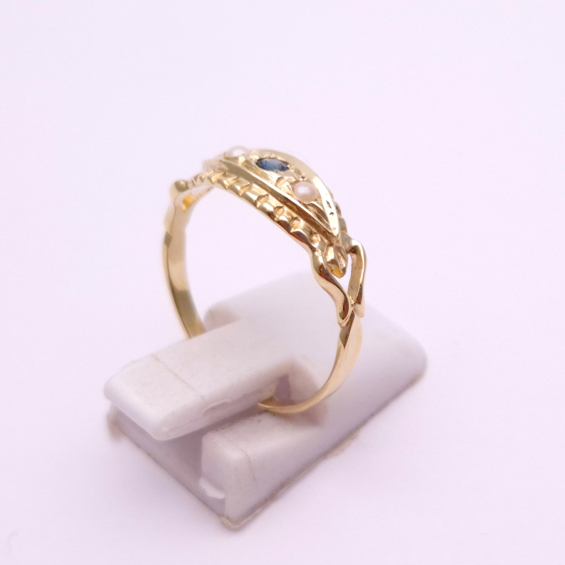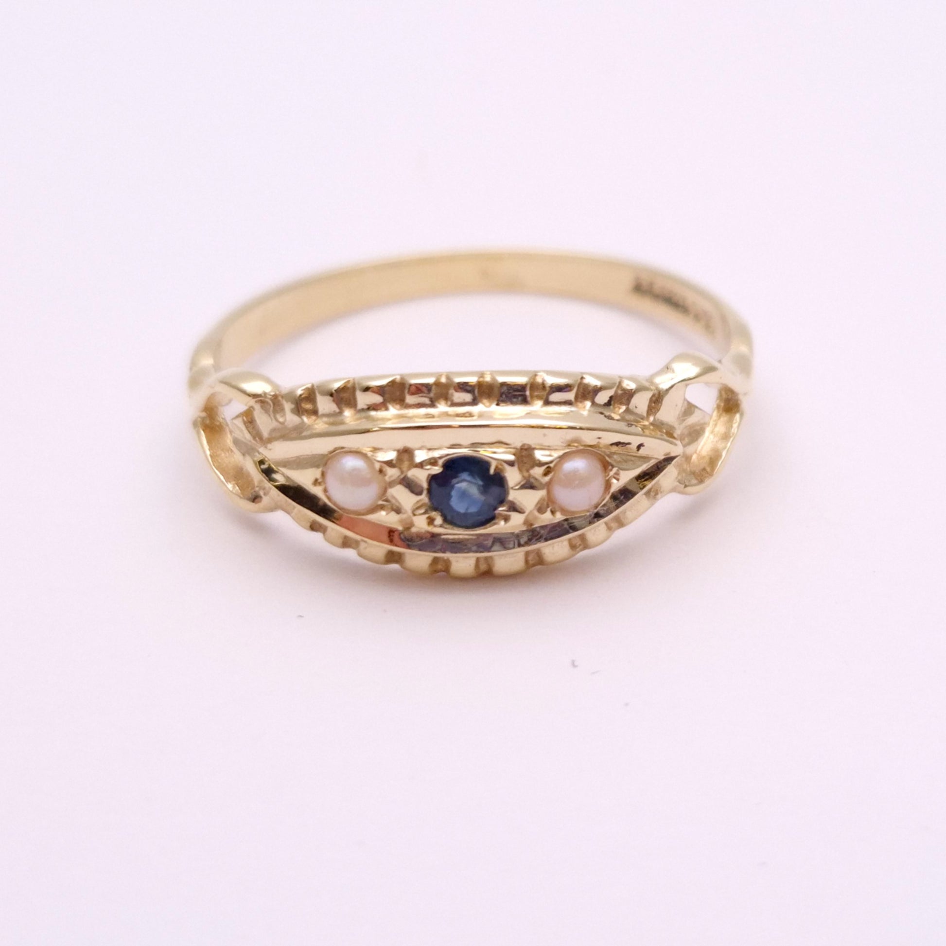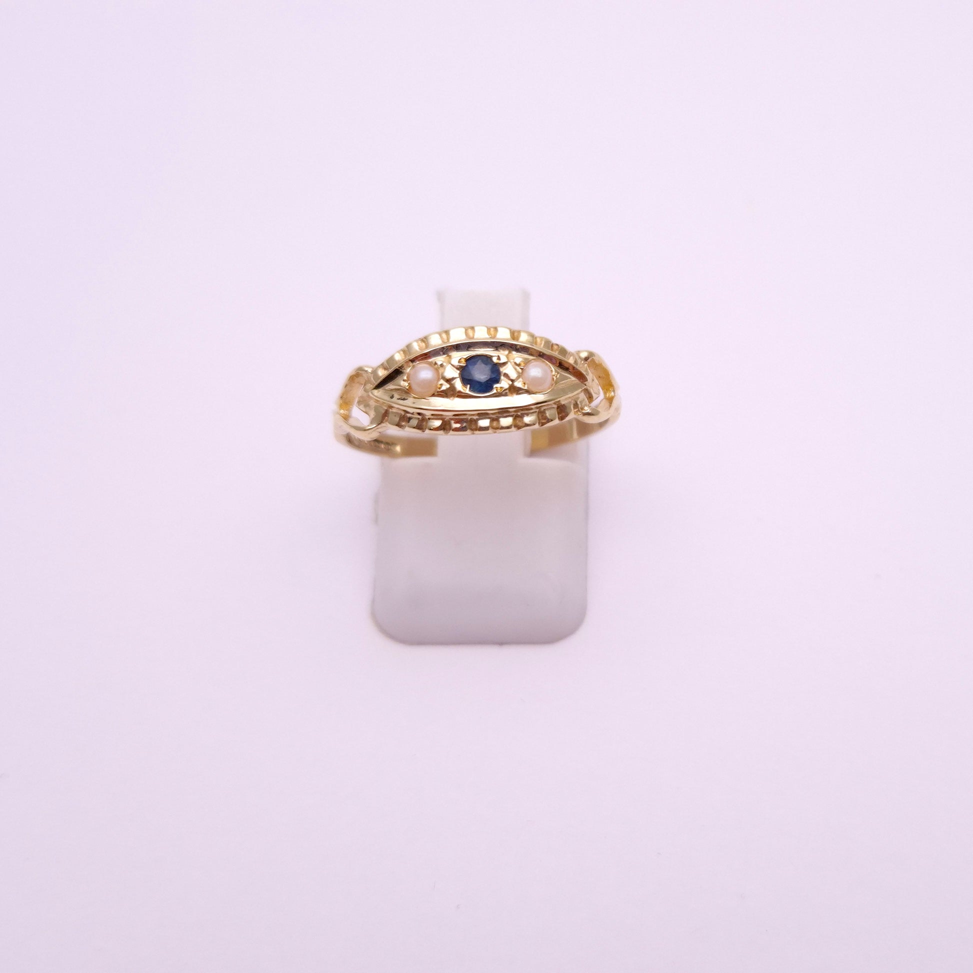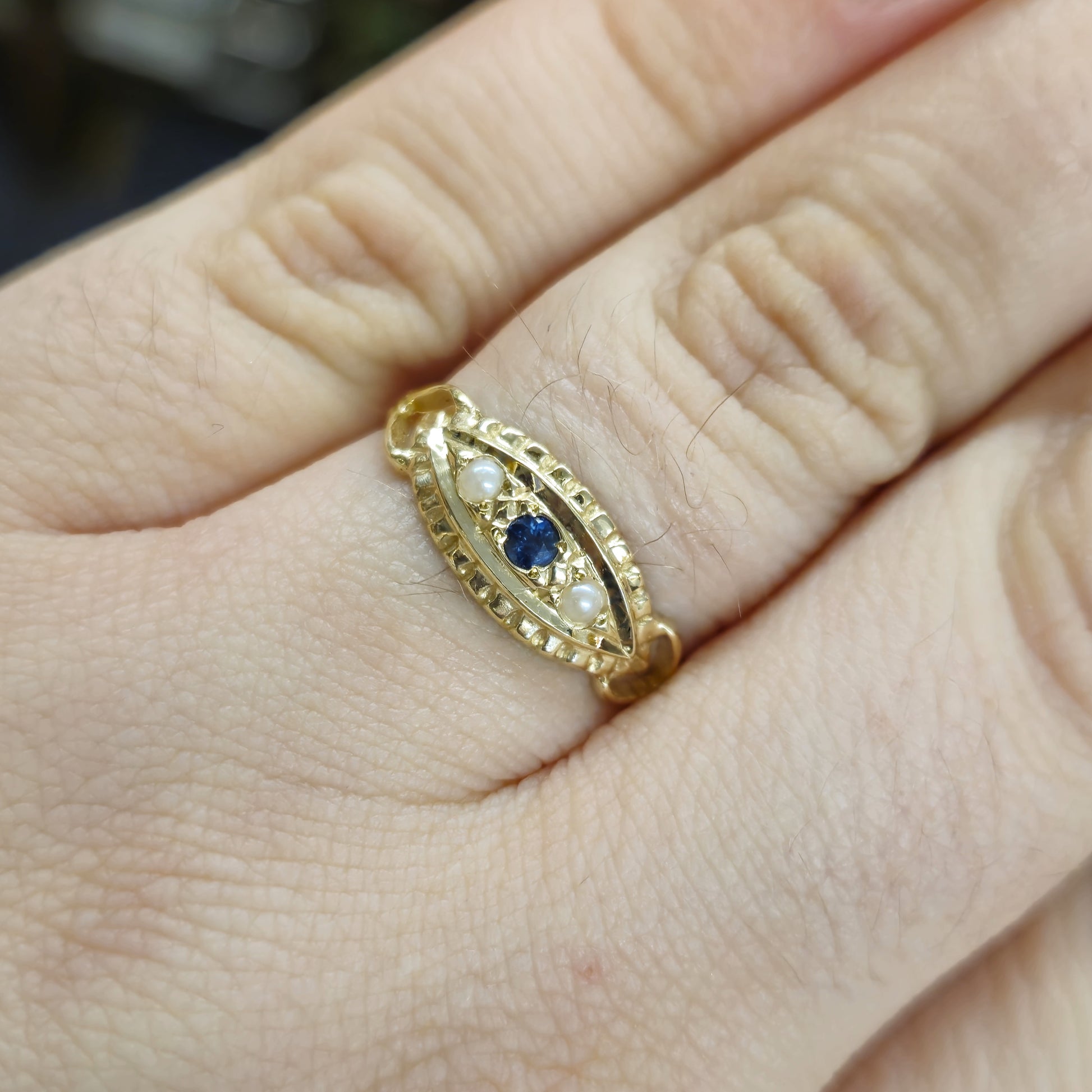 This lovely ring is a wonderful example of a repro piece made in the 90's to look like an antique piece of jewellery, The ring is made from 9ct yellow gold and is a classic boat shaped ring set with a round cut sapphire and two pearls. the shoulders have some cut out detailing and the band is plain polished gold.