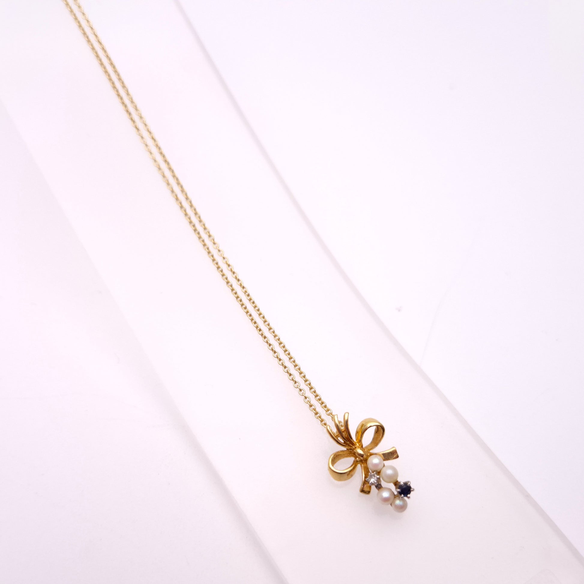 9ct Yellow Gold Sapphire , Diamond and Pearl Bow Pendant and chain Necklace