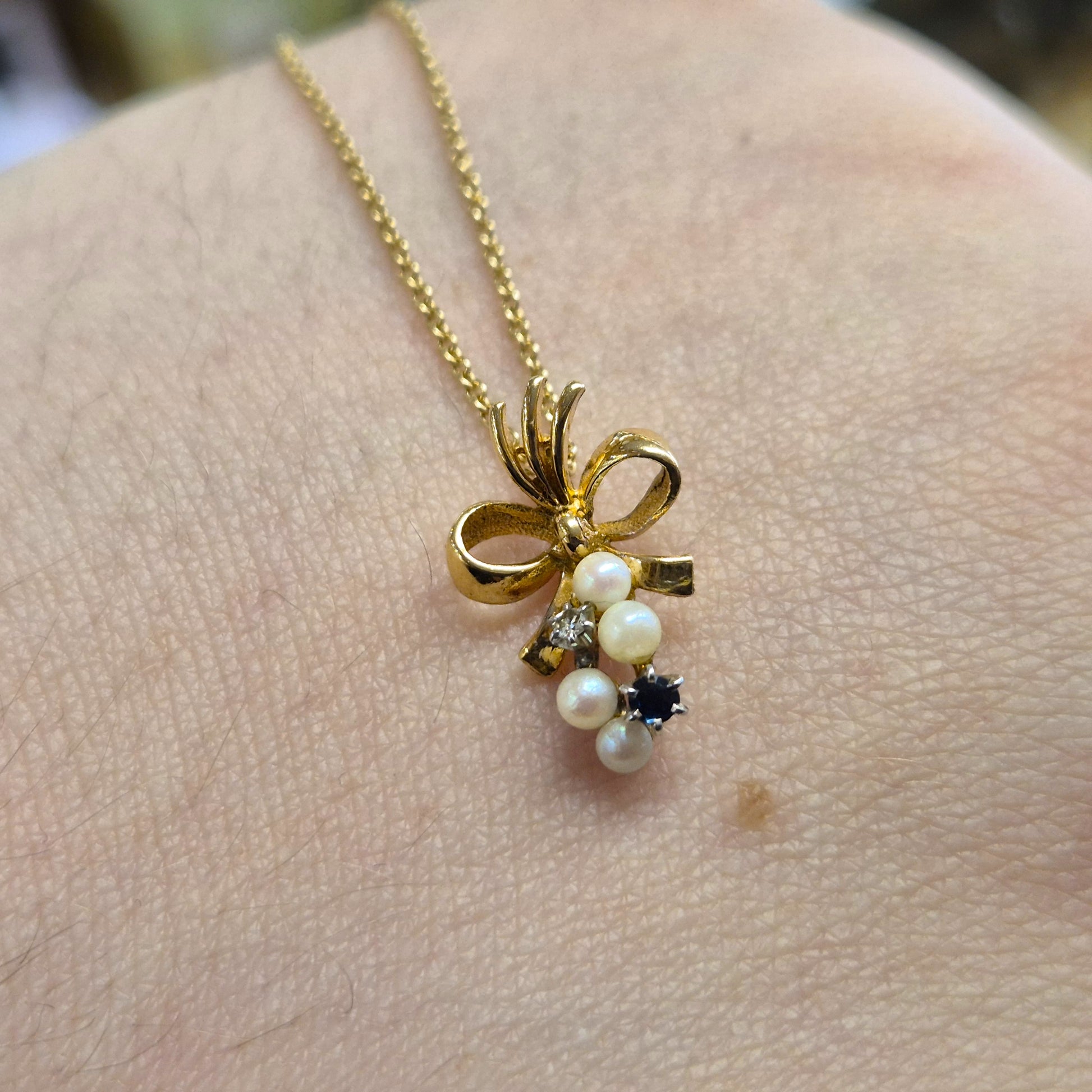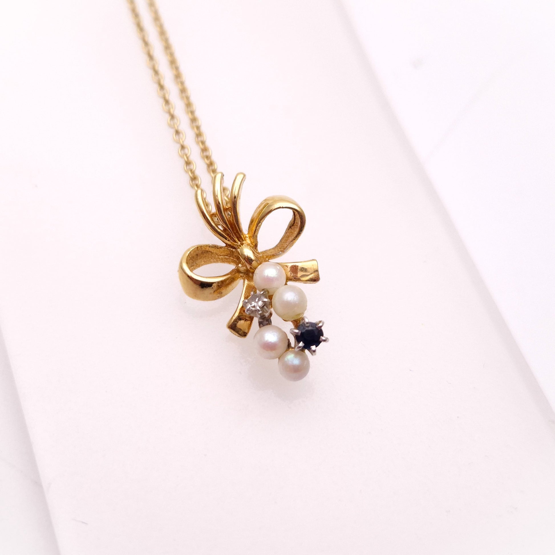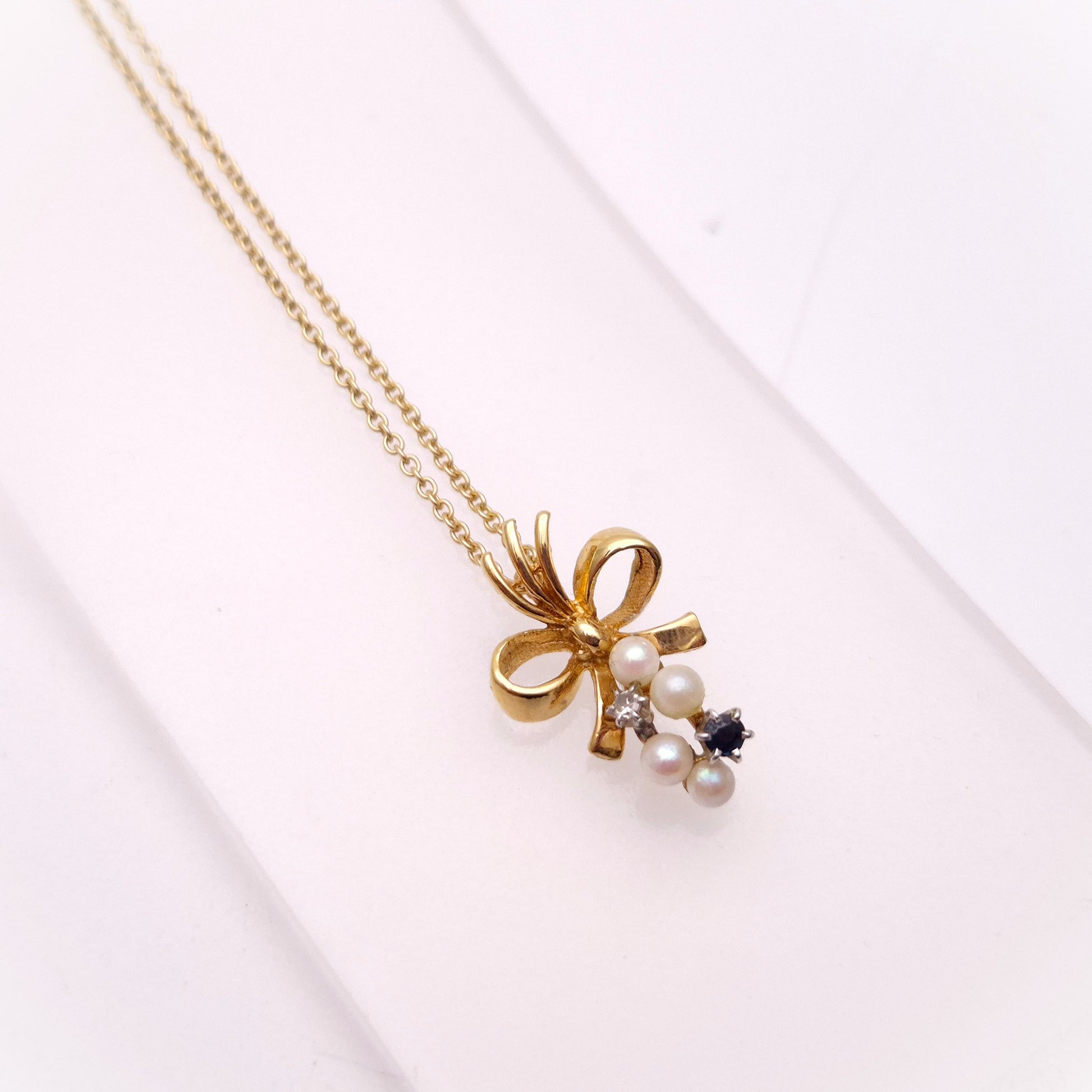 Adorn yourself with a touch of whimsical elegance with this delightful 9ct yellow gold pendant necklace. The pendant features a beautifully sculpted bow design, symbolizing grace and femininity. Nestled beneath the bow are a cluster of luminous pearls, a sparkling diamond, and a deep blue sapphire, creating a captivating combination of textures and colours.