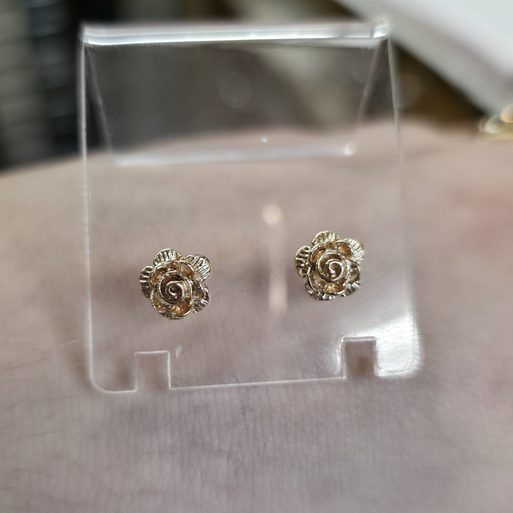 The design of these earrings is based on a beautiful, miniature flower / rose blossom. The gold is meticulously worked to create a textured, solid appearance, showcasing delicate layers and swirls to realistically mimic the petals of a flower. This textural detailing catches the light beautifully, giving the small studs a lively, three-dimensional look that is far more interesting than a simple smooth design.