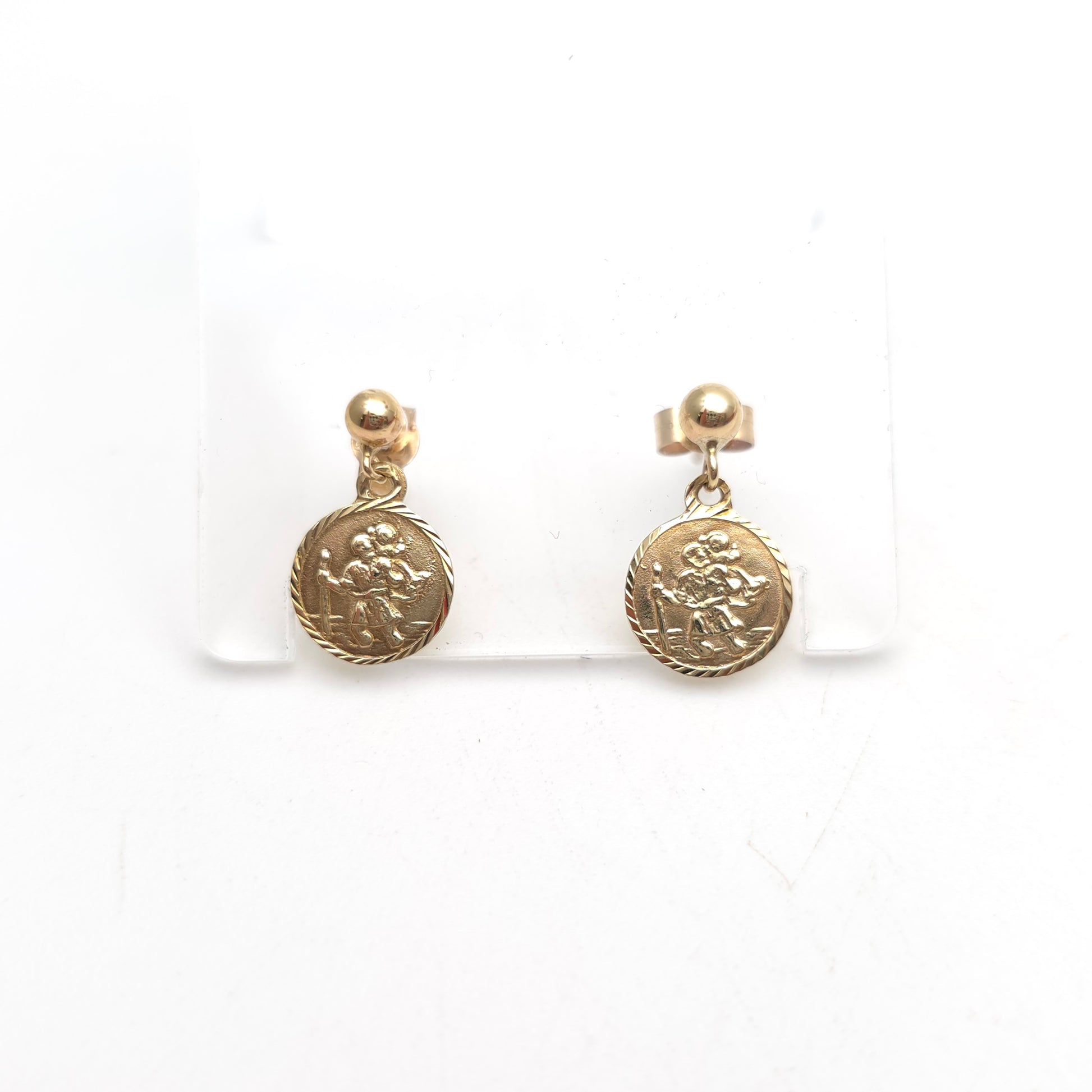 These charming 9ct yellow gold earrings feature the iconic St. Christopher medal, a timeless symbol of protection and safe travel. Designed as a delicate dangle style, each earring consists of a polished gold ball stud that suspends a finely detailed circular medallion. The medals showcase the traditional image of St. Christopher carrying the Christ child, surrounded by a classic rope-style border that adds a touch of intricate texture to the design.