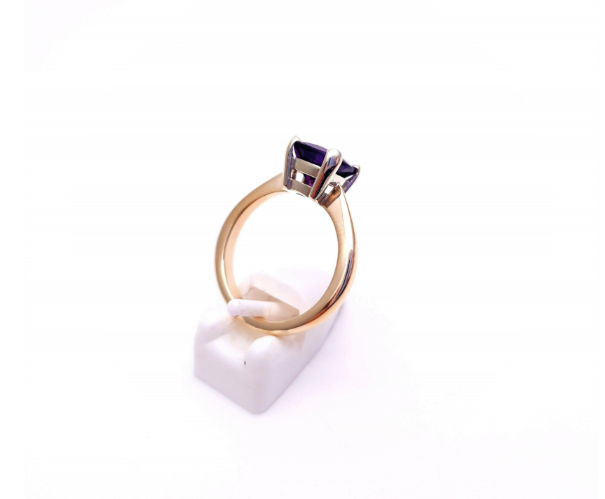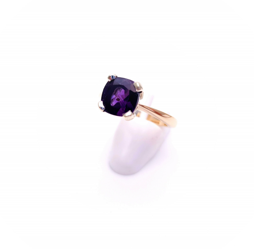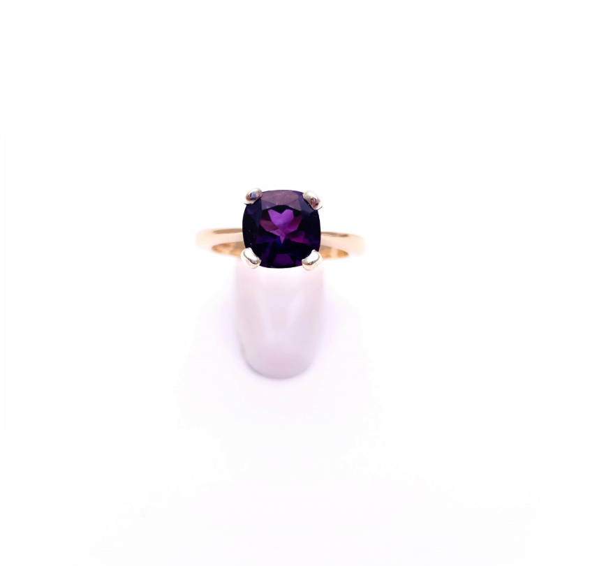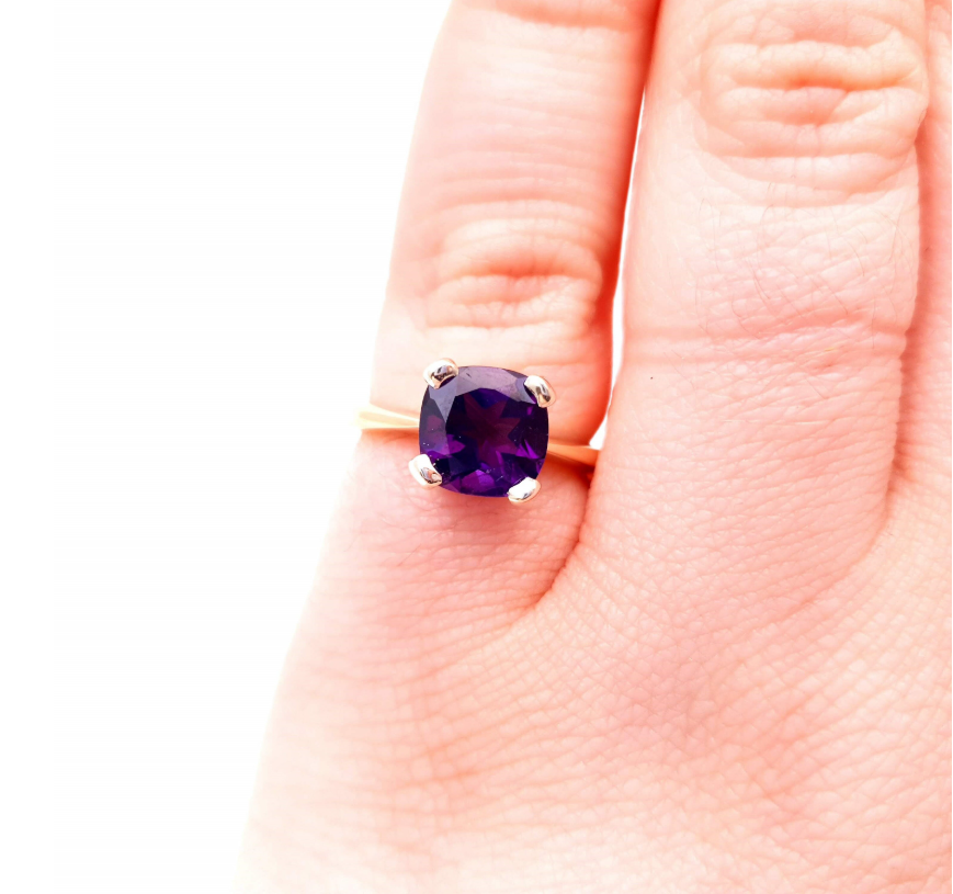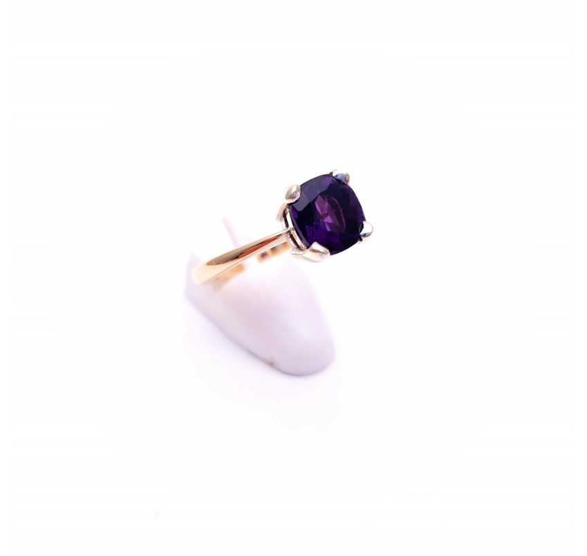 A lovely ring made from 9ct yellow gold (hallmarked to inner) featuring a square cut deep purple amethyst stone in a 4 claw setting with a plain yellow gold sturdy polished shank.