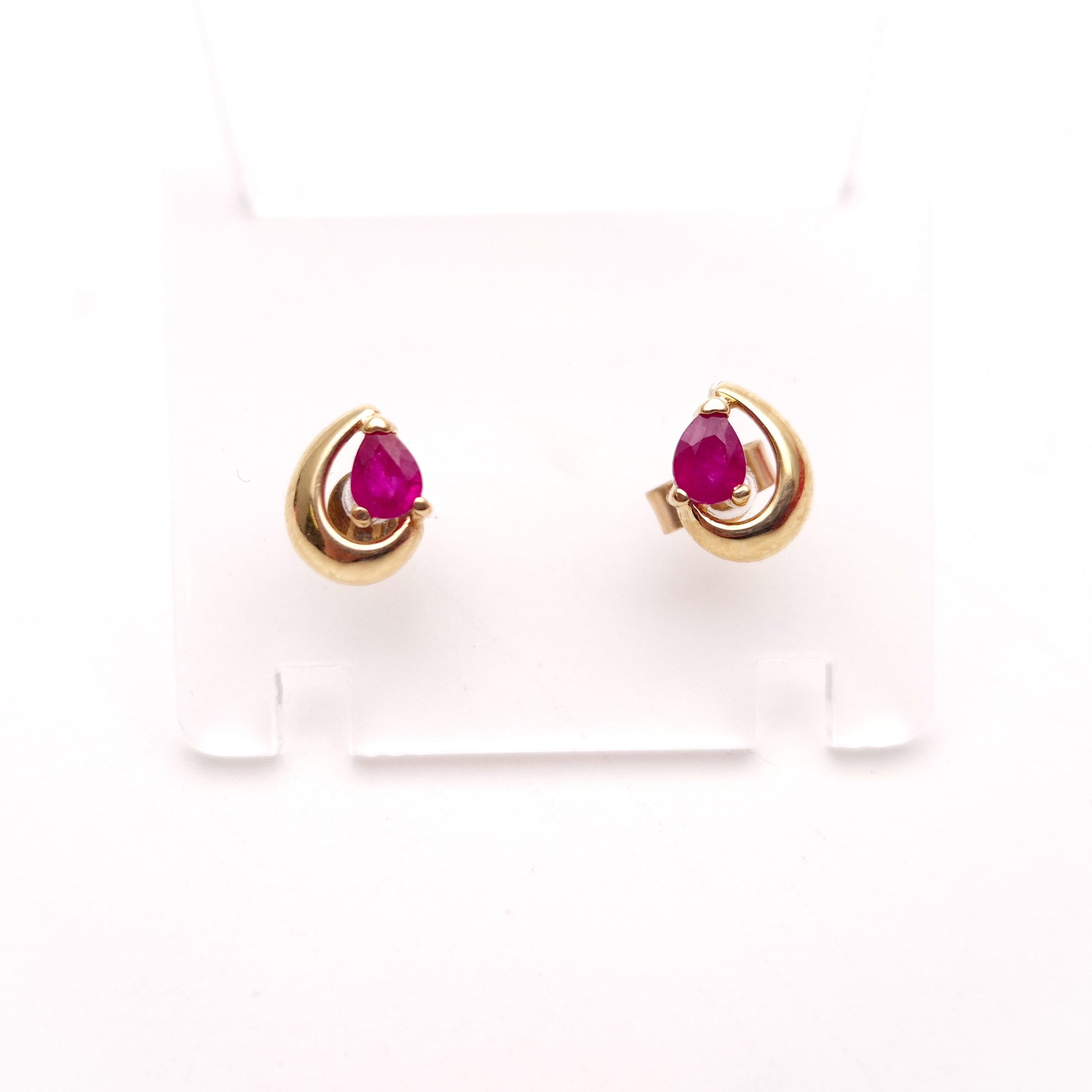 Each earring features a brilliant pear-shaped Ruby, cut to maximize its colour and brilliance. The stone is held securely within a unique openwork frame characterized by a graceful, sweeping curve of gold that partially encircles the stone, creating a sophisticated "swoop" or teardrop shape. This open setting minimizes the metal around the stone, allowing the Ruby's vibrant colour to be the focal point.
